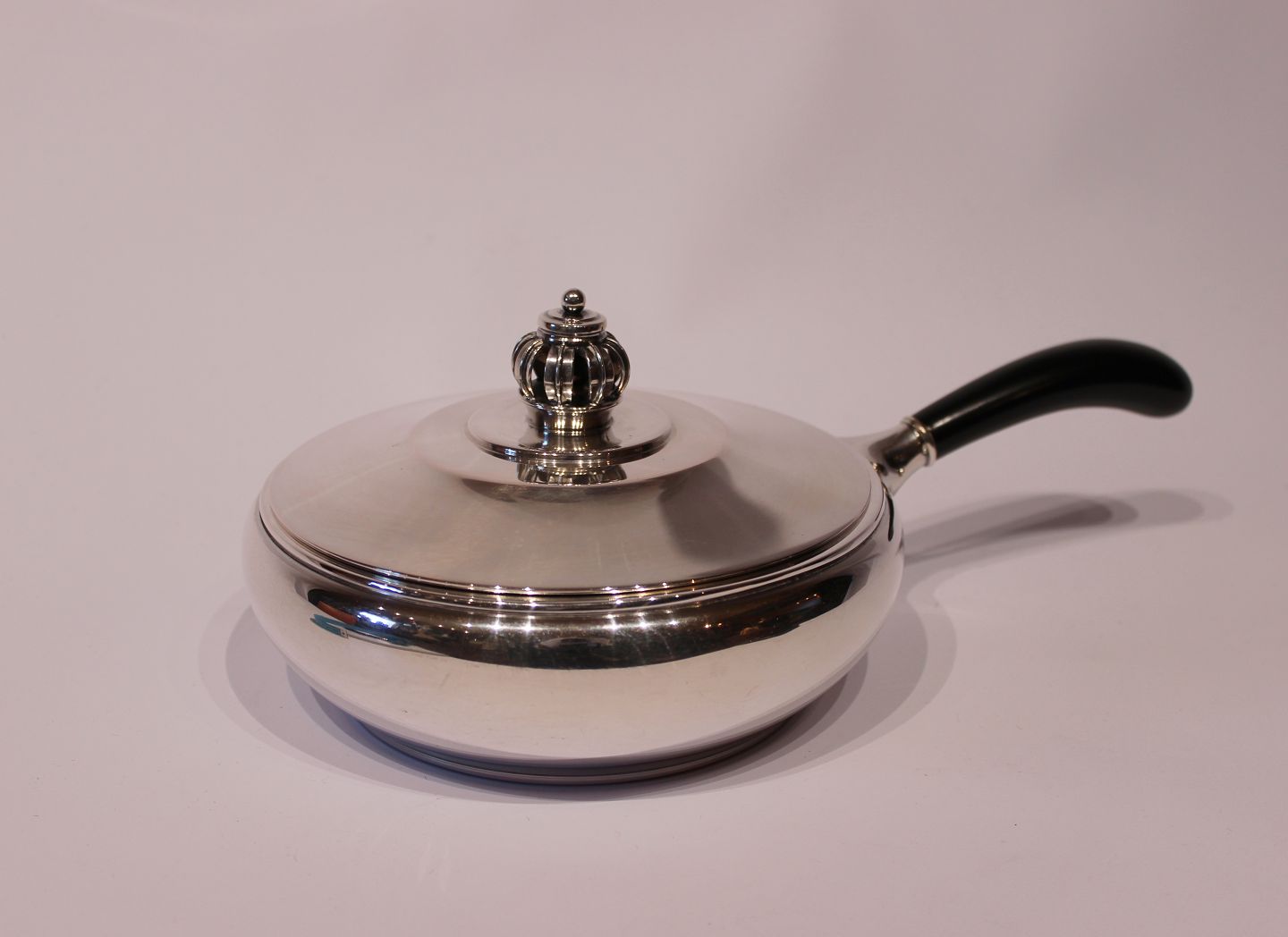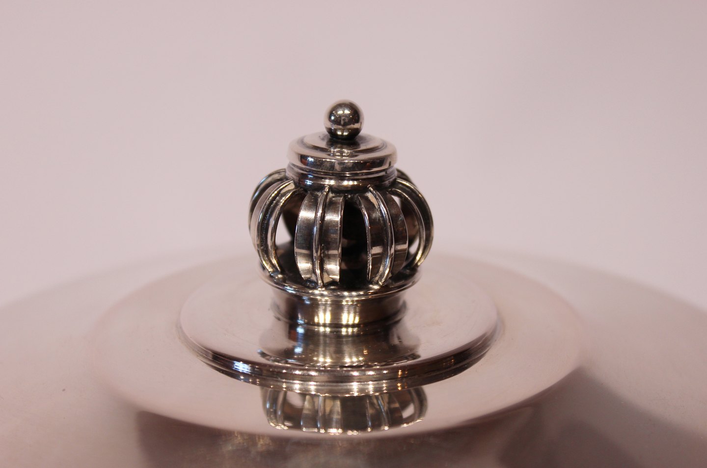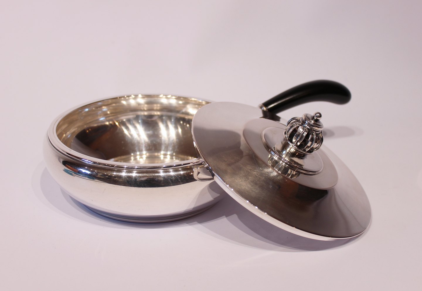 Serving bowl with lid and, ebony handle, of hallmarked silver, stamped Paul Bang.