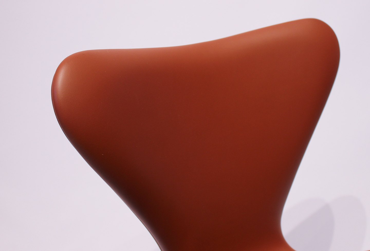 A pair of Seven chairs, model 3107, designed by Arne Jacobsen and Fritz Hansen. The chairs have recently been upholstered in cognac colored savanne leather.