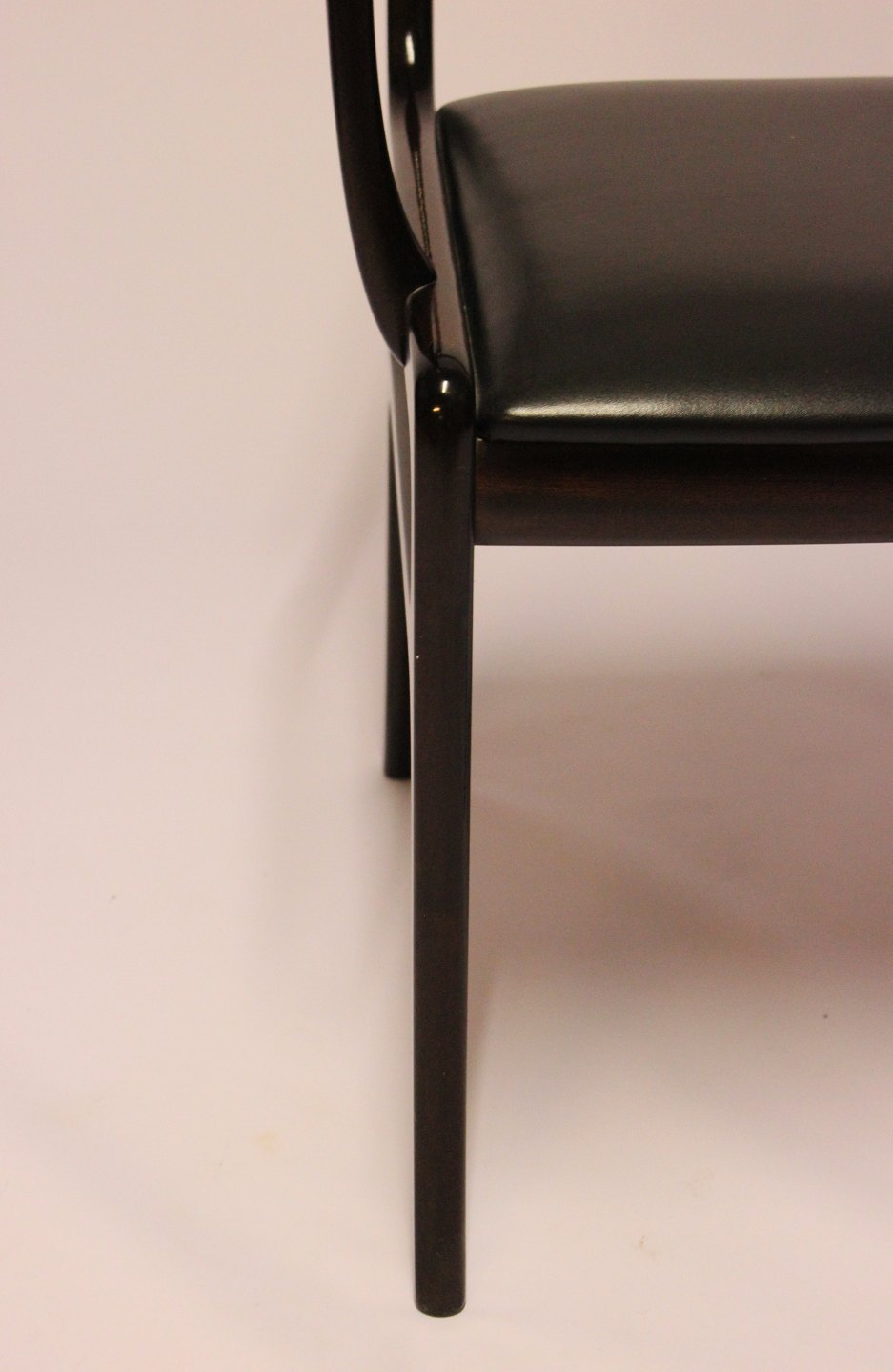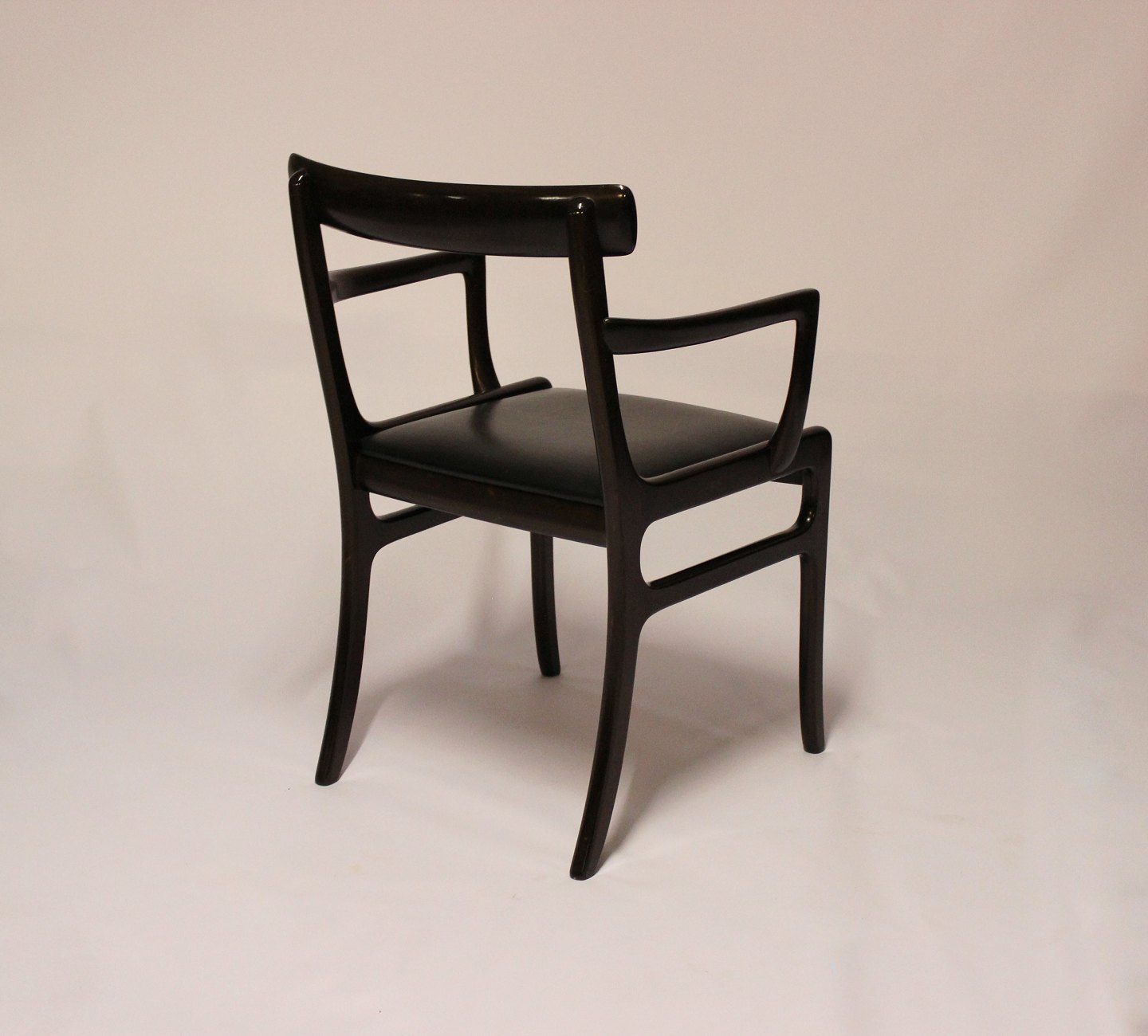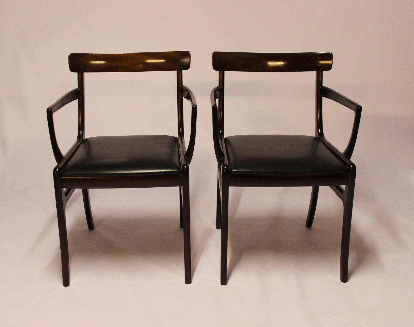 SoldA pair of "Rungstedlund" armchairs in mahogany and uppolstered in black leather, designed by Ole Wanscher and manufactured by P. Jeppesen.