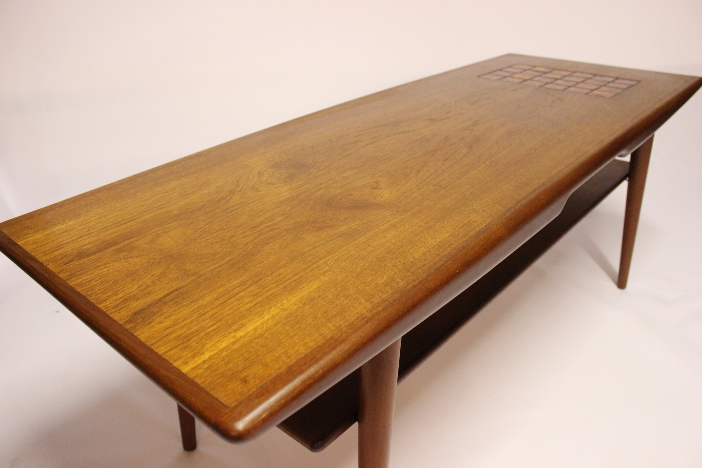 Coffee table in teak with tiles in dark colors of danish design from the 1960s.