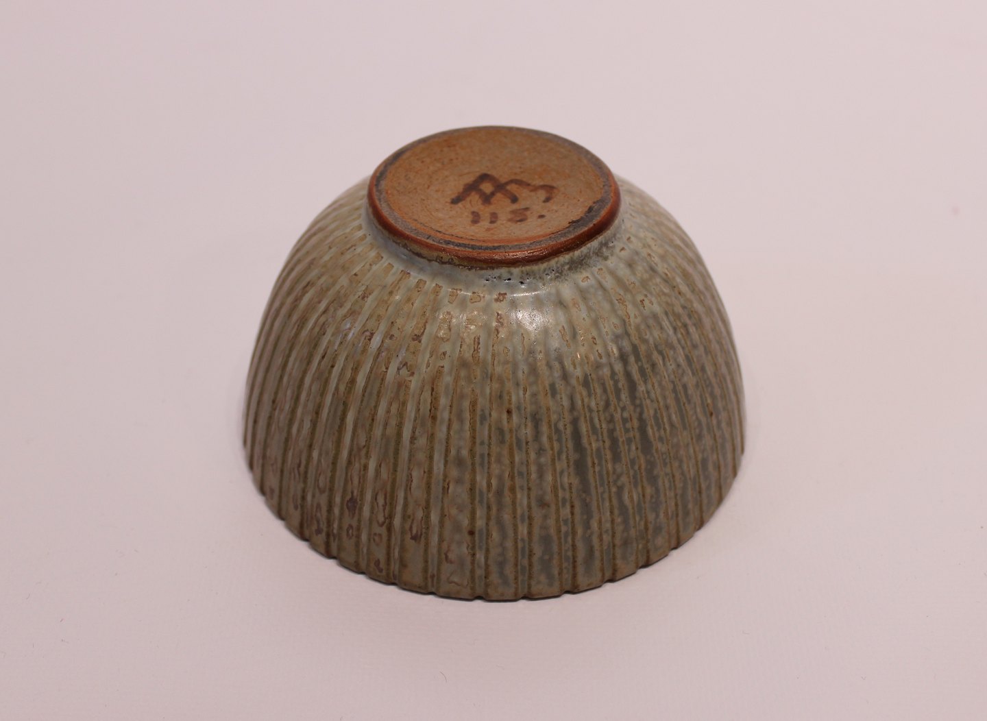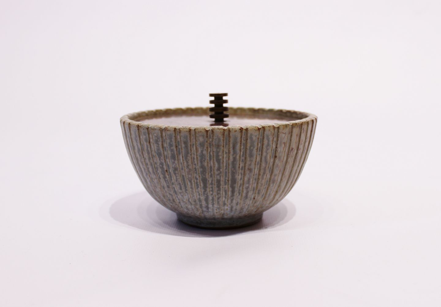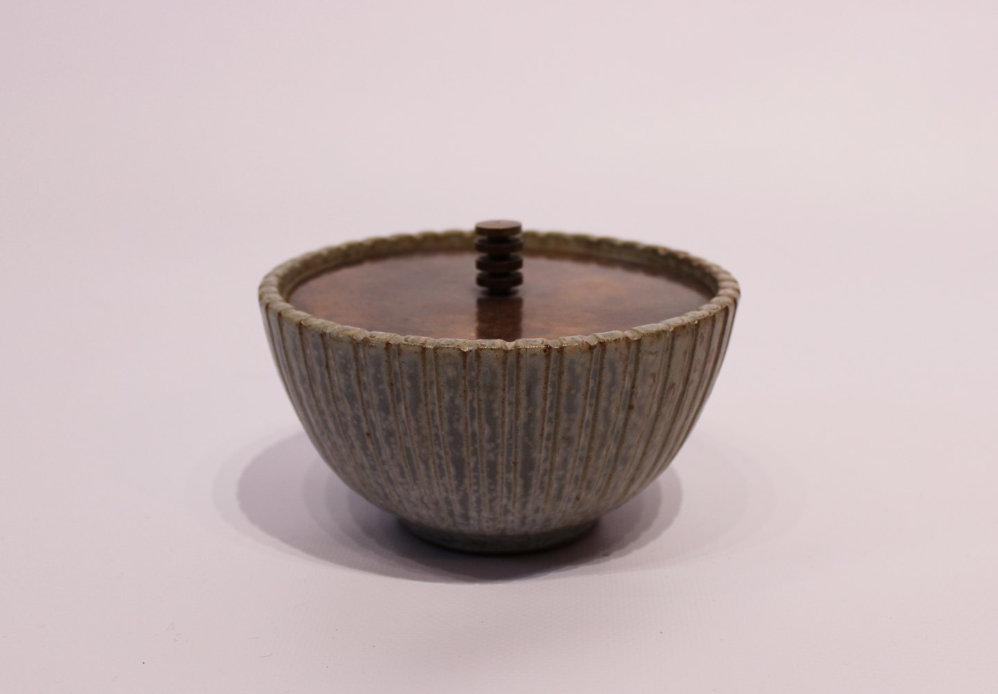 Ceramic bowl in light blue/turqouise colours and with brass lid by Arne Bang. The bowl is in perfect vintage condition and numbered 118.