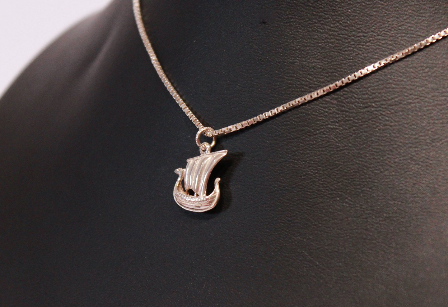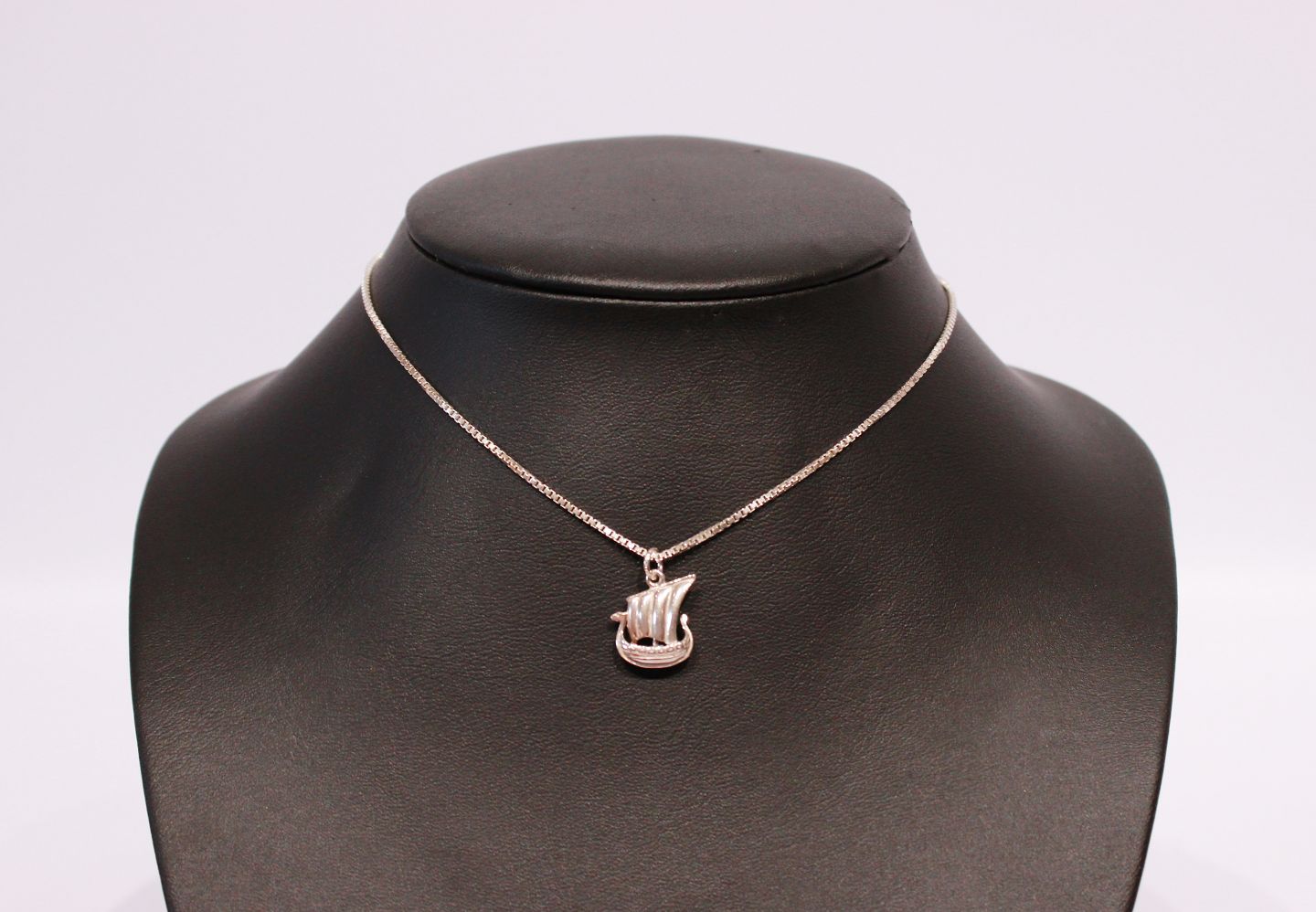 SolgtLille vedhæng i form af vikingeskib i sølv. Lignende kæde kan tilkøbes separat.