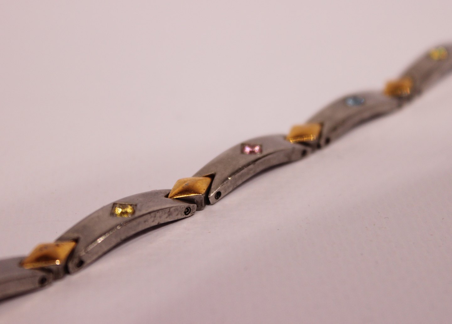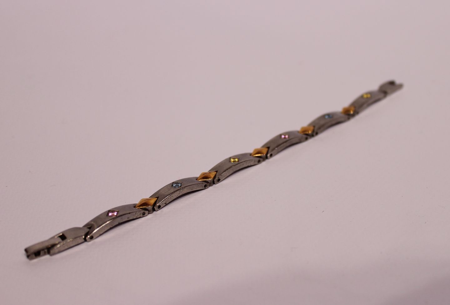 Armkæde med farvet sten, af stål og stemplet Inox.