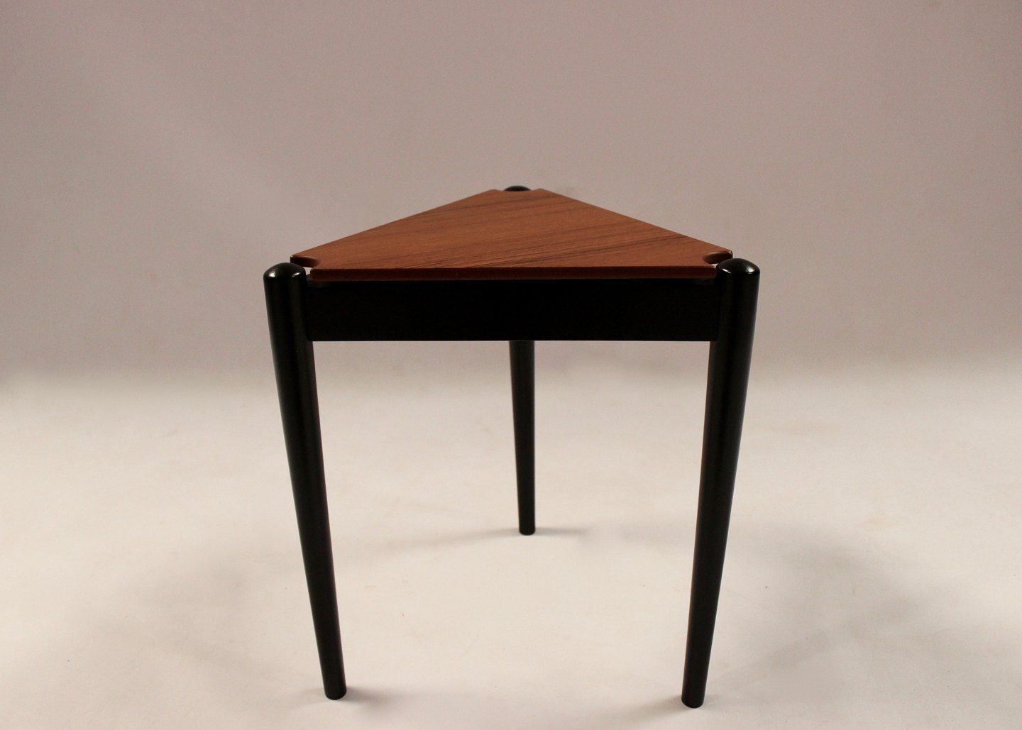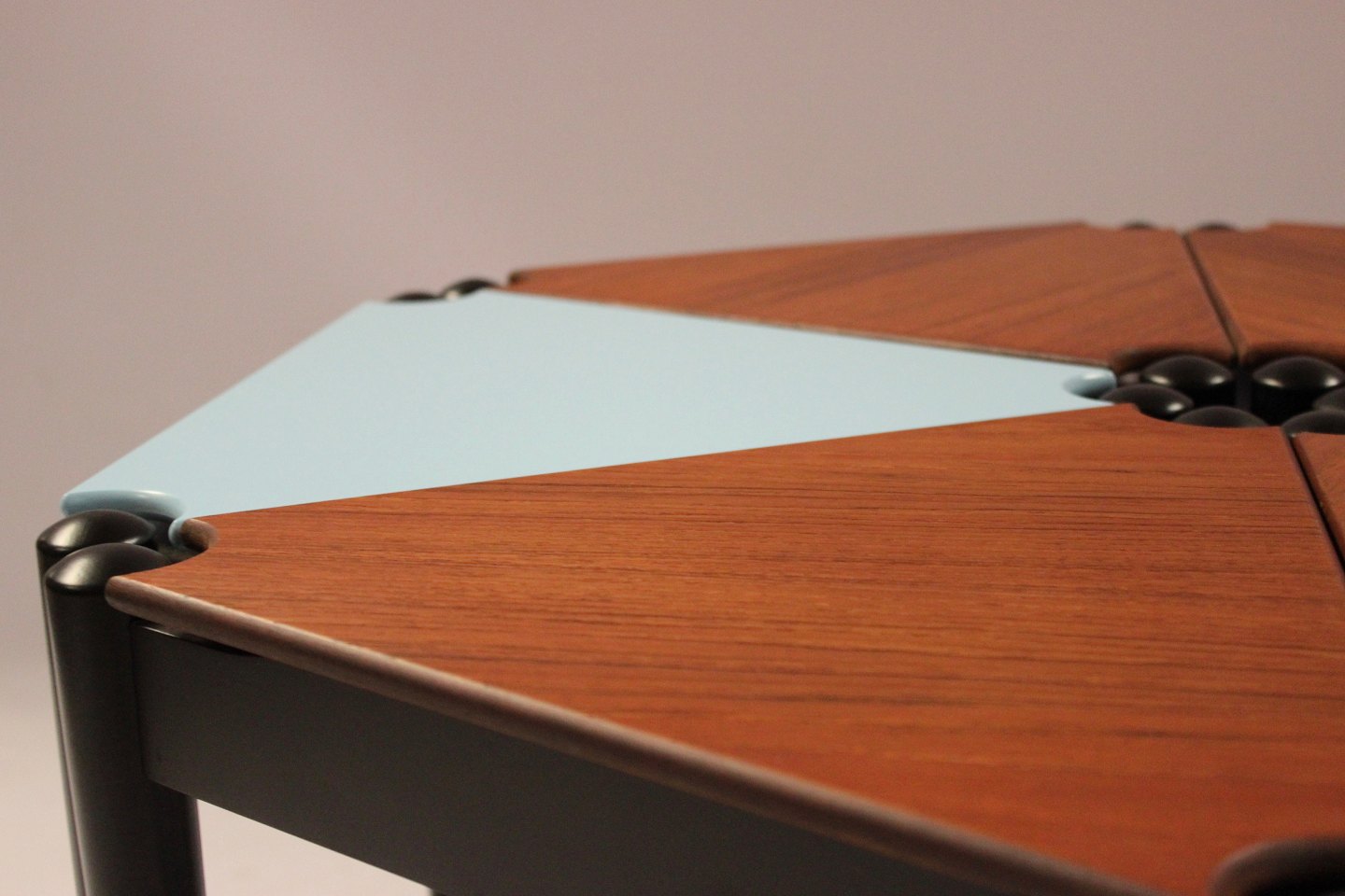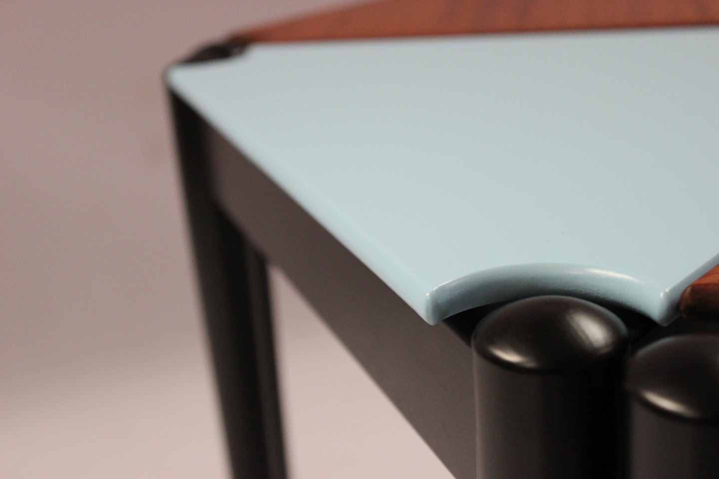 Sofabordet, bestående af 6 trekantede sideborde i teak og blålakeret træ med sorte malede ben, designet af Helge Møller i 1980'erne, udstråler en unik og moderne æstetik, der fanger øjet.