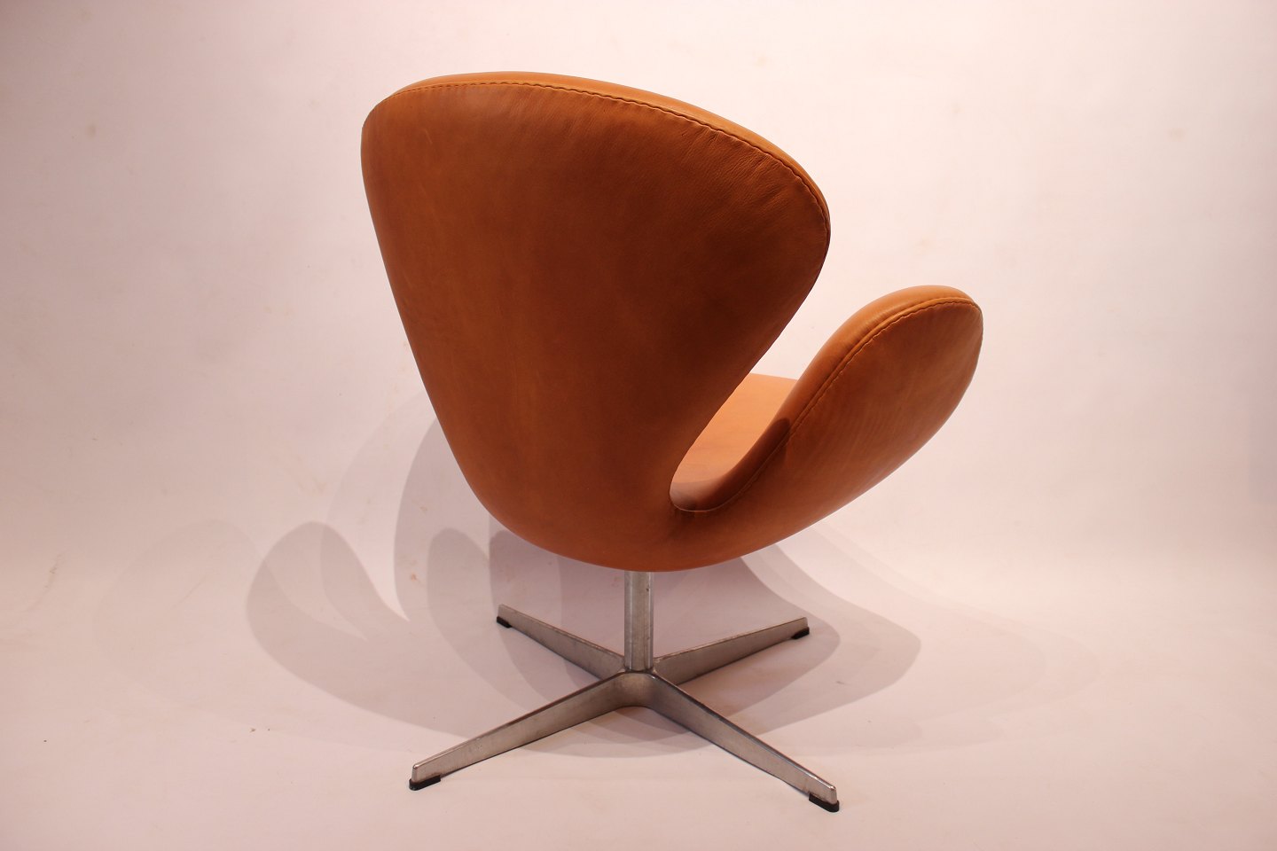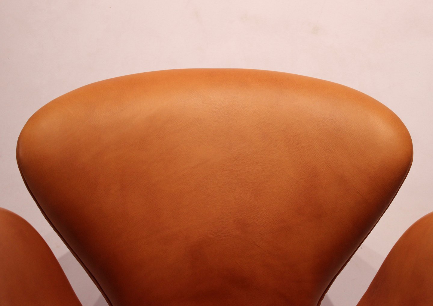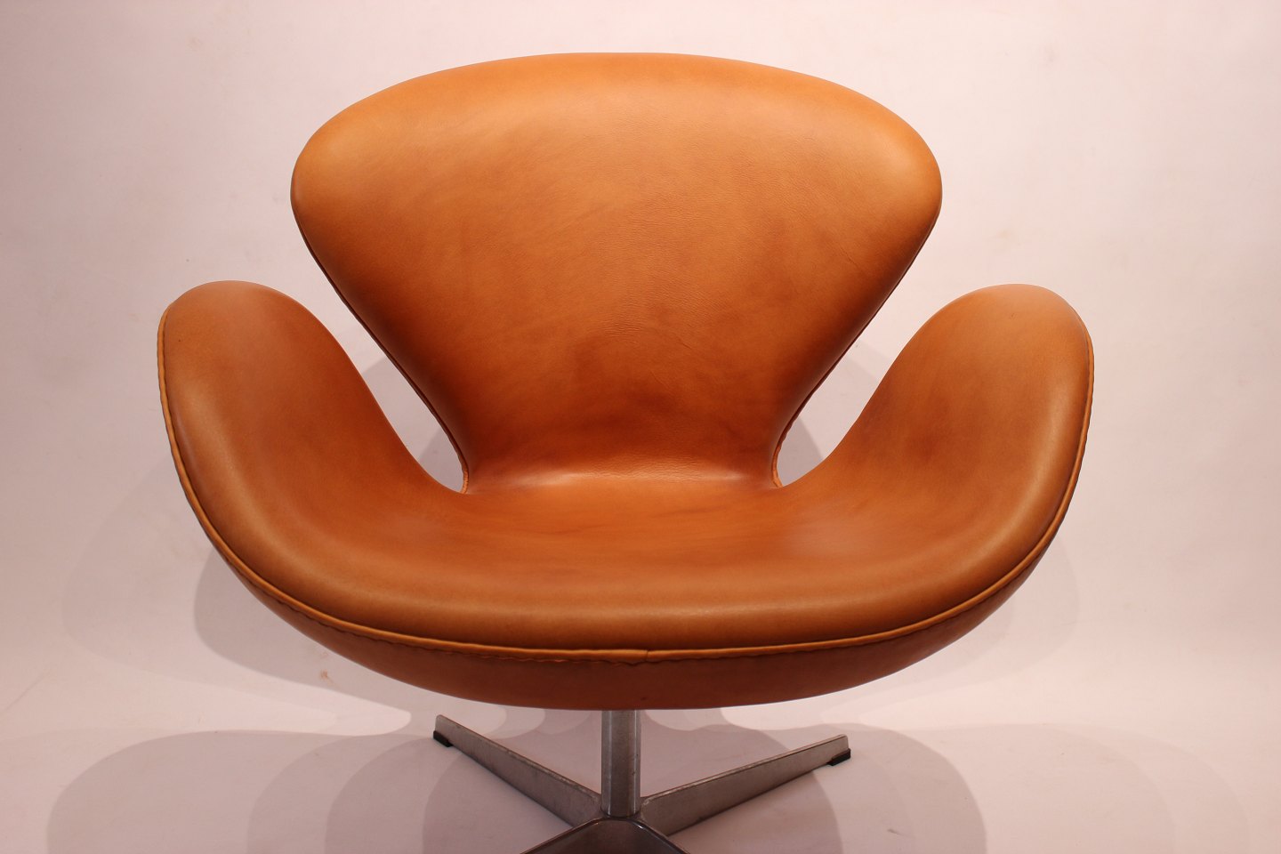Den polstrede version af Svane stolen, som du nævnte, er betrukket med cognac læder, hvilket tilføjer en luksuriøs følelse og varme til ethvert rum. Polstringen giver også en behagelig siddeoplevelse, der gør stolen ideel til både lounging og arbejde.