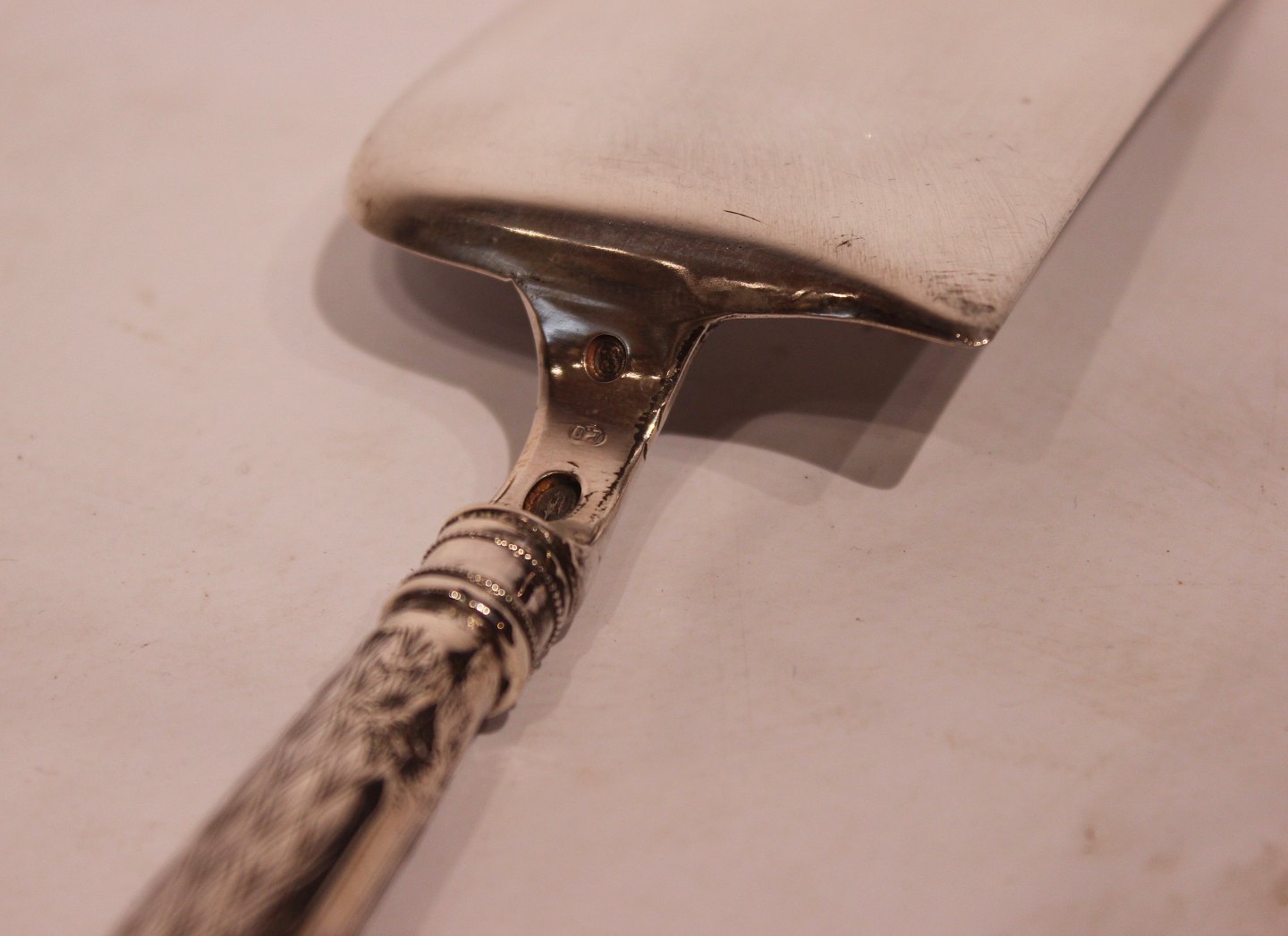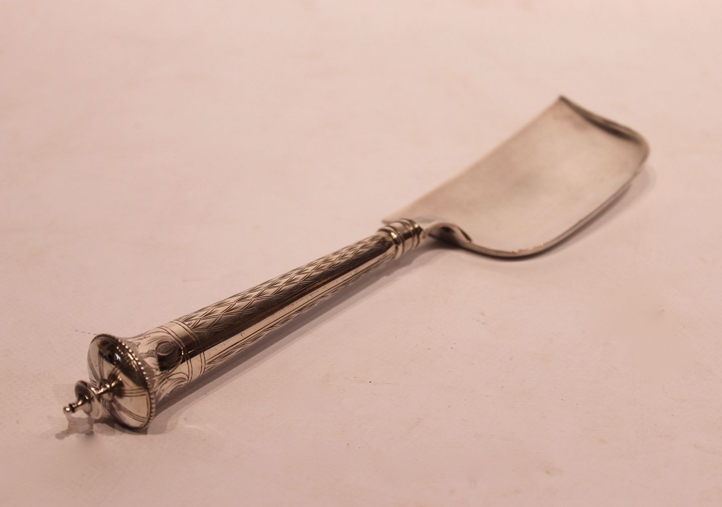 Serverings/fiske spade med rundt håndtag af andet mønster og tretårnet sølv.