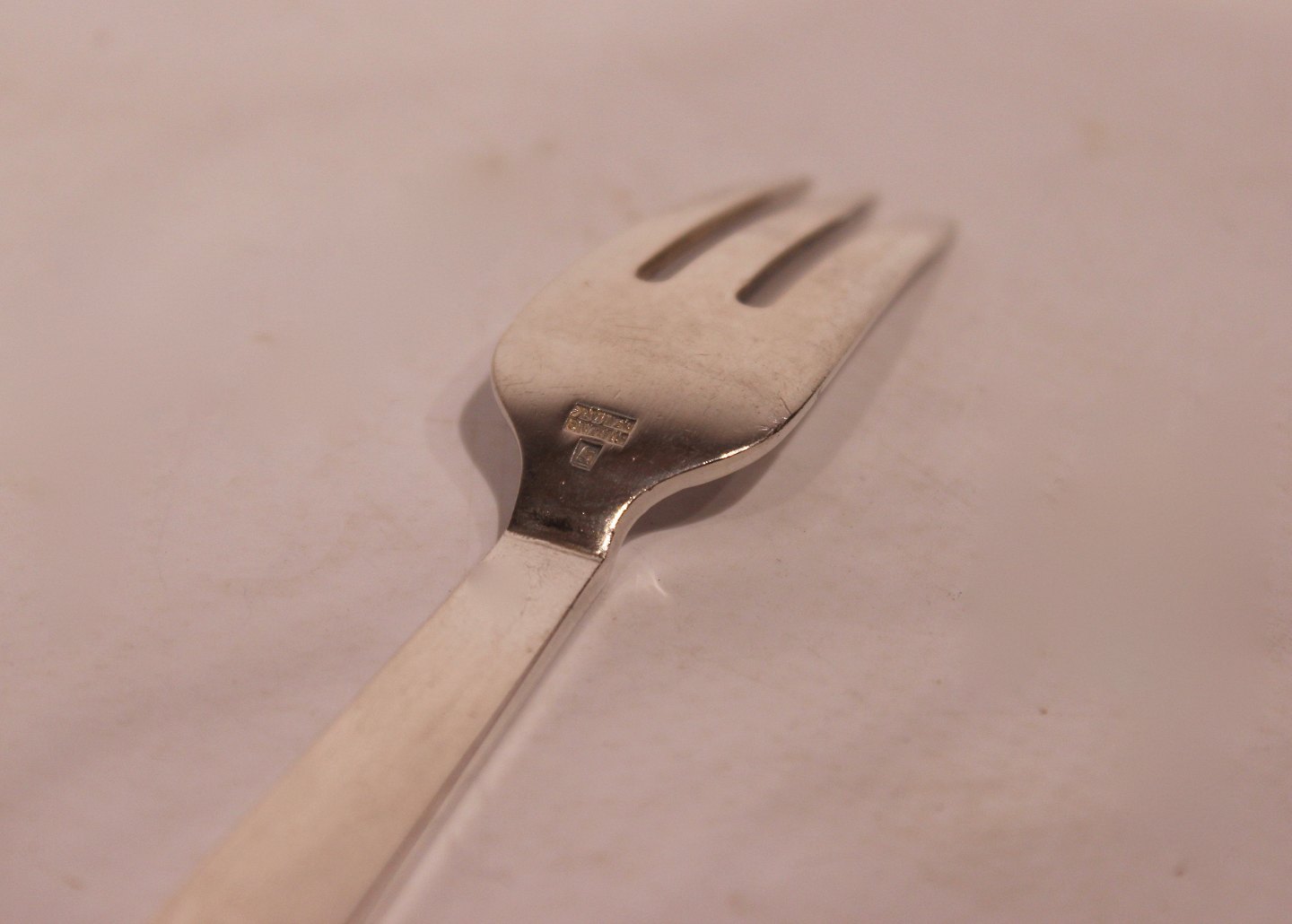 View the price in the text descriptionLunch fork and cake fork in the Rune pattern by Georg Jensen and three-towered silver.