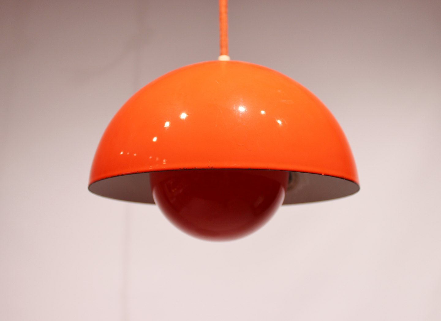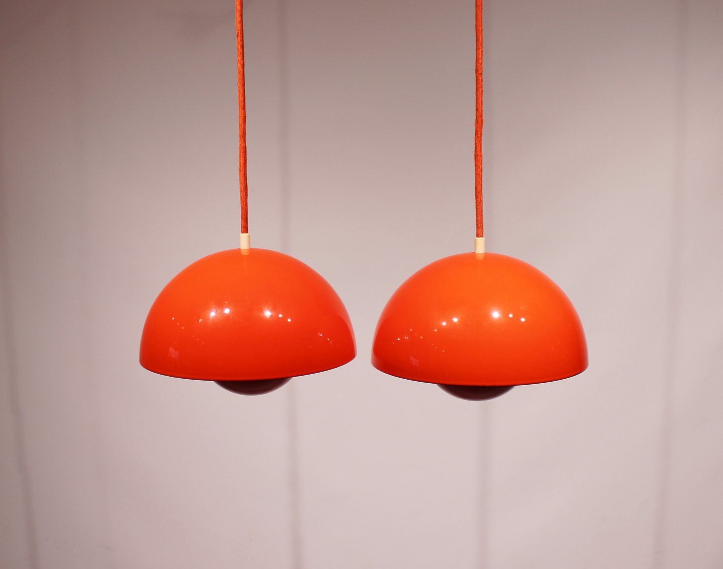SoldA pair of Flowerpot, model VP1, pendants in orange designed by Verner Panton in 1968 and manufactured in the 1970s. The lamps are in great vintage condition.