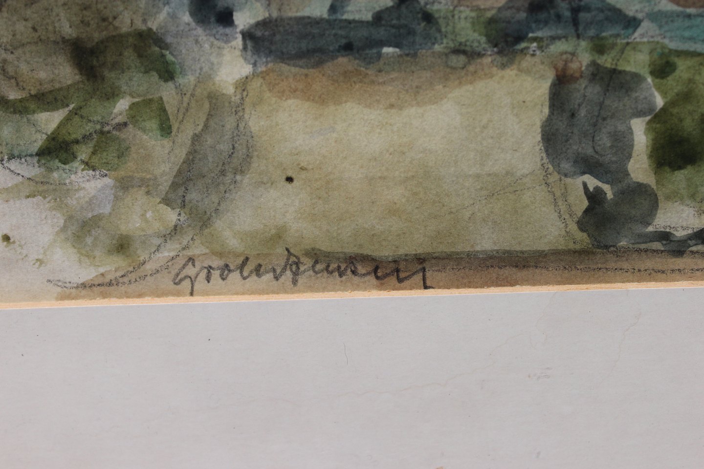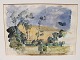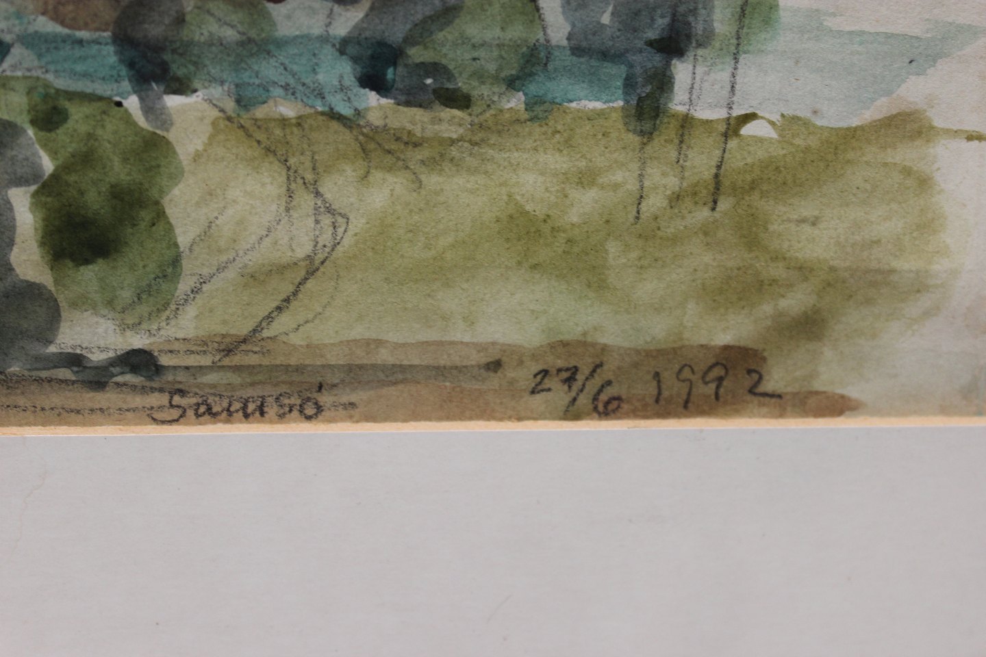 Akvarel i blå og grønne farver af Samsø signeret Jens Peter Groth Jensen fra 27/6-1992.