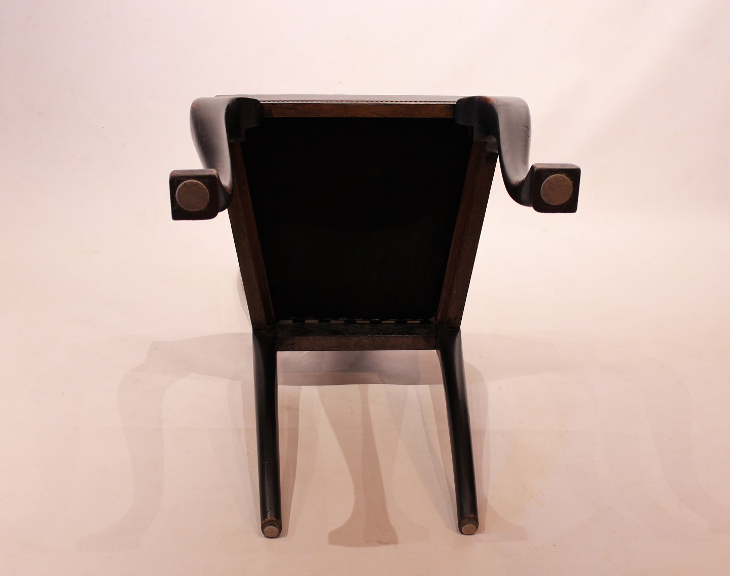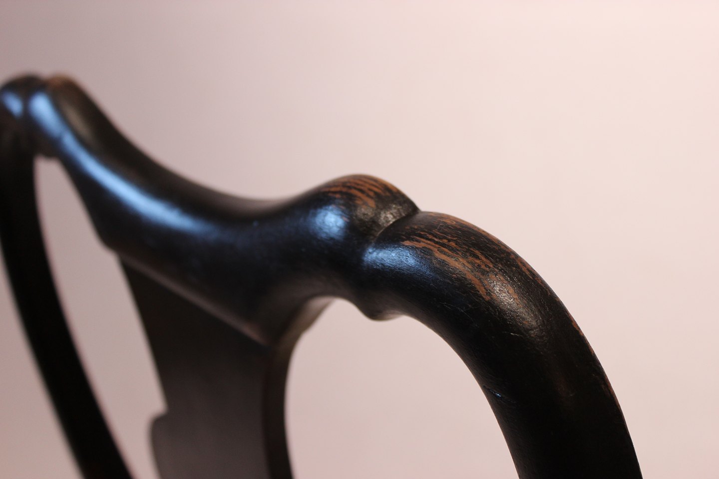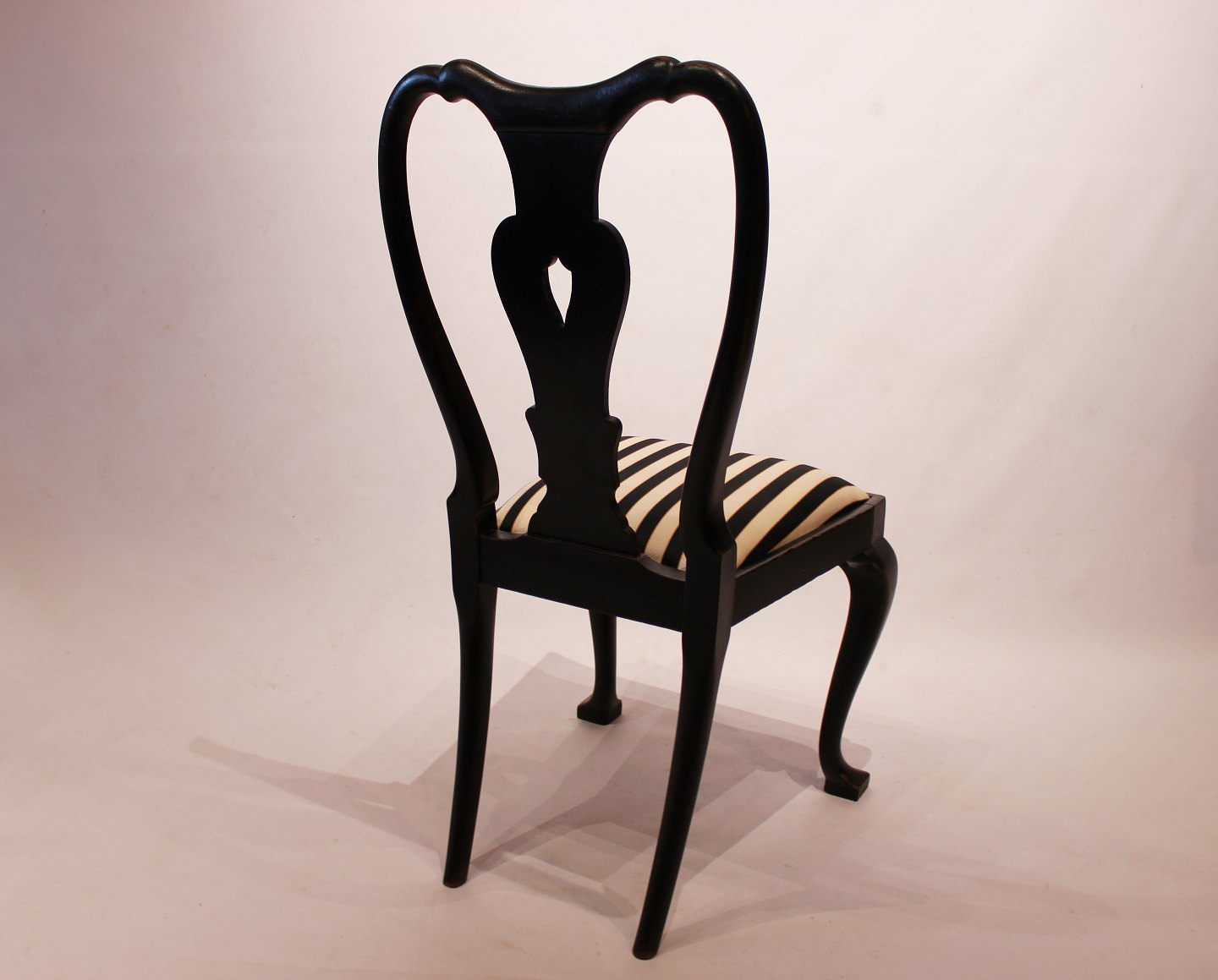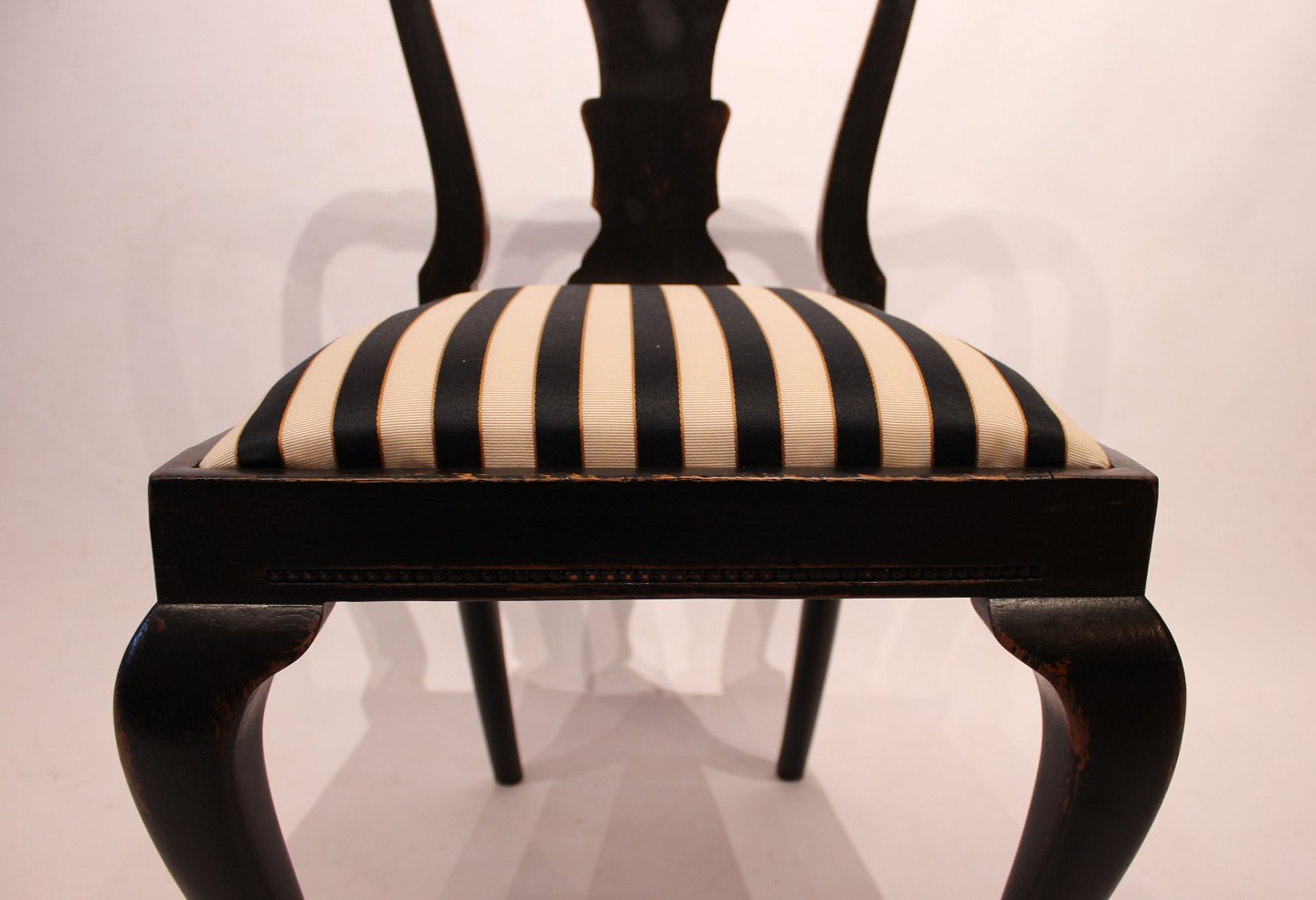 Sort malet spisestuestol i stilen Rokoko fra 1860erne. Stolen er i flot brugt stand og med stribet polstring.