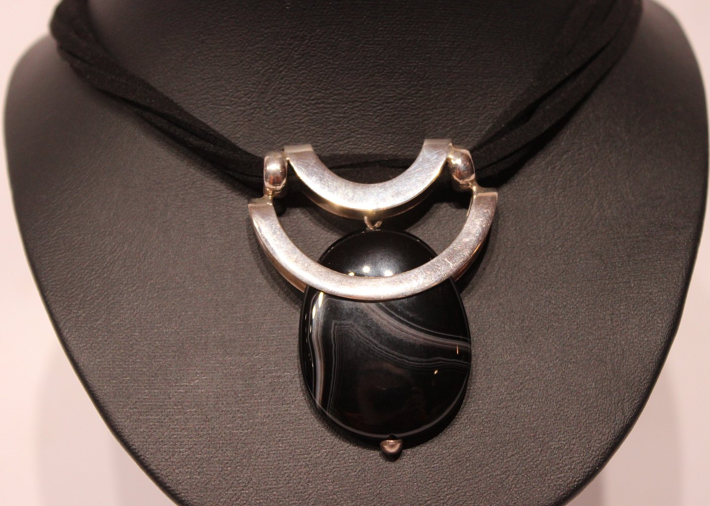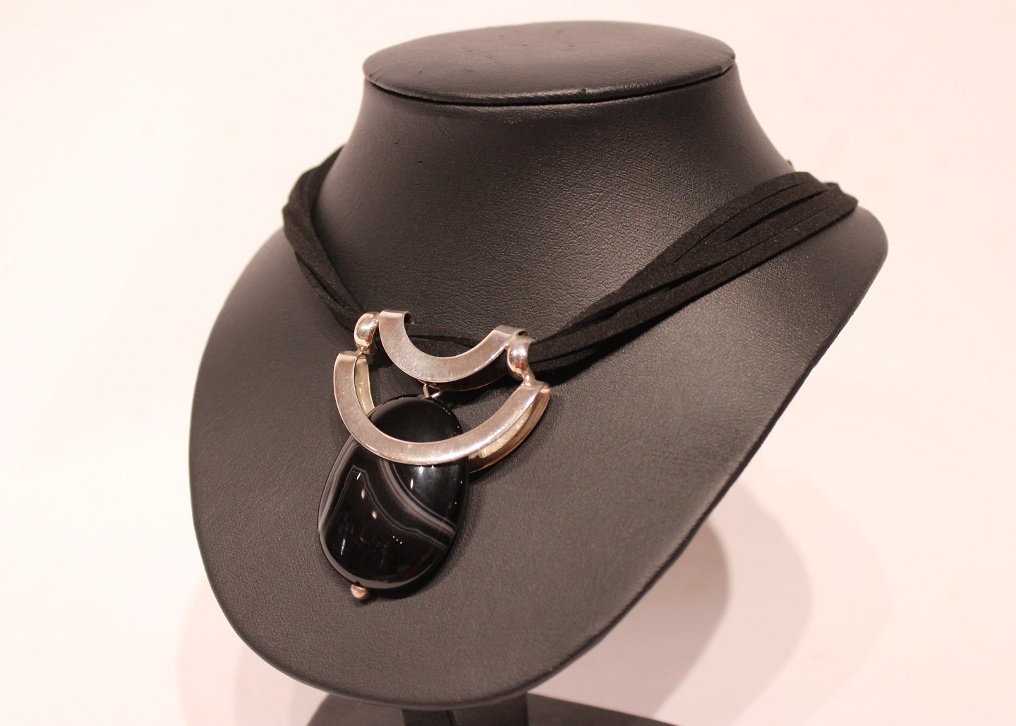 Halsmykke med skindrem og stort sølvvedhæng med onyx sten.