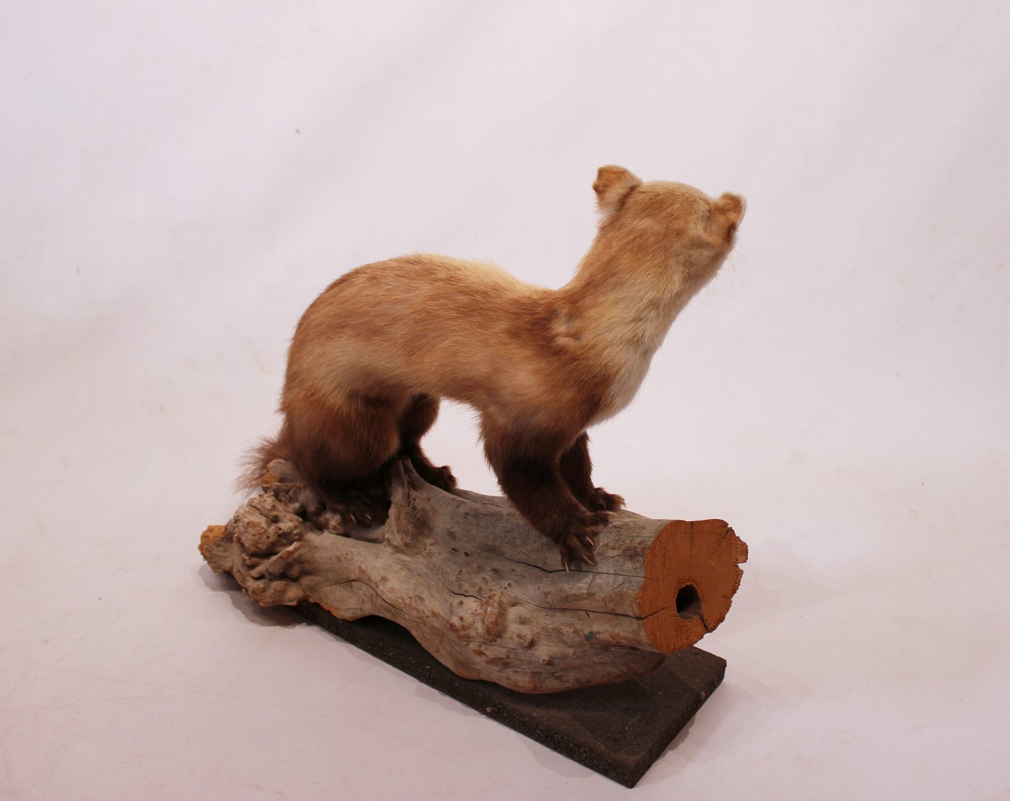 Udstoppet husmår siddende på træstamme fra 1980erne. Dyret er i flot brugt stand.