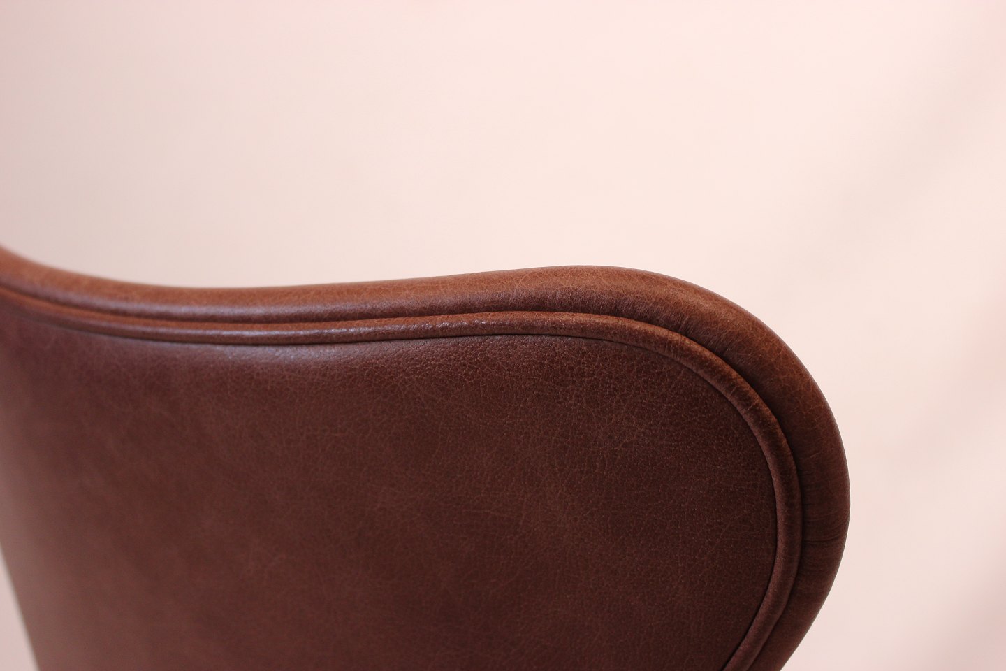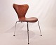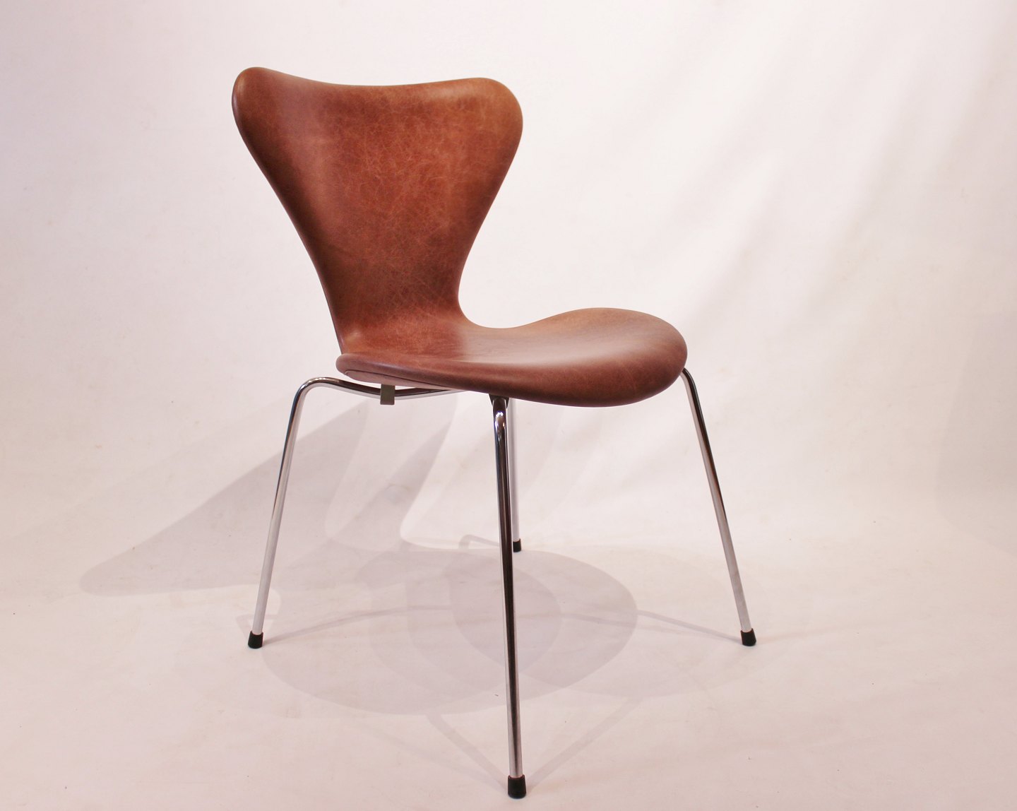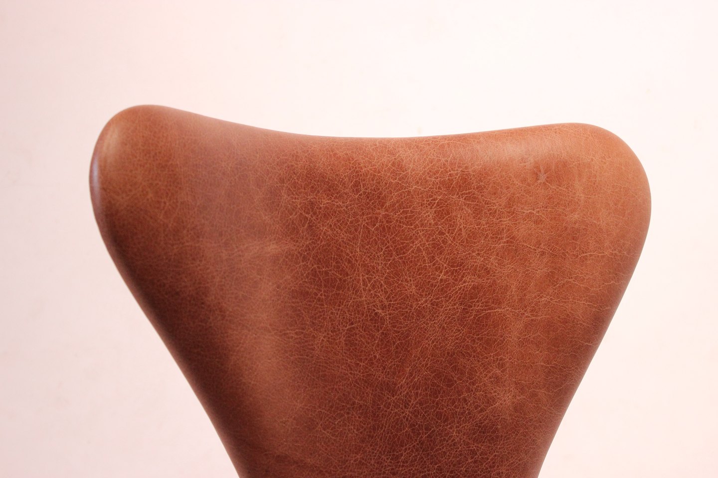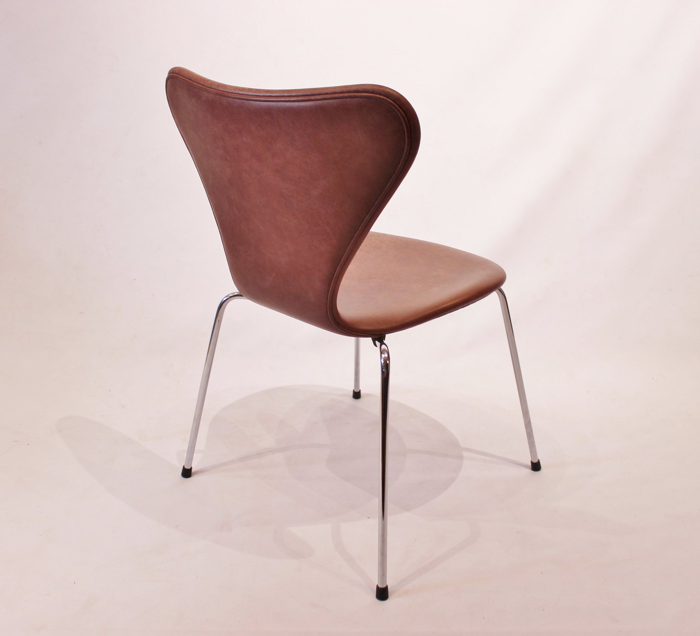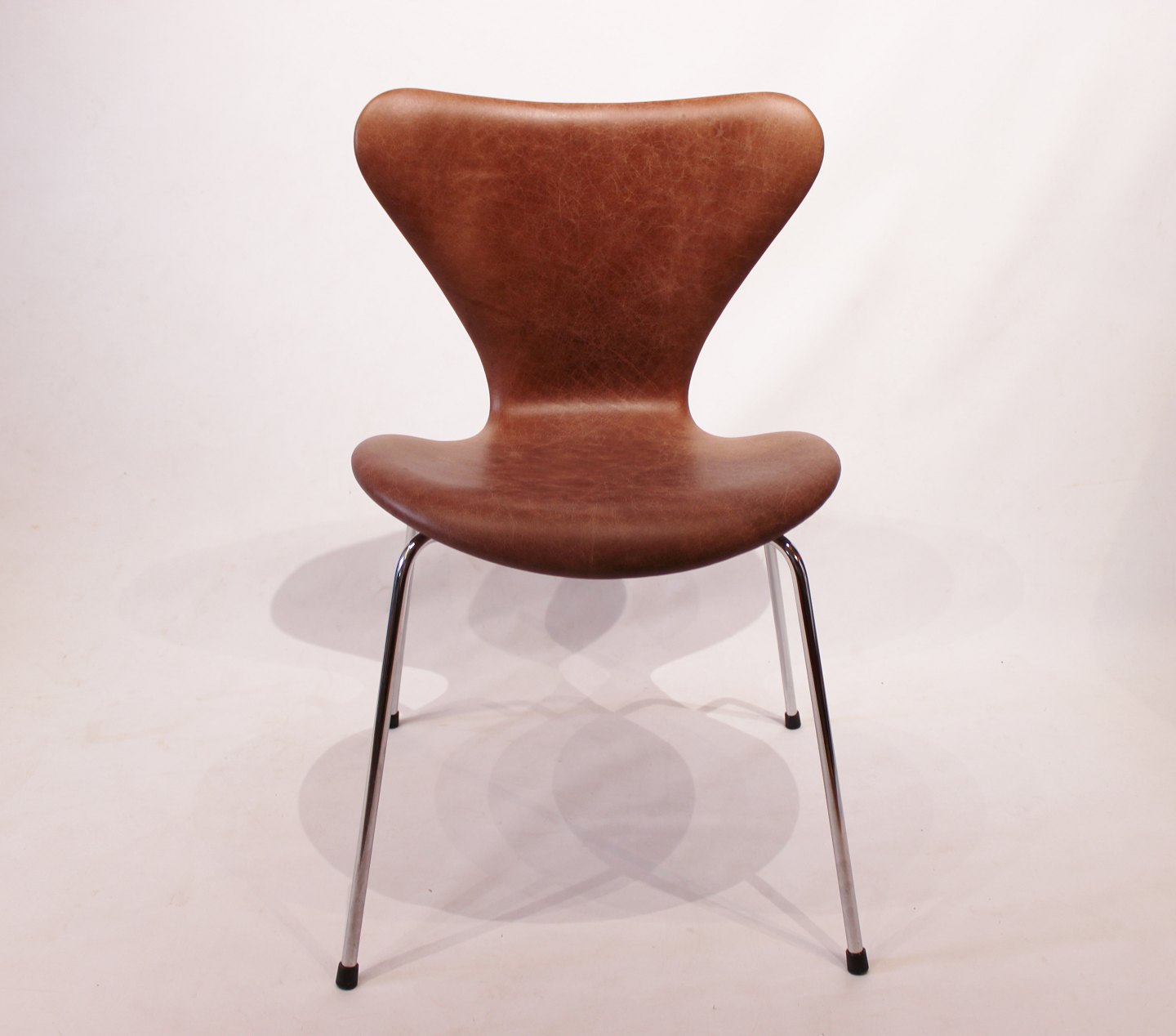 SoldA set of 6 Seven chairs, model 3107, designed by Arne Jacobsen and manufactured by Fritz Hansen in the 1980s. The chairs are newly upholstered in cognac patinated leather and in great condition.