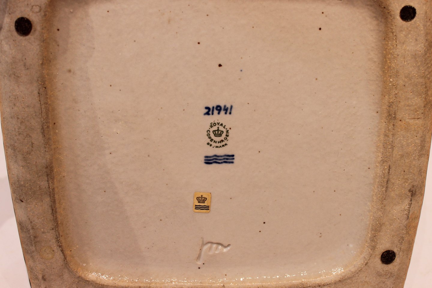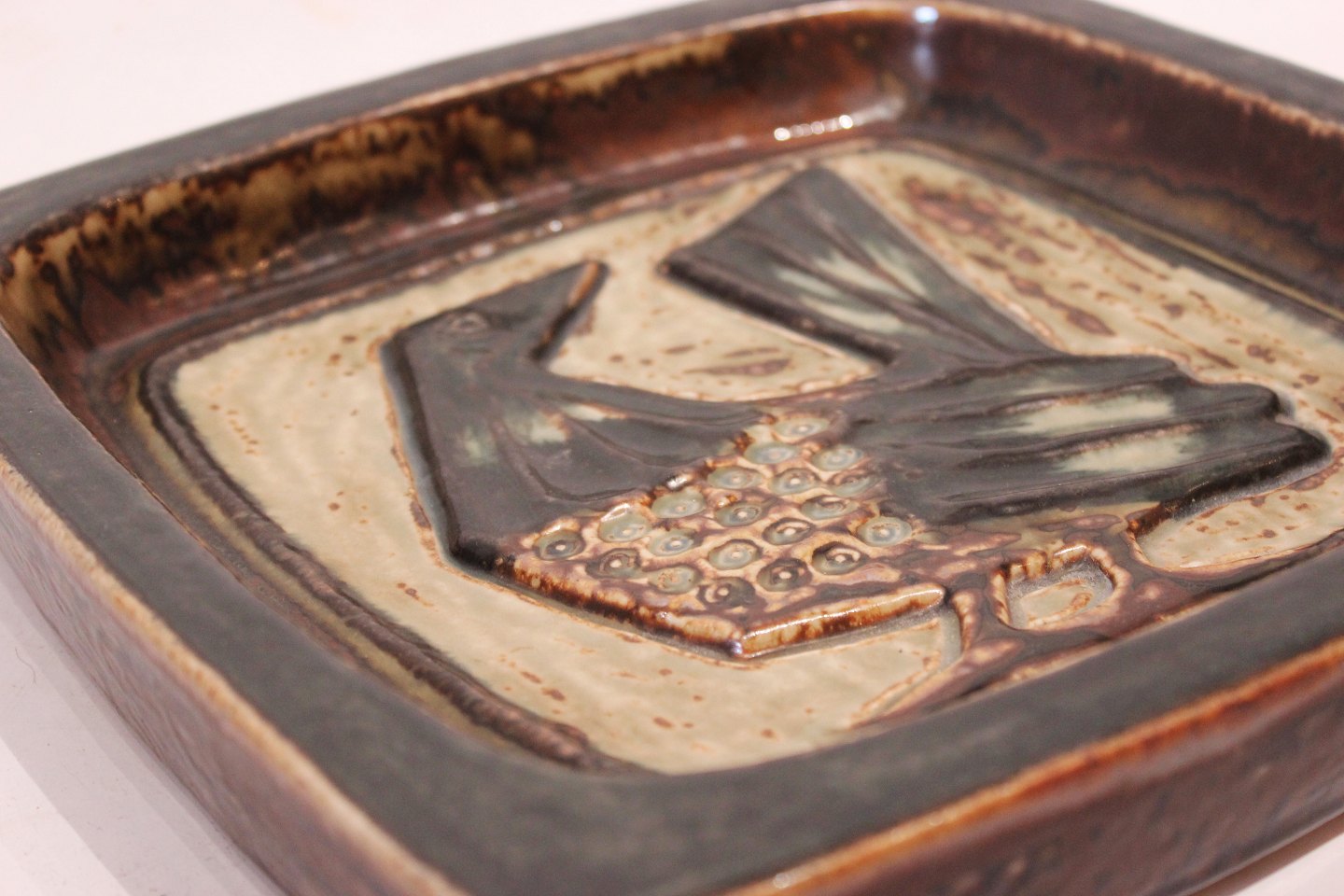 SoldRoyal Copenhagen stoneware dish, no.: 21941, by Jørgen Mogensen. The dish is decorated with a bird motif and in brown colors.