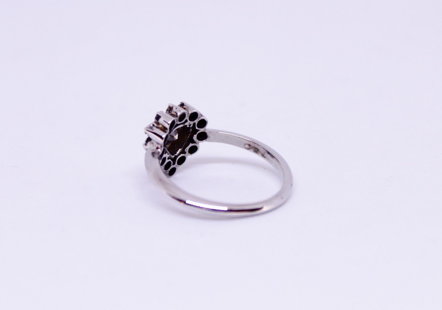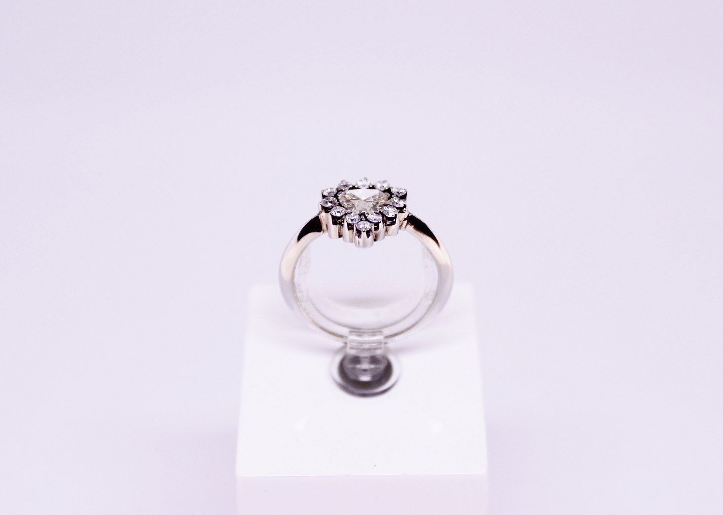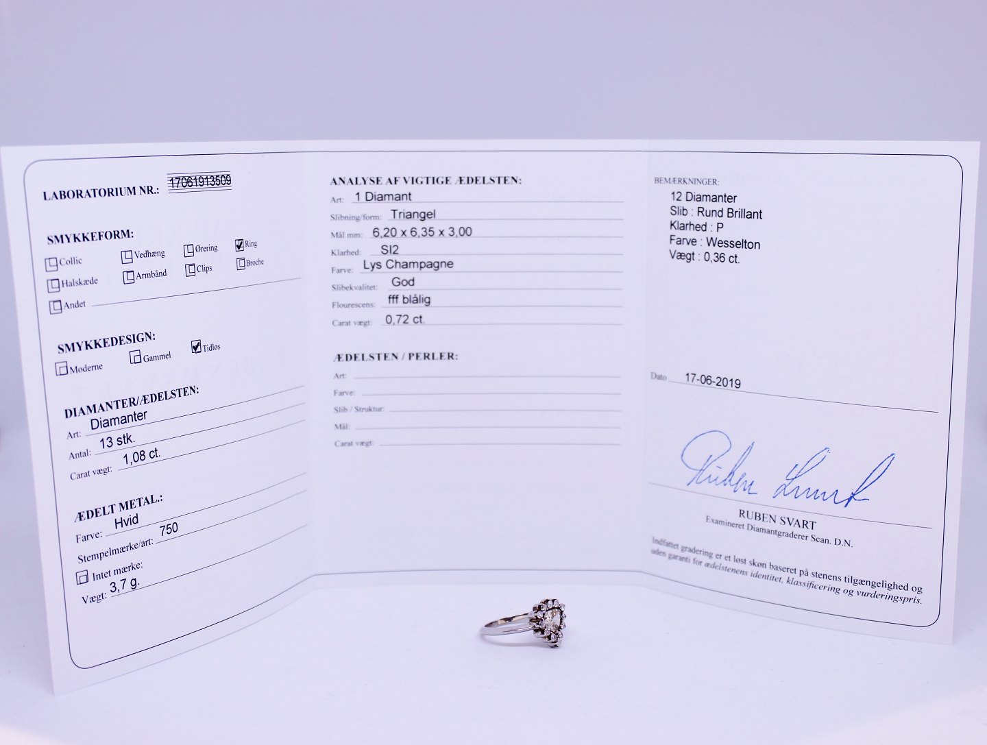 Kontakt os vedrørende prisRing af 14 kt. hvidguld dekoreret med 13 diamanter. En triangel formet diamant af 0,72 kt. i farven lys champagne og klarhed S12. Samt 12 mindre diamanter af 0,36 kt. og i farven Wesselton.