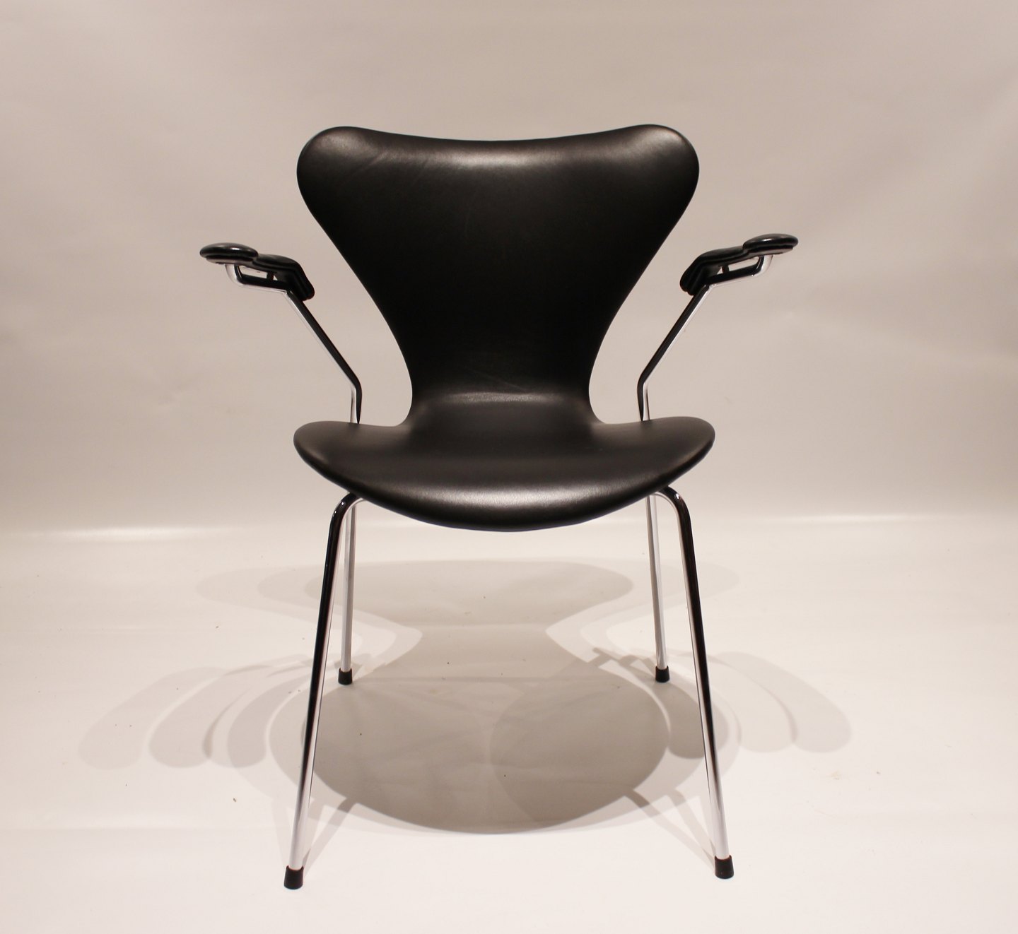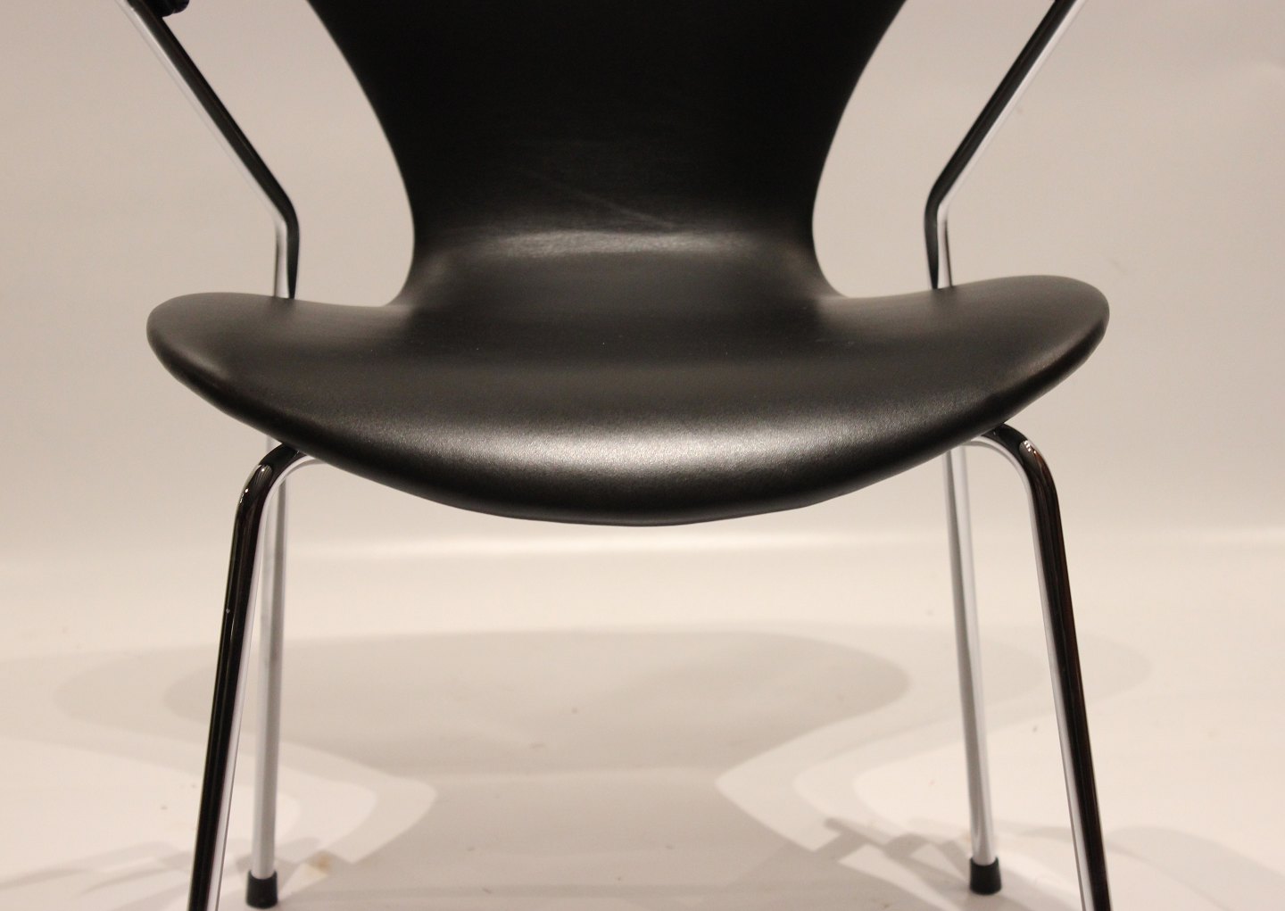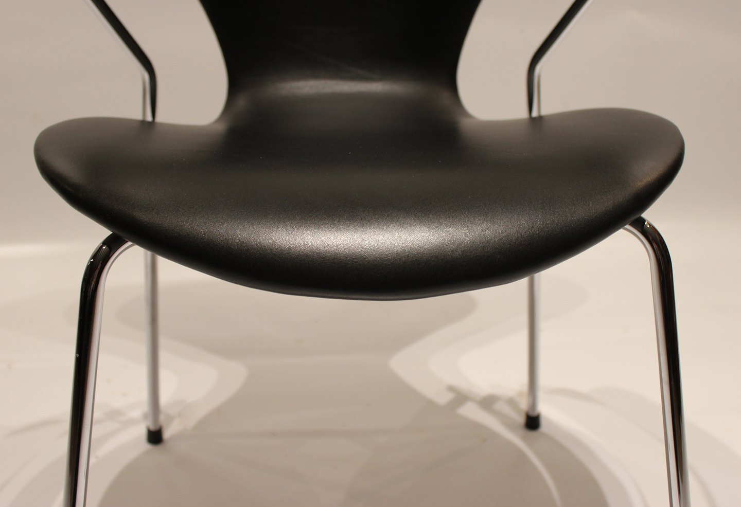 A set of four Seven chairs, also known as model 3207, with armrests in black Savanne leather is an iconic example of Danish furniture design from the mid-20th century. These chairs, designed by the legendary Danish architect Arne Jacobsen in 1955, and manufactured by the renowned Danish manufacturer Fritz Hansen in 2006, express a timeless elegance and functionality.