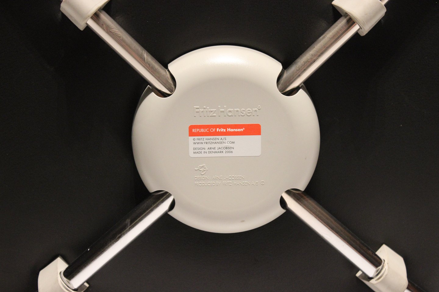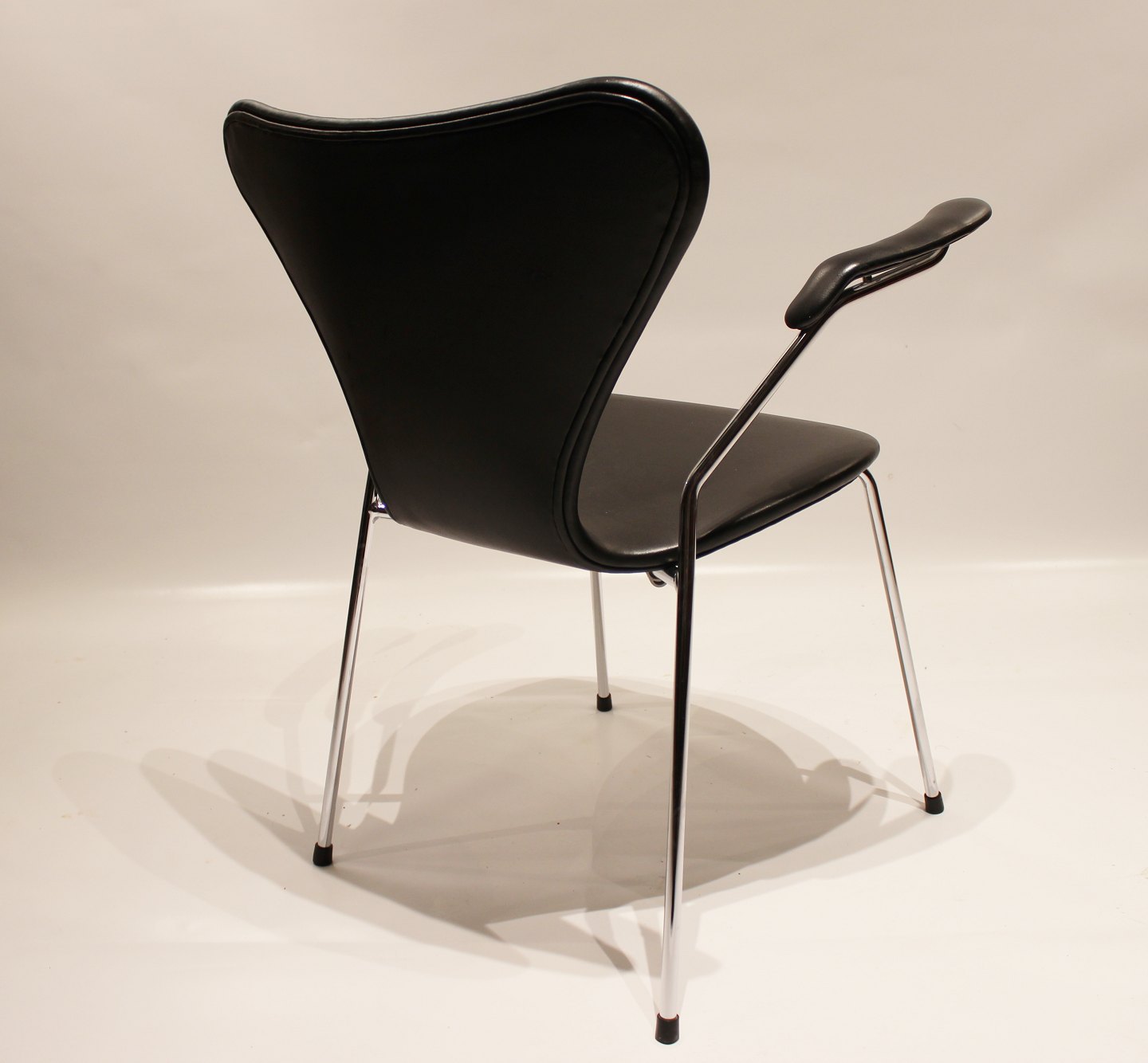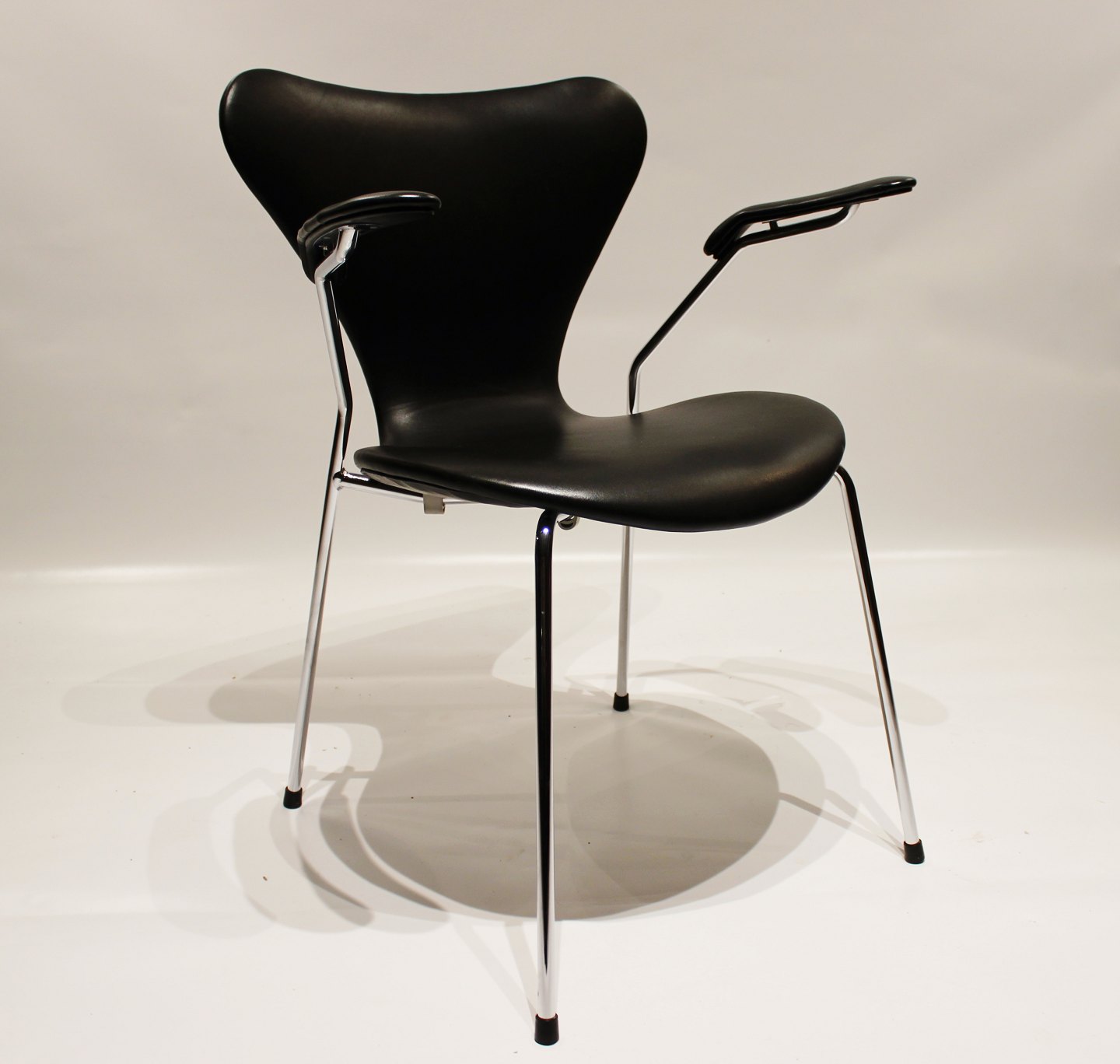A set of four Seven chairs, also known as model 3207, with armrests in black Savanne leather is an iconic example of Danish furniture design from the mid-20th century. These chairs, designed by the legendary Danish architect Arne Jacobsen in 1955, and manufactured by the renowned Danish manufacturer Fritz Hansen in 2006, express a timeless elegance and functionality.