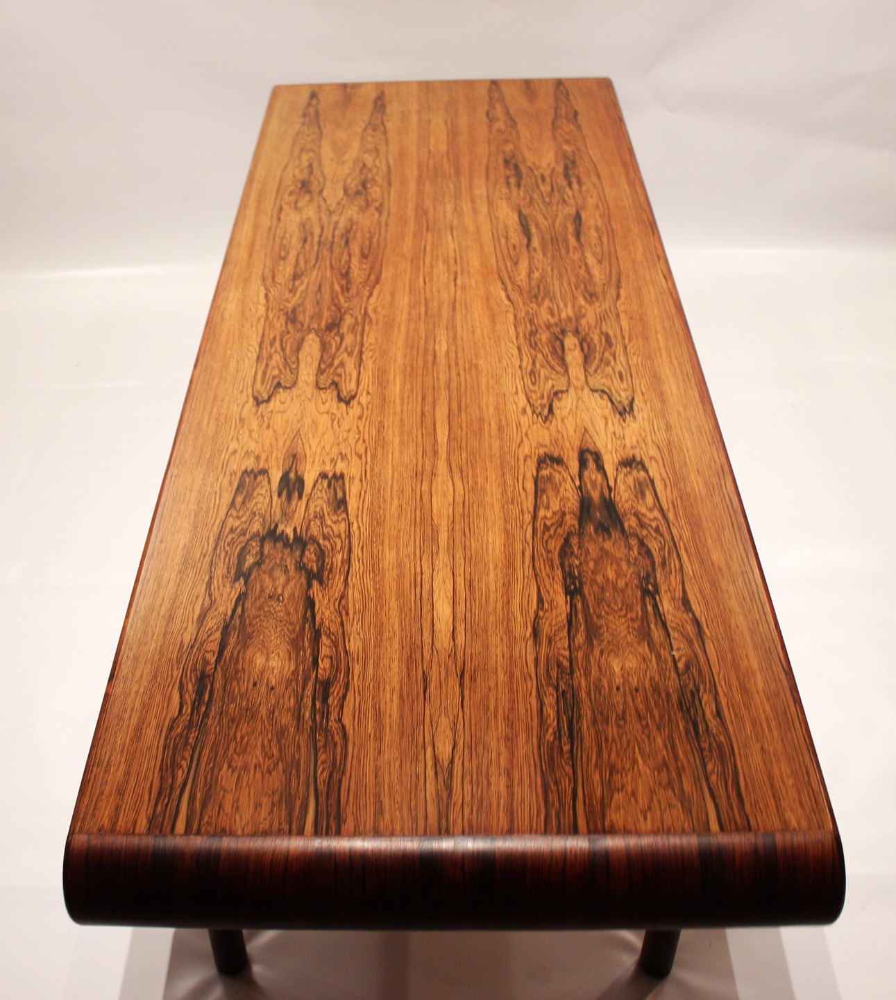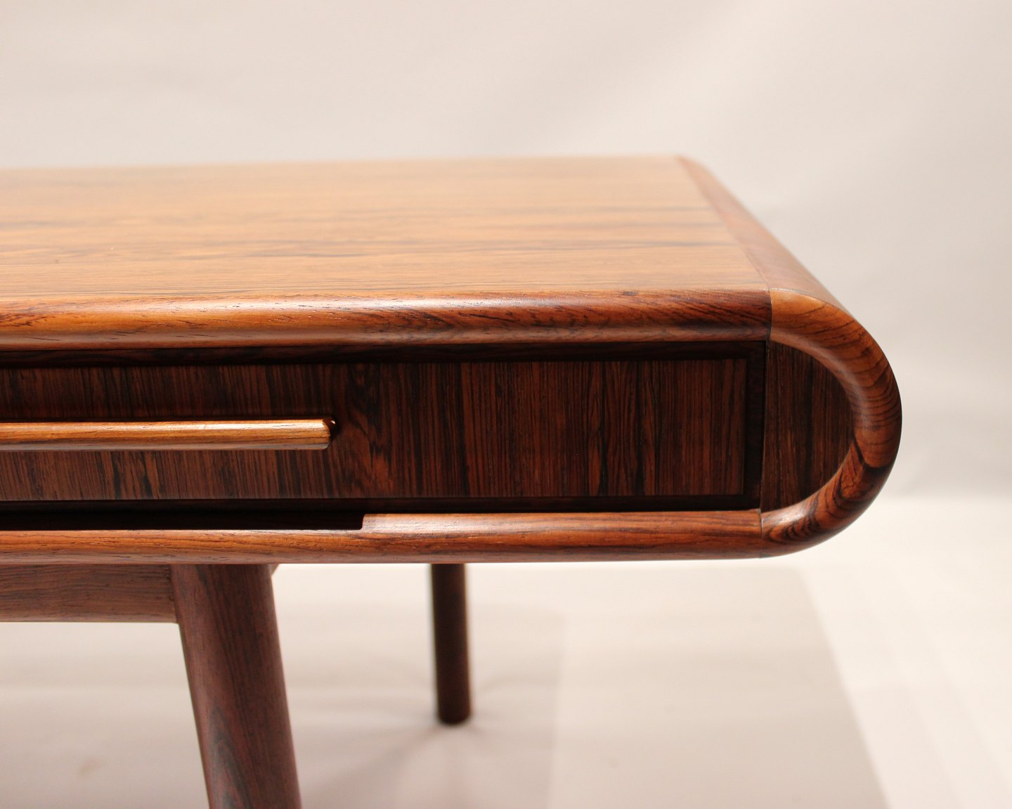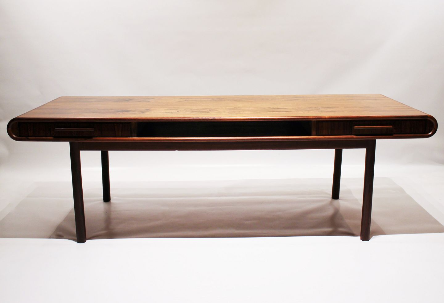 SoldCoffee table in rosewood with curved edges of danish design from the 1960s. The table is with an open shelf, drawers and in great vintage condition.