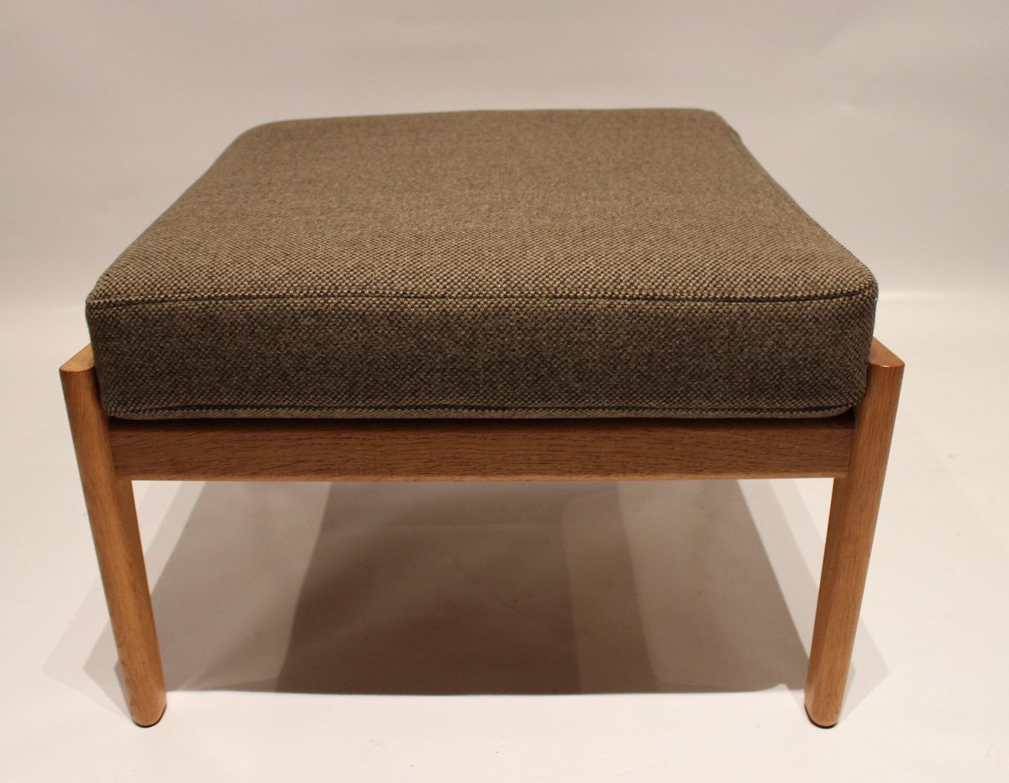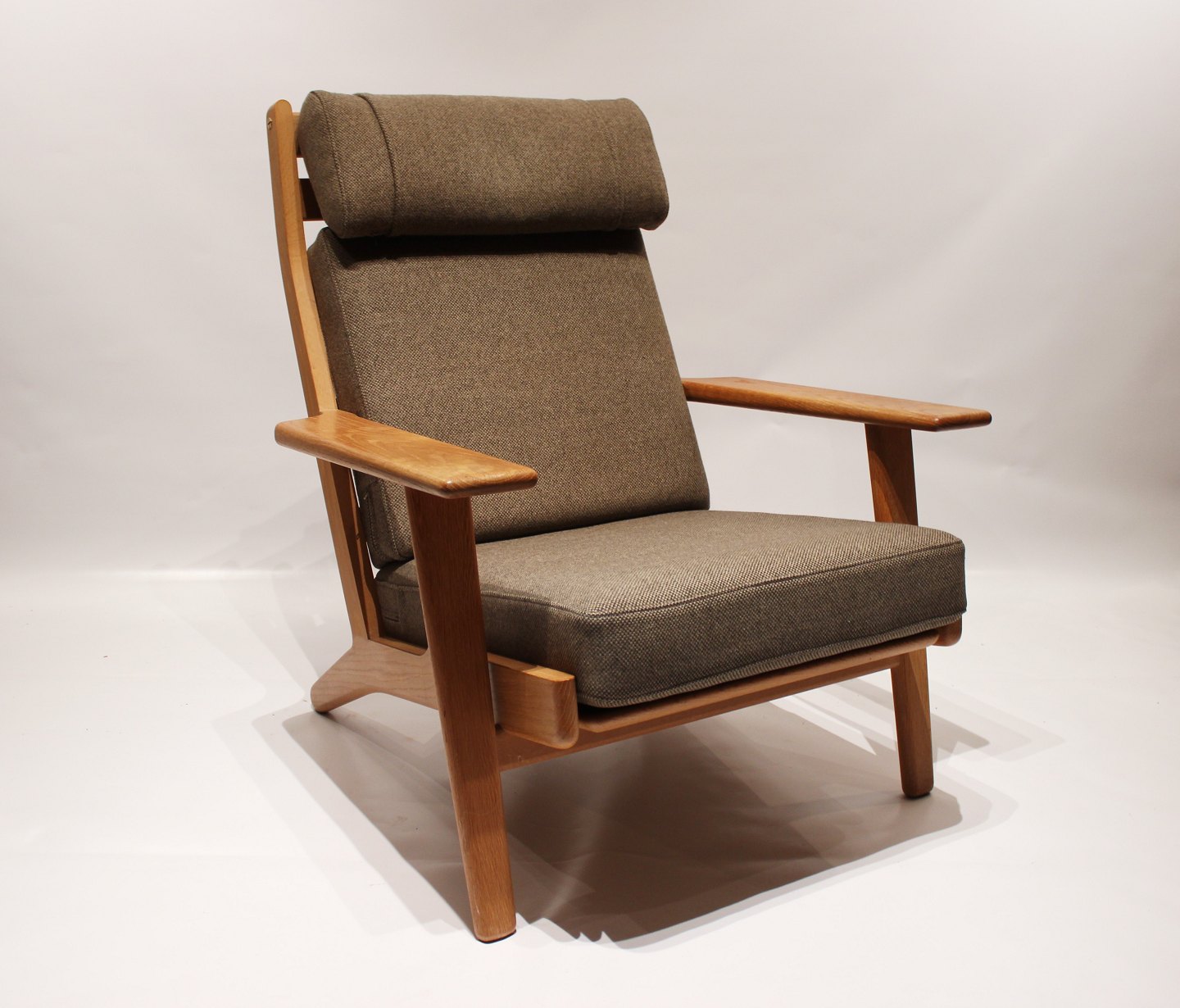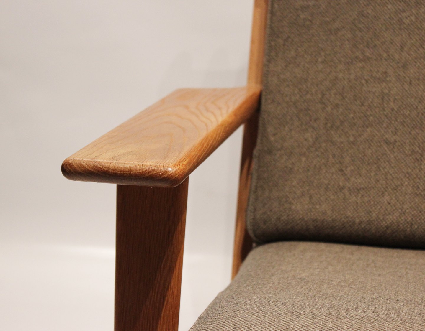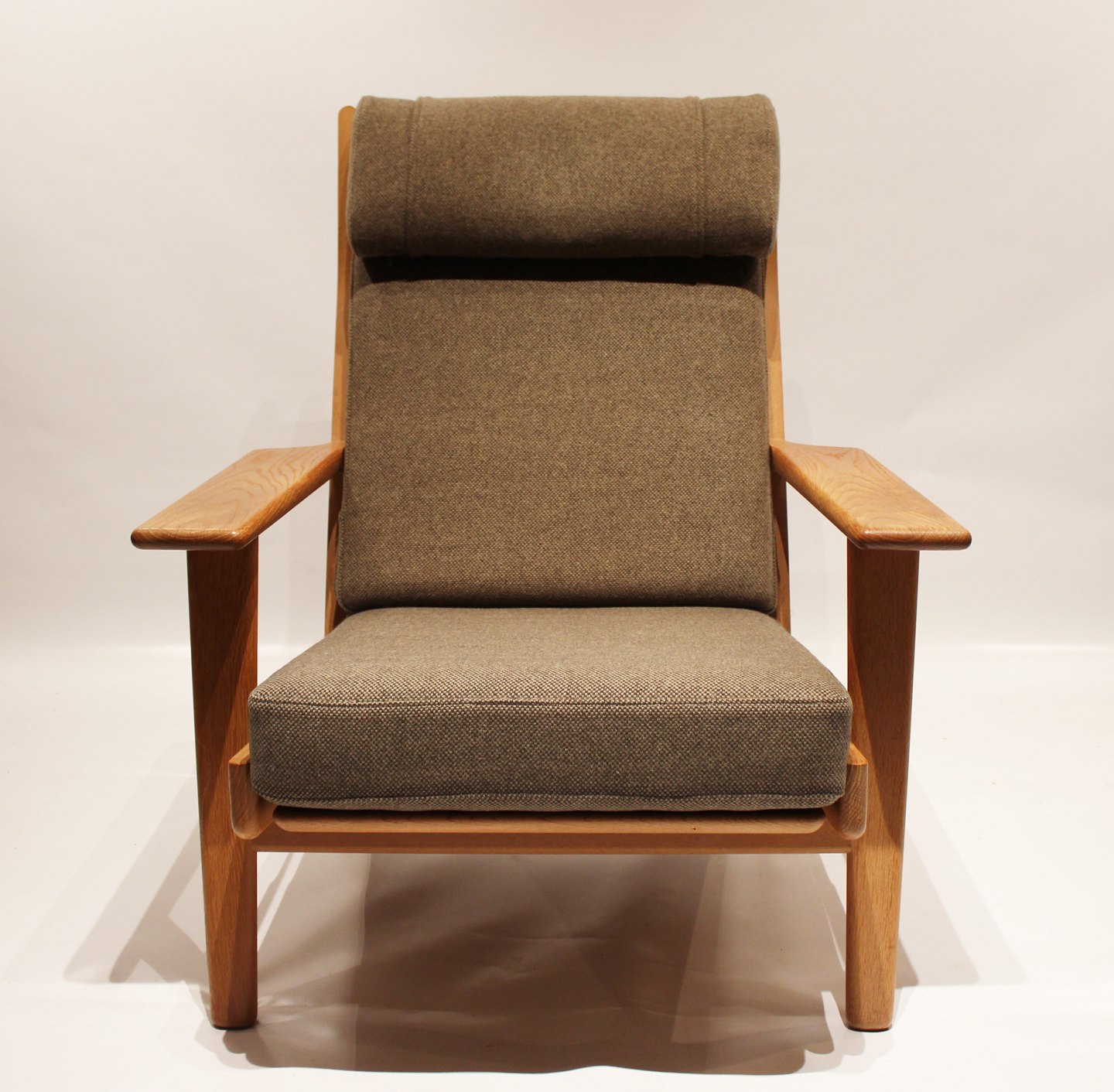 Easy chair, model GE290A, and stool designed by Hans J. Wegner and manufactured by Getama in the 1960s. The chair and stool are of soap treated oak and upholstered with dark green Hallingdal wool.
