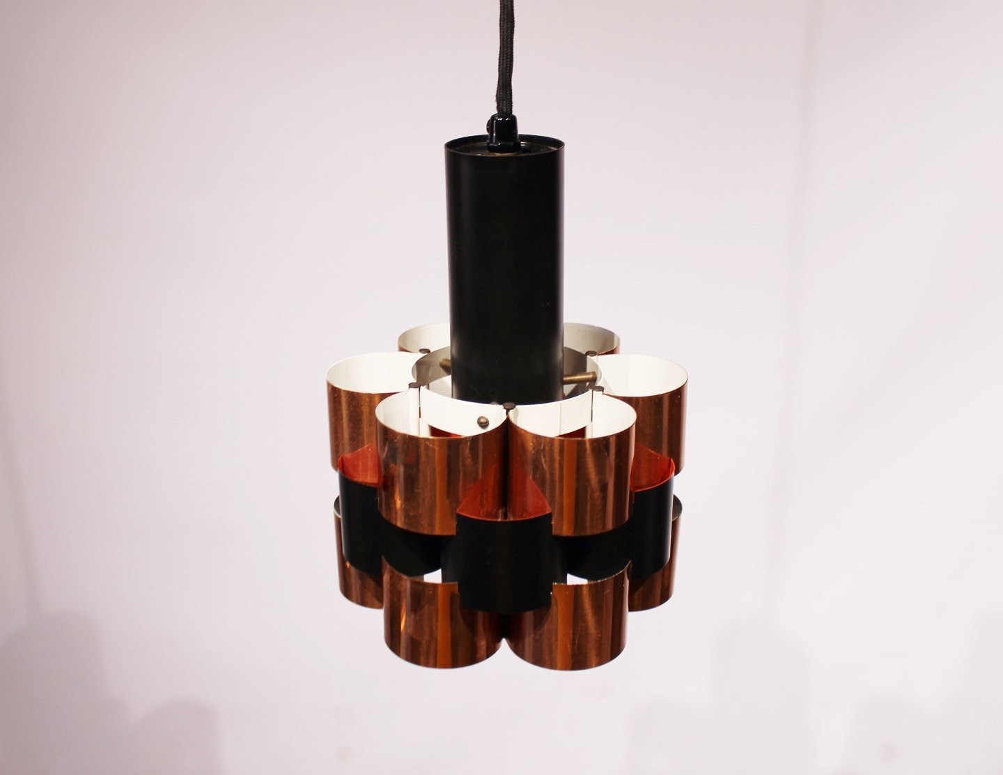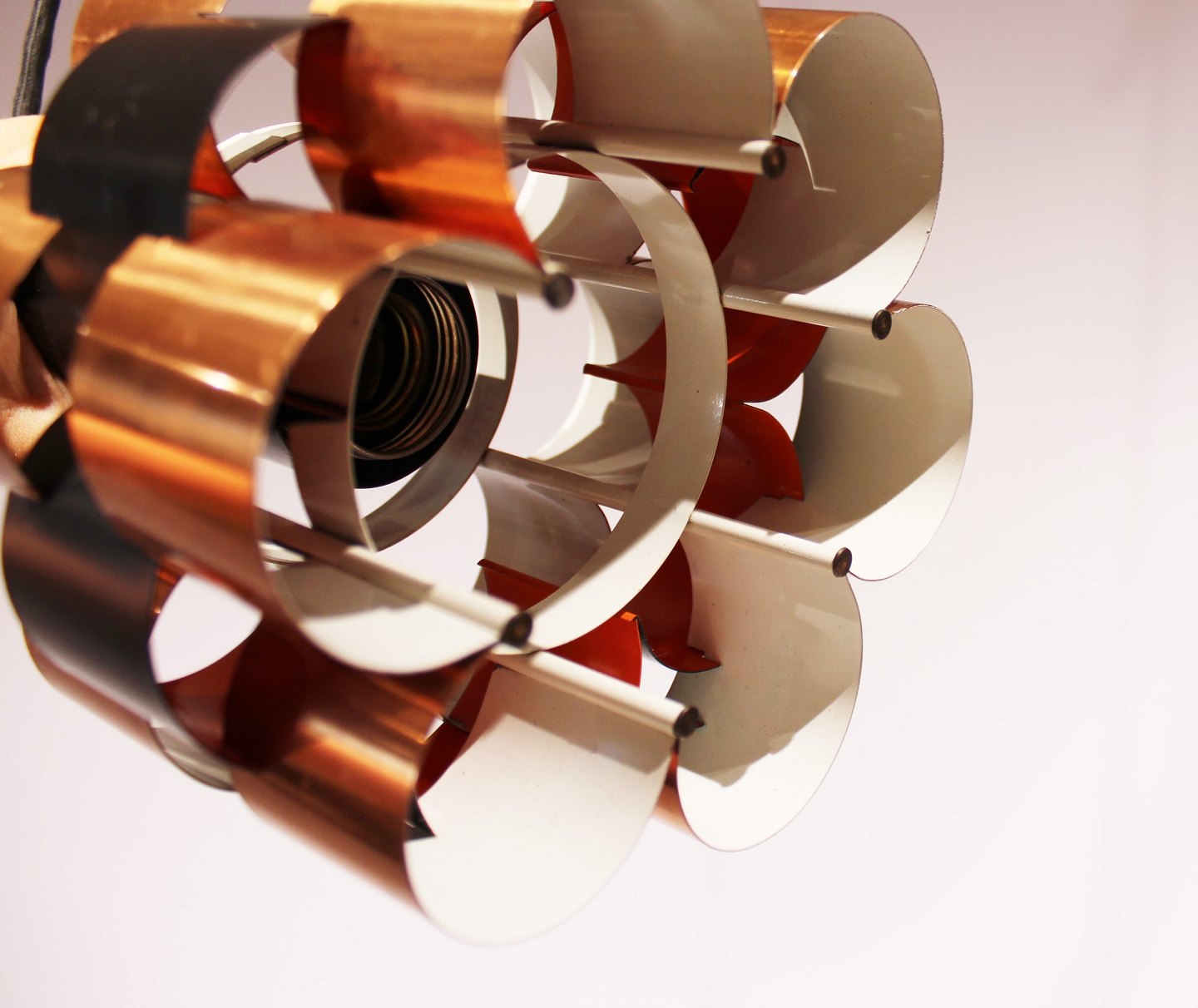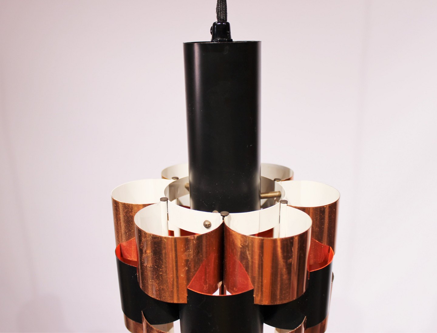 A pair of ceiling pendants in of cobber and black lacquered metal designed by Werner Schou from the 1960s. The lamps are in great vintage condition.