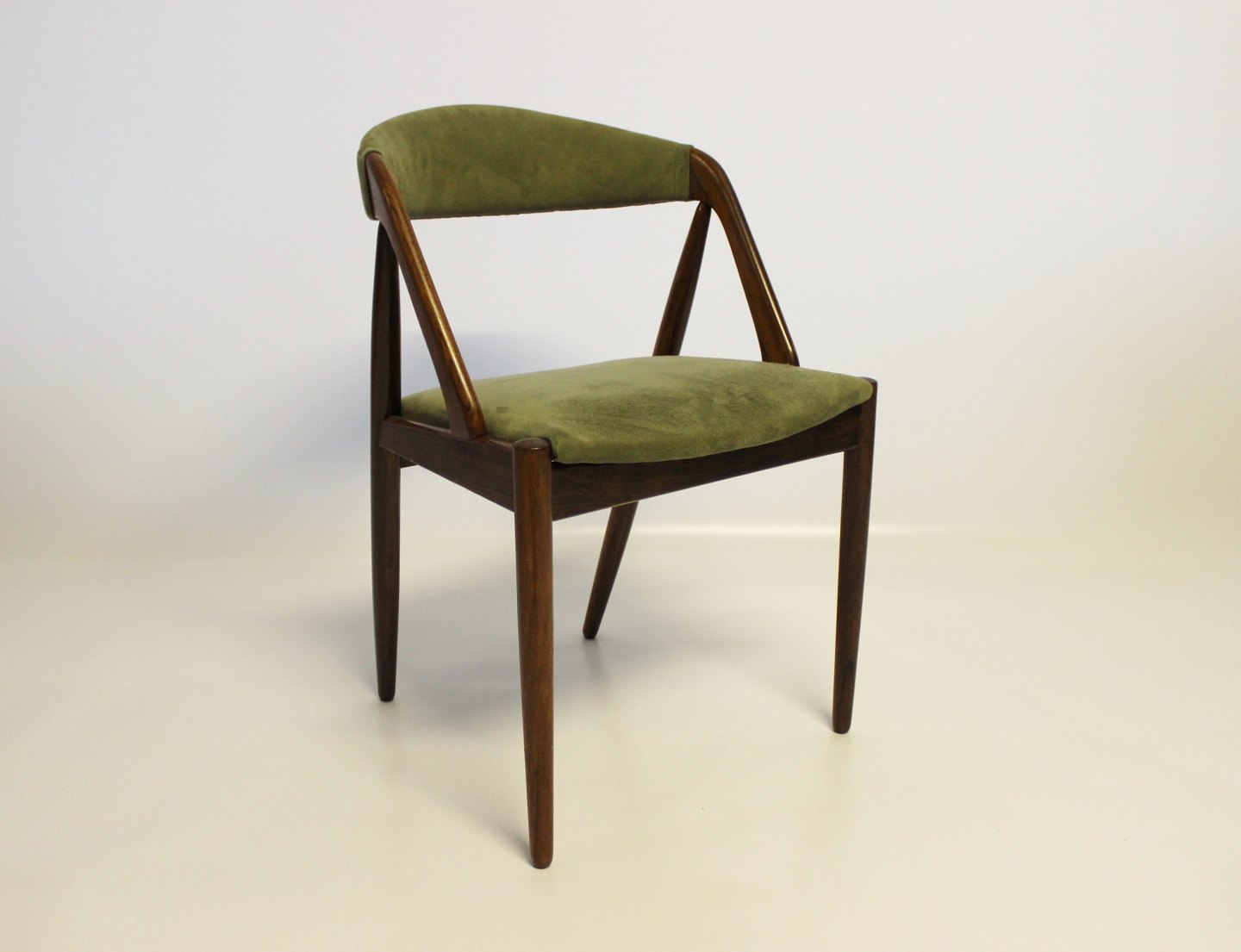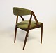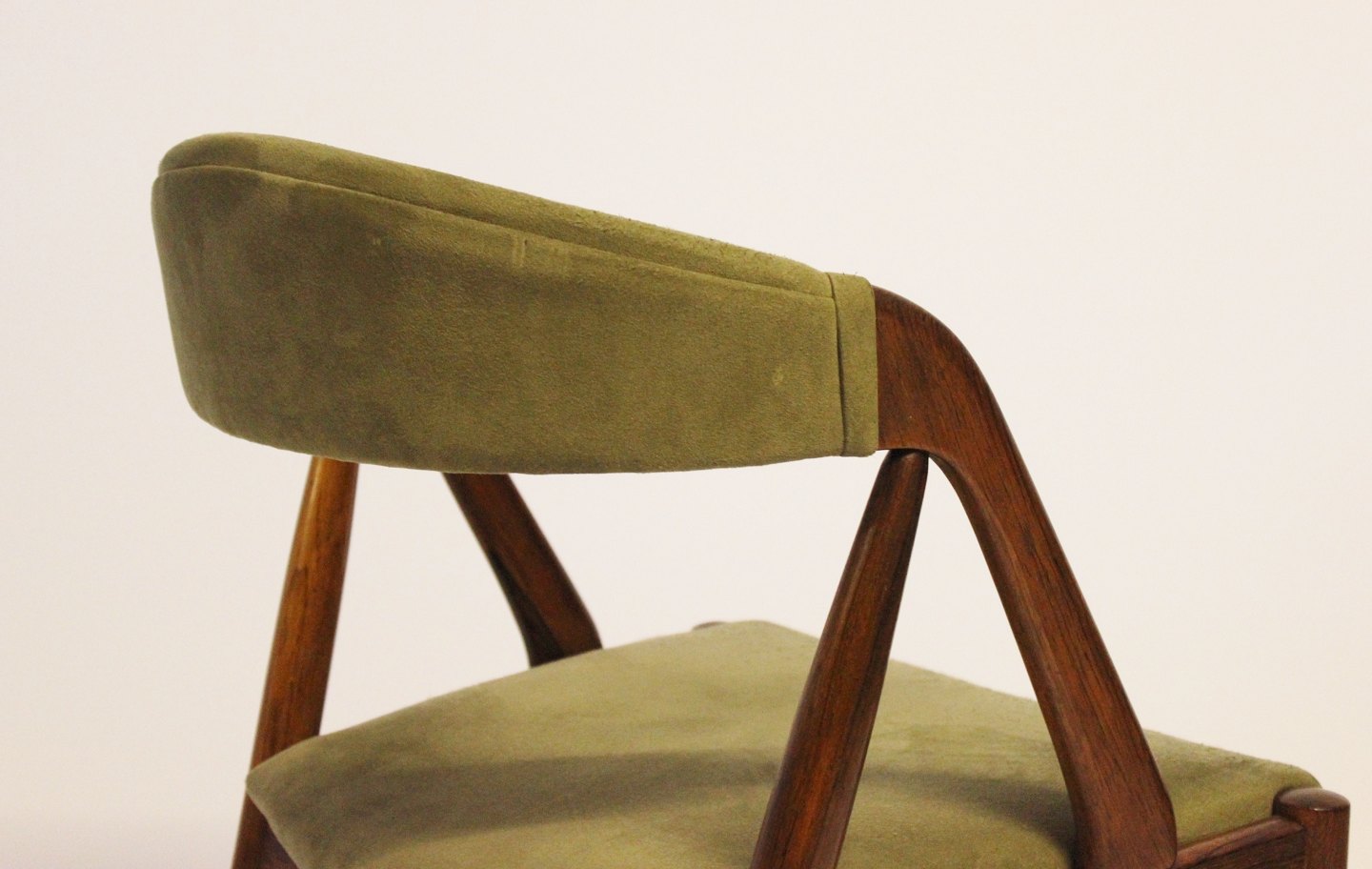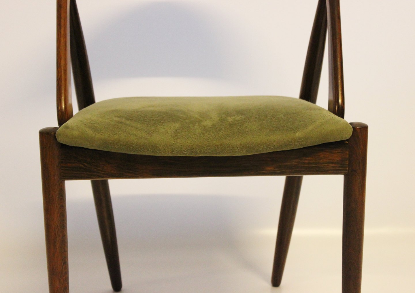 SoldA set of six dining chairs, model 31, designed by Kai Kristiansen and manufactured by Schou Andersen in the 1960s. The chairs are of rosewood and upholstered with green fabric.