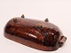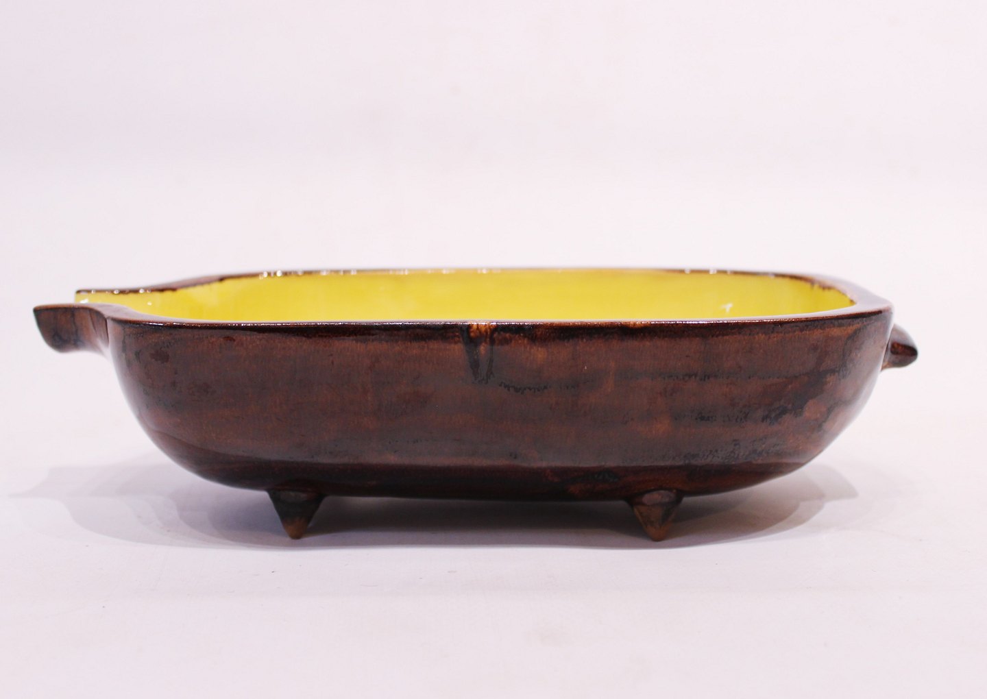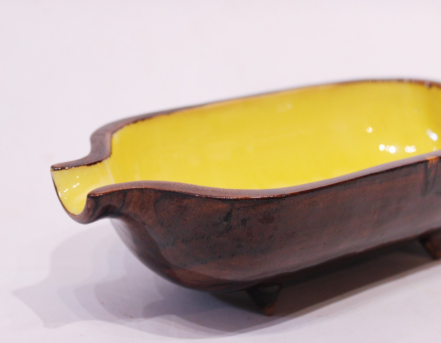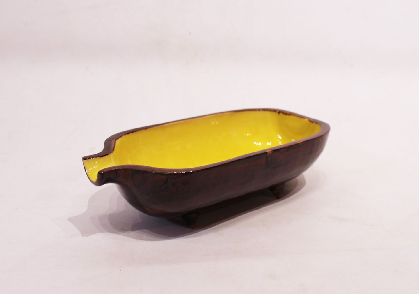Keramik skål på fødder med brun glasur udvendig og gul indvendig af dansk design fra 1960erne. Skålen er i flot brugt stand.