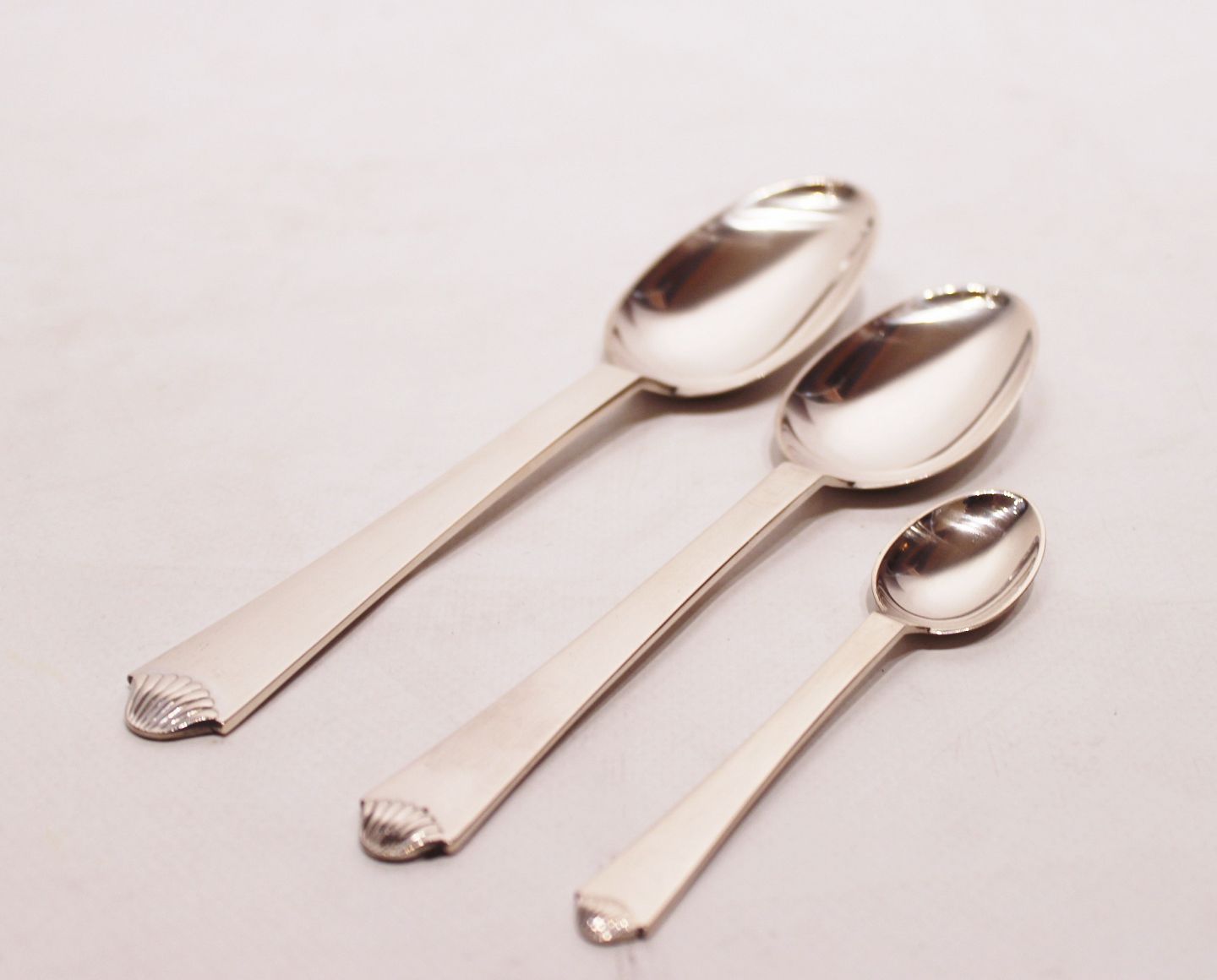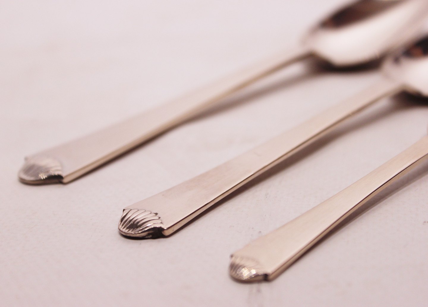 Se prisen i varebeskrivelsenMiddagsske (650 kr.), dessert ske (600 kr.) og teske (300 kr.) i Arvesølv nr. 4 af Hans Hansen. Spørg for antal på lager.
