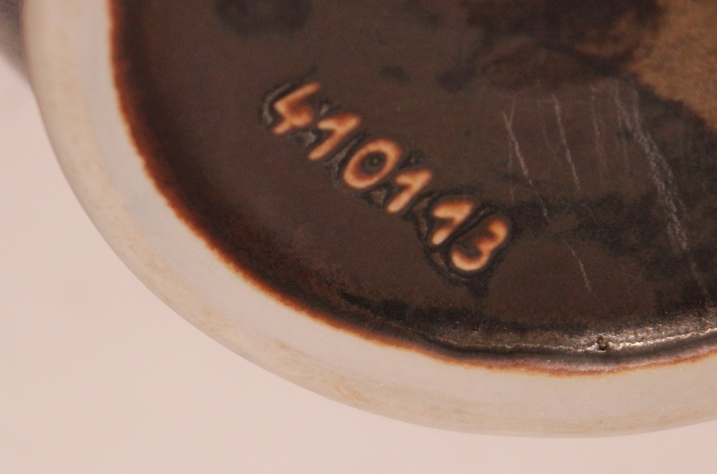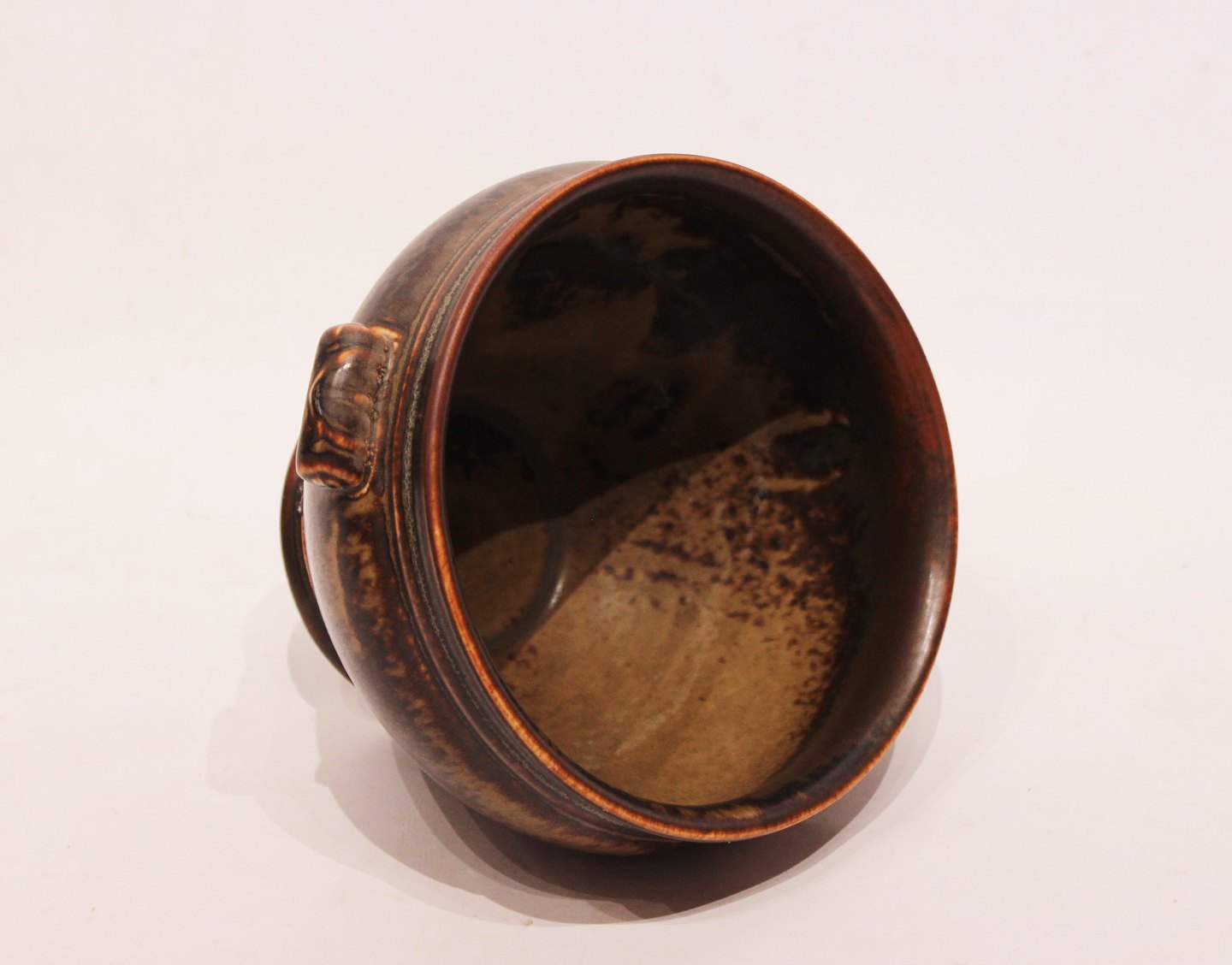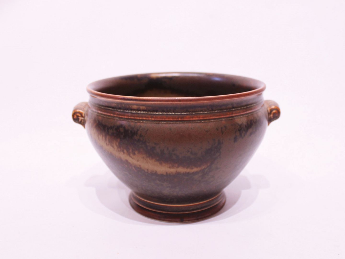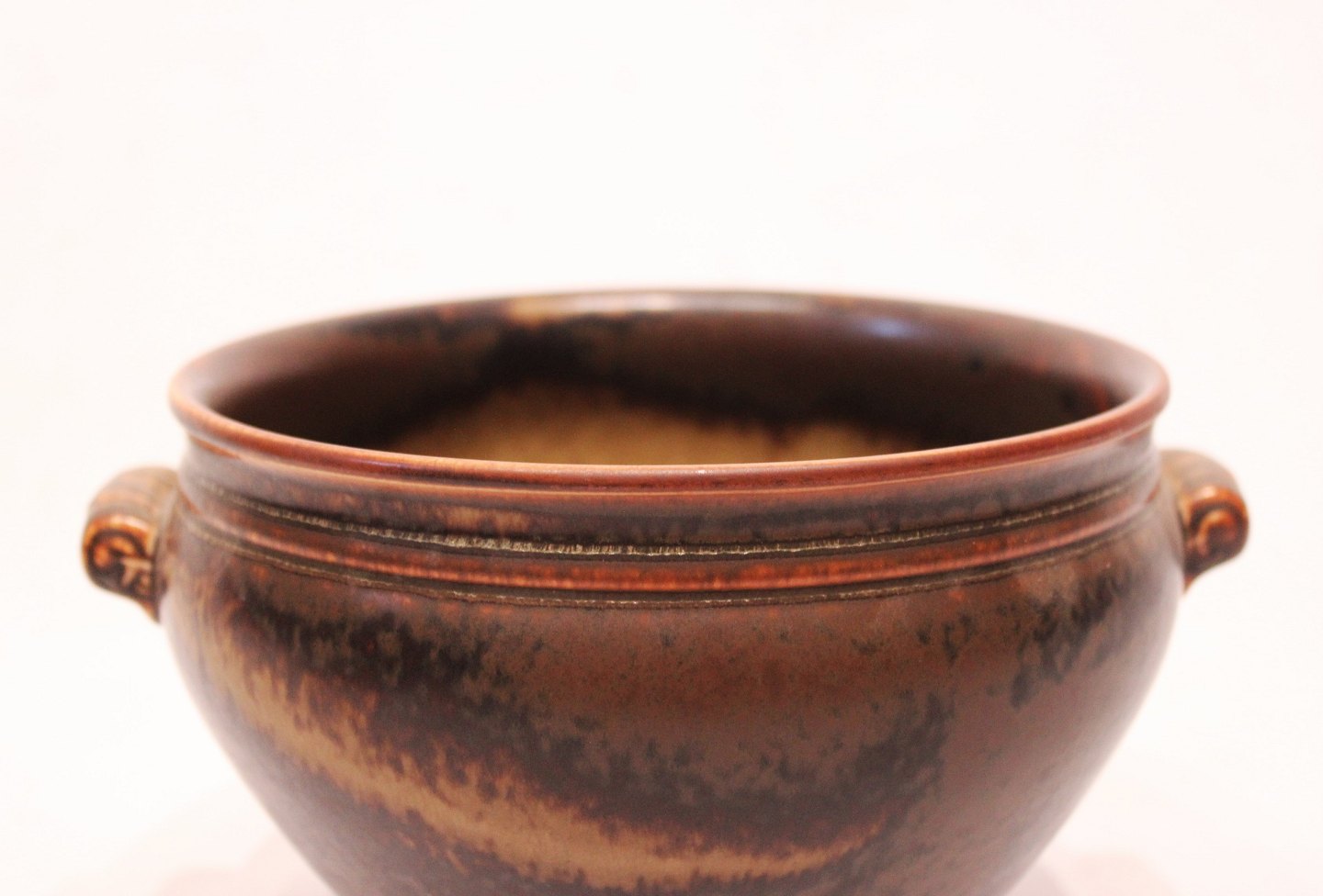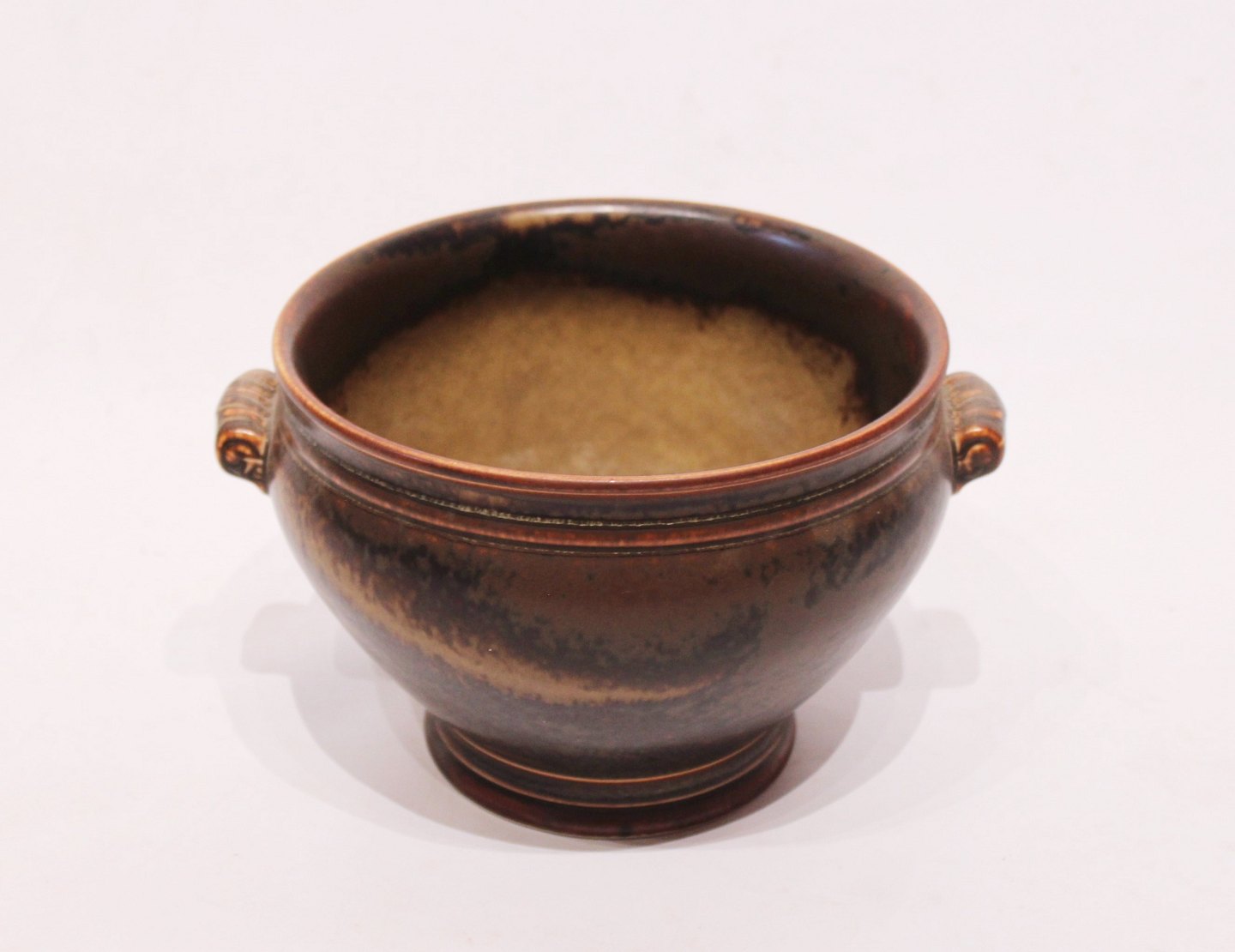 Keramik skål med håndtag og mørkebrun glasur fra 1960erne. Skålen er nummeret 410113.