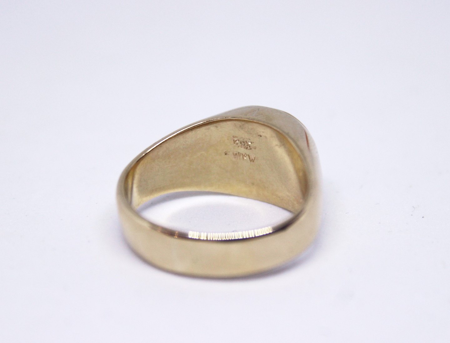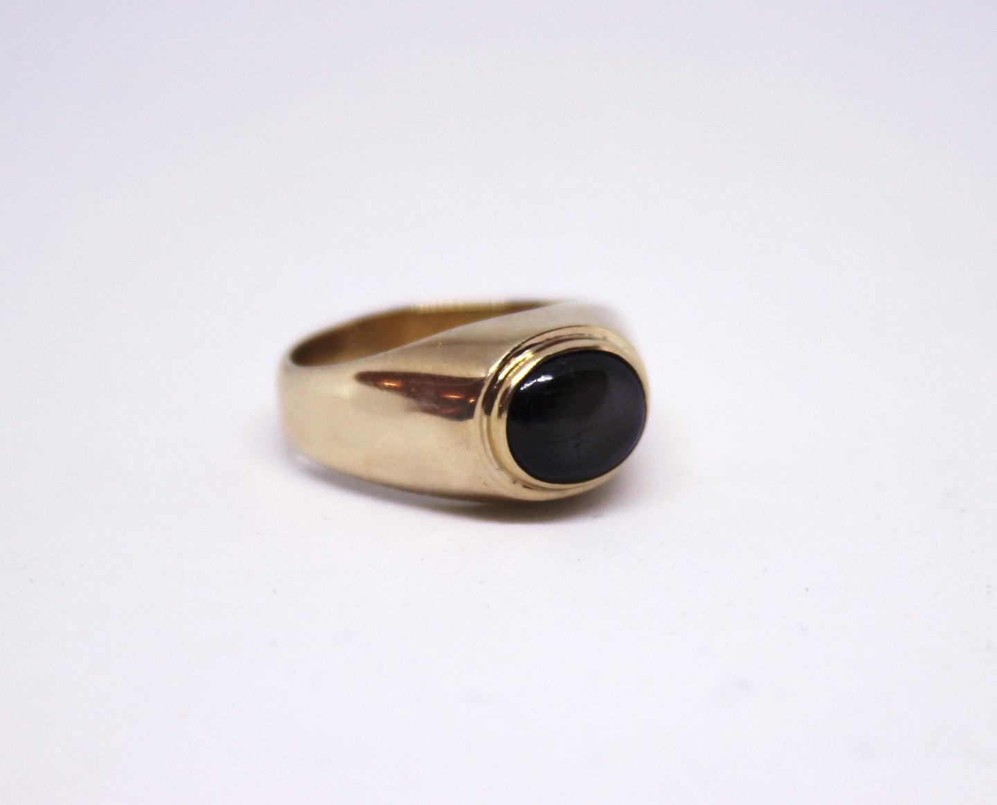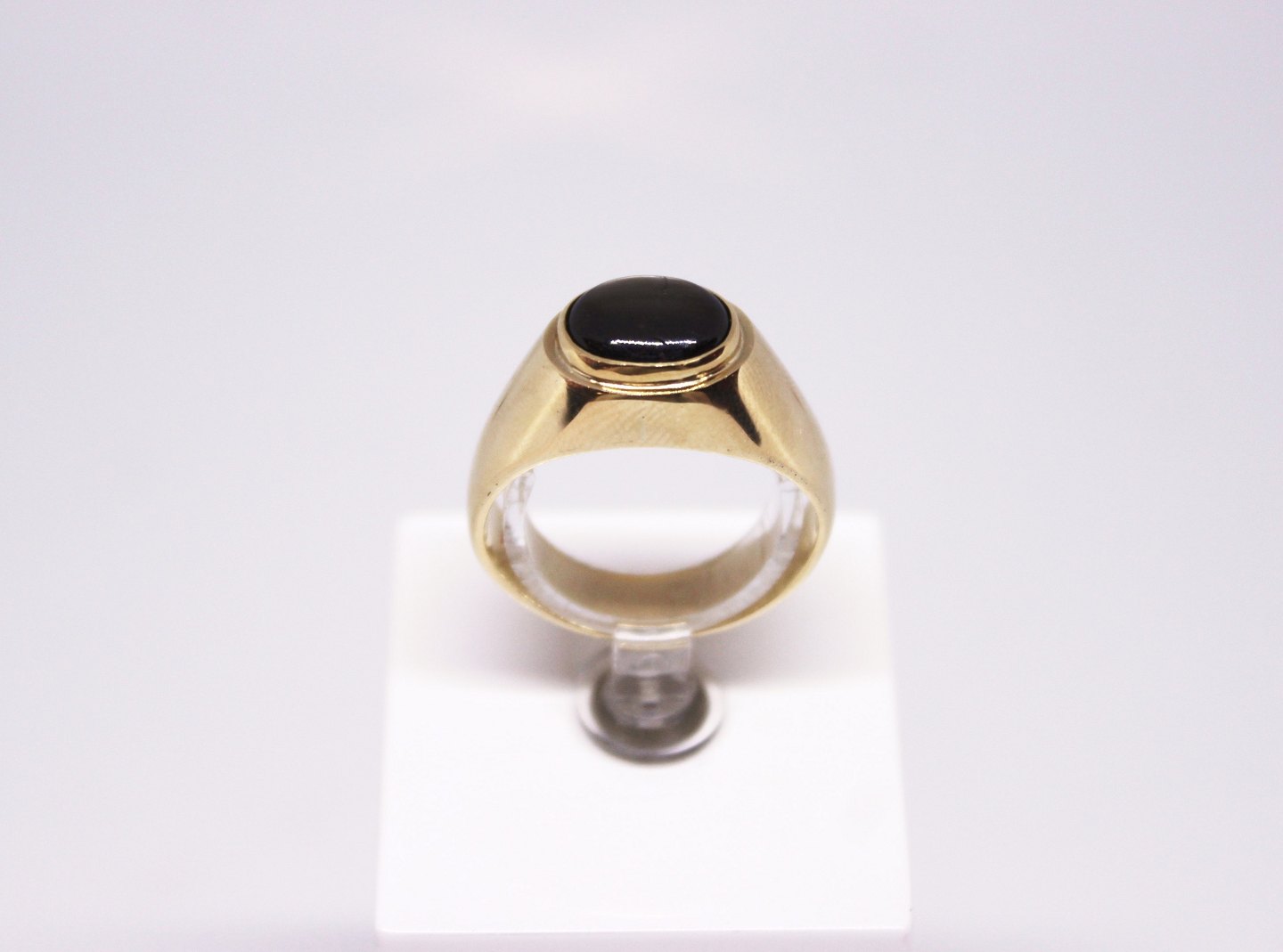 Ring af 14 kt. guld dekoreret med onyx sten.