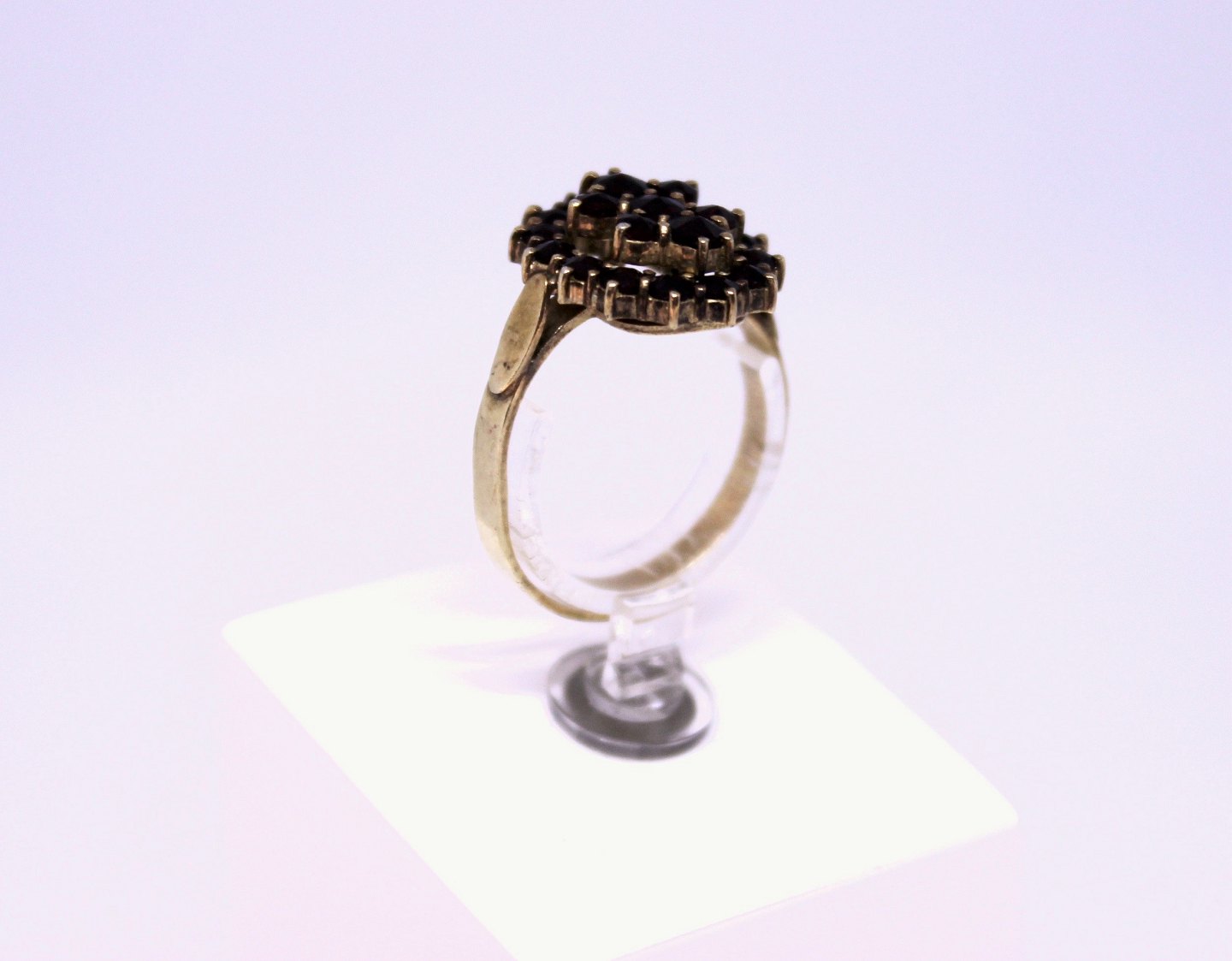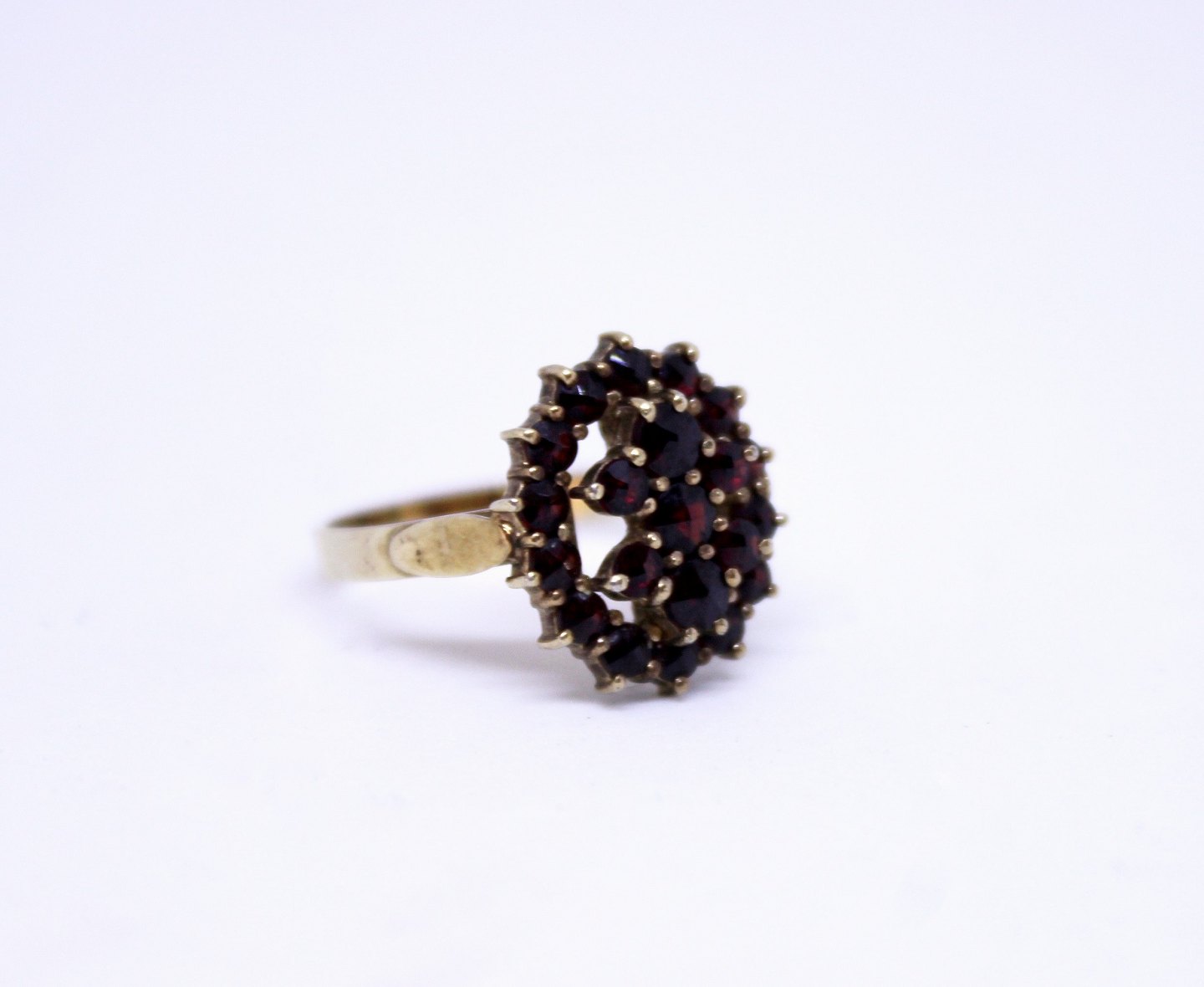 Ring af forgyldt 830 sølv dekoreret med granater og stemplet AP.