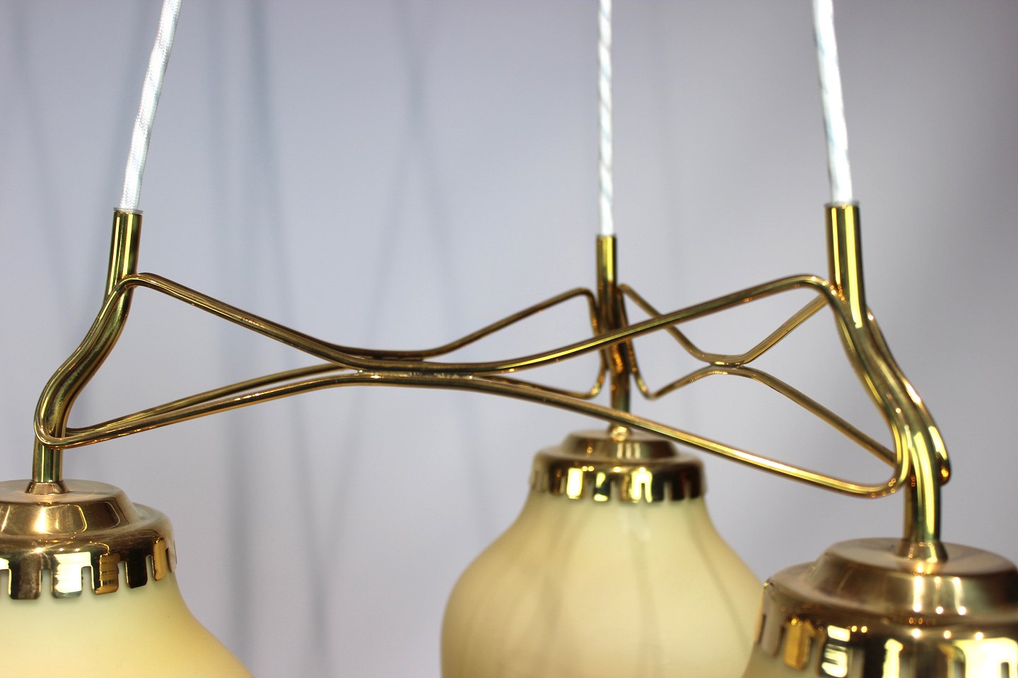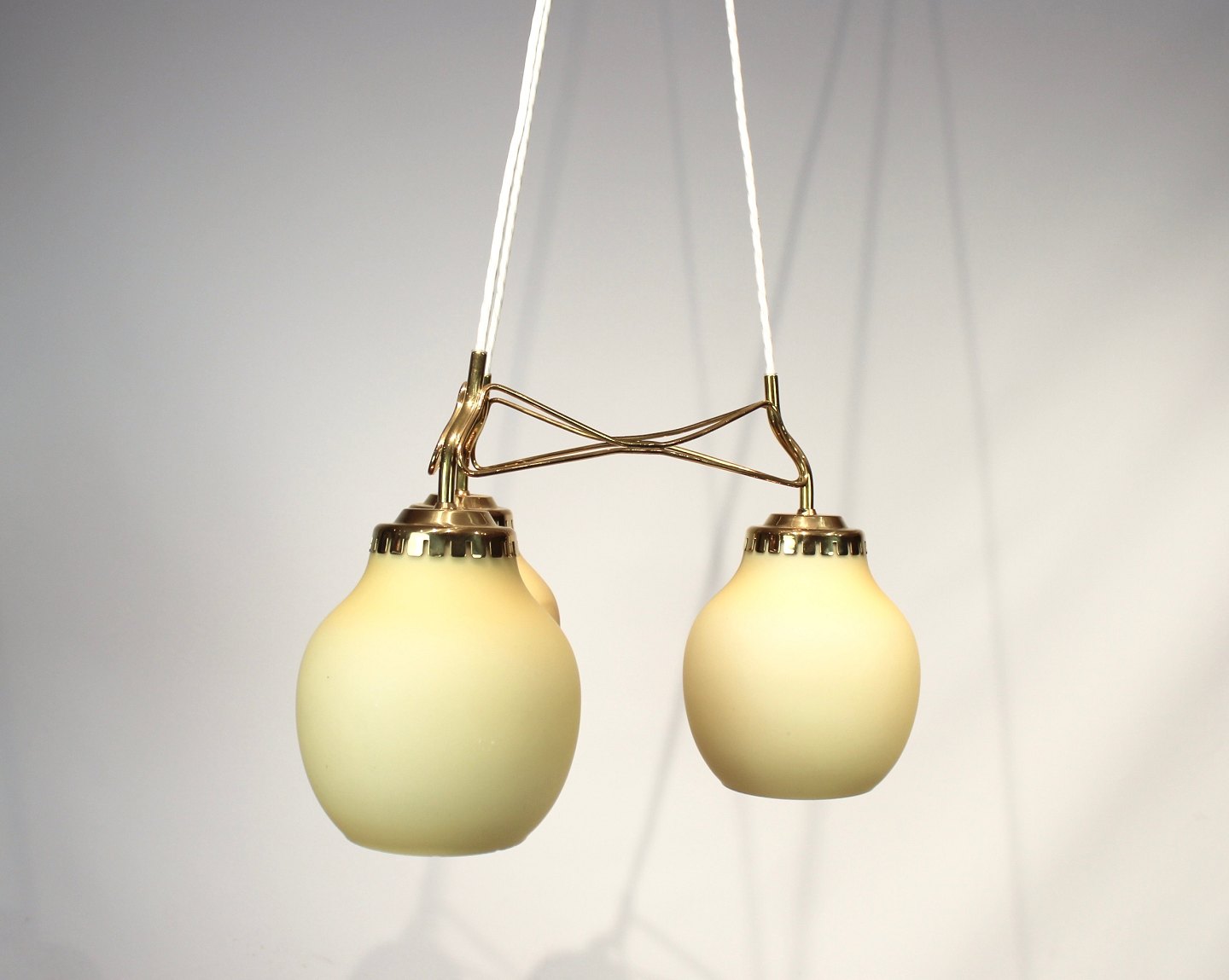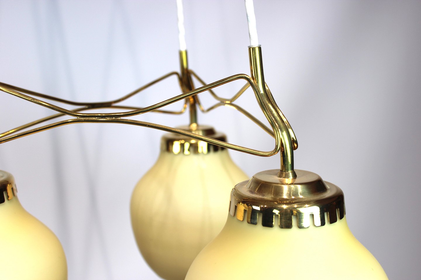 SoldA pair of ceiling pendants of brass and light yellow shades by Vilhelm Lauritzen from the 1960s. The pendants are in great vintage condition.