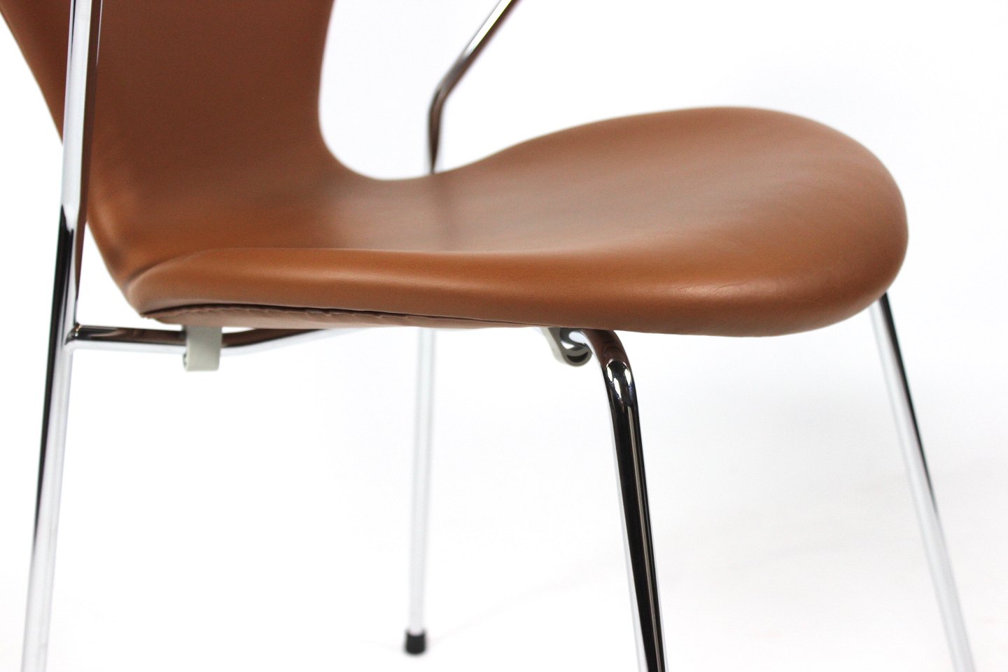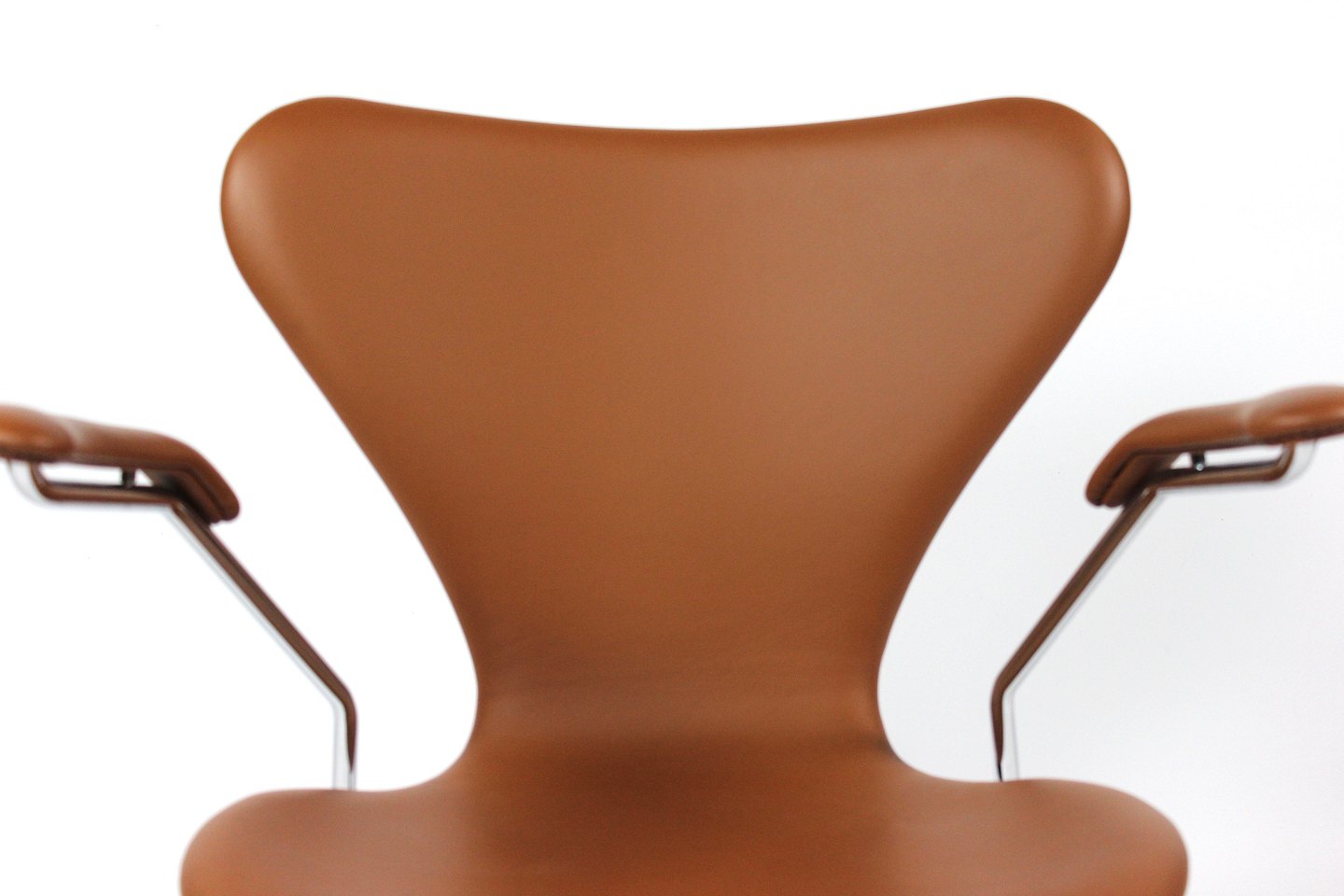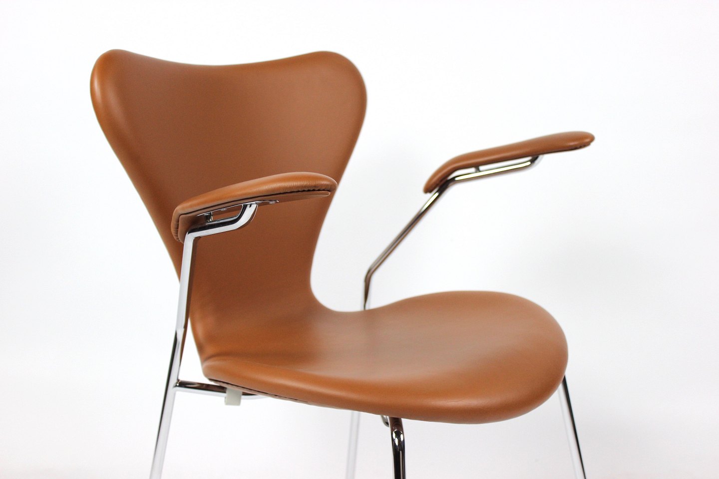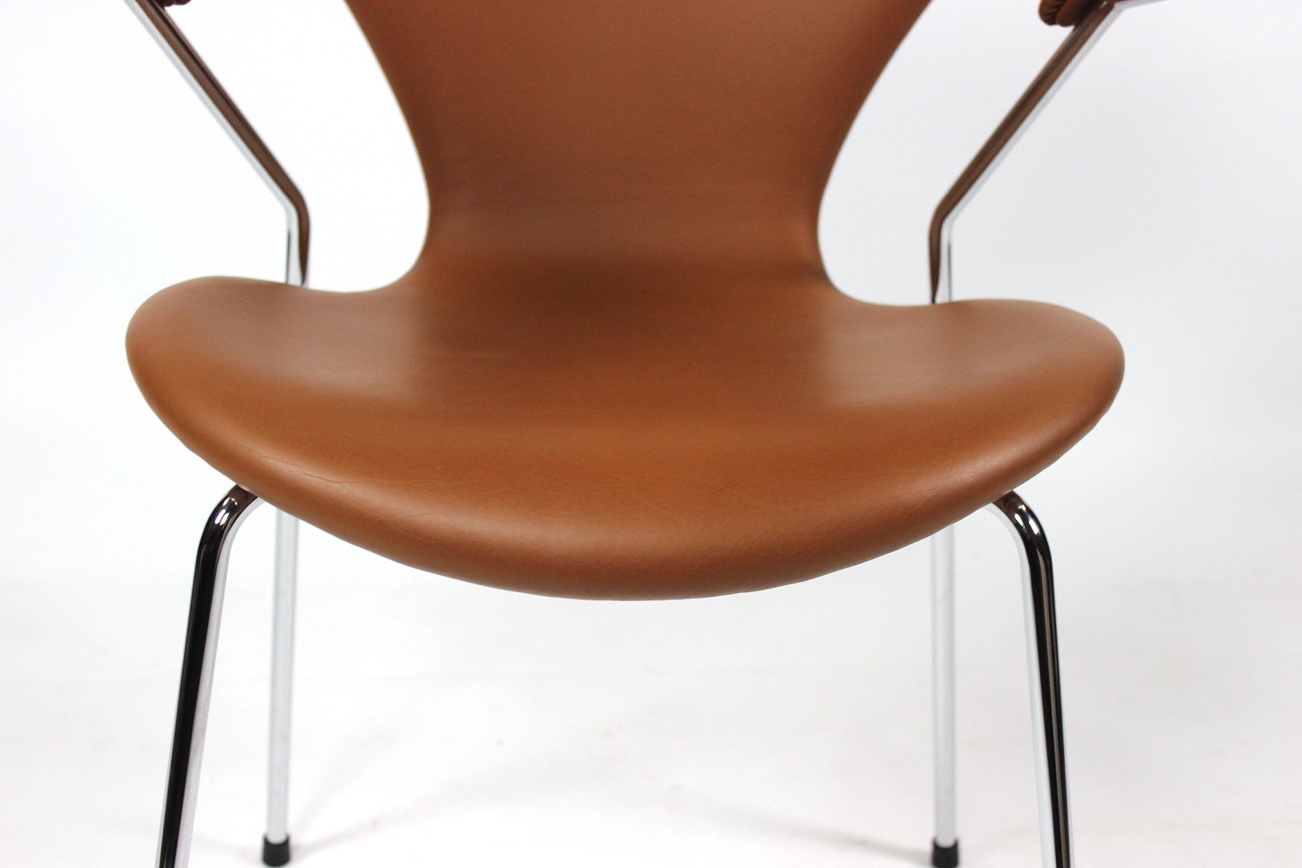 Et sæt af syver stole - Model 3207 - Armlæn - cognac farvet læder - Arne Jacobsen - Fritz Hansen