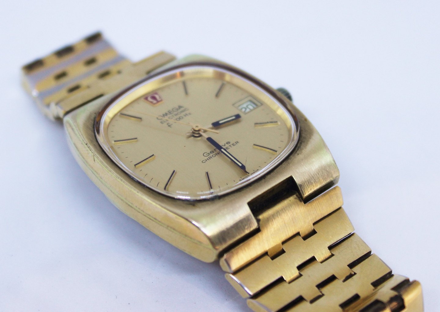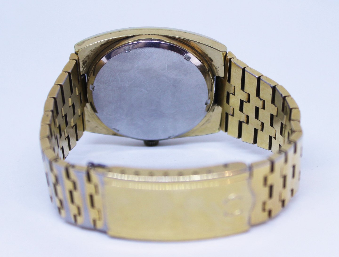 Omega Electronic F300HZ gilded stainless steel men's wristwatch, 1232/219. The watch is with chronometer and date. The watch is mecanic and from the beginning of the 1970s.