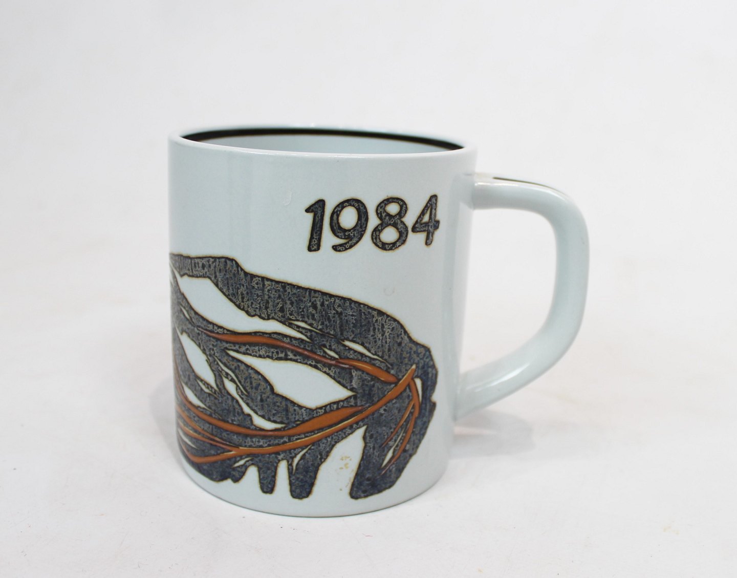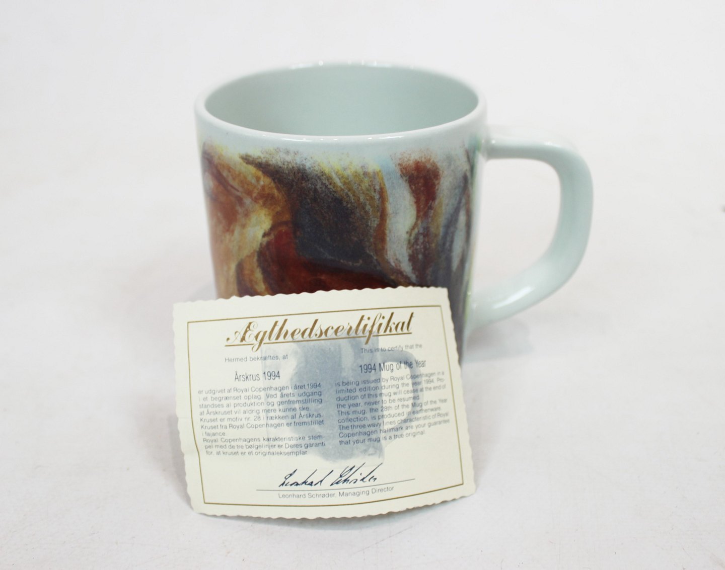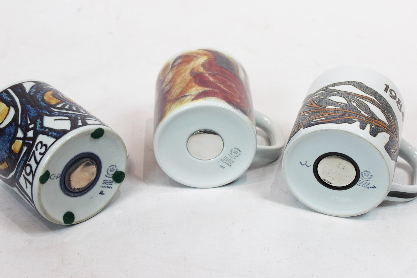 SoldAnnual mugs by Royal Copenhagen from 1973 by Gerd Hjort Petersen (150 DKK), 1984 by Ivan Weiss (150 DKK) and 1994 by Bodil Kaalund (350 DKK).