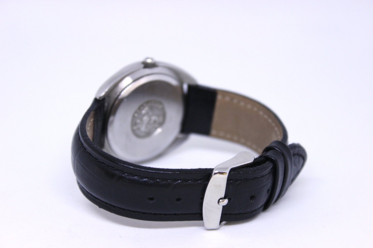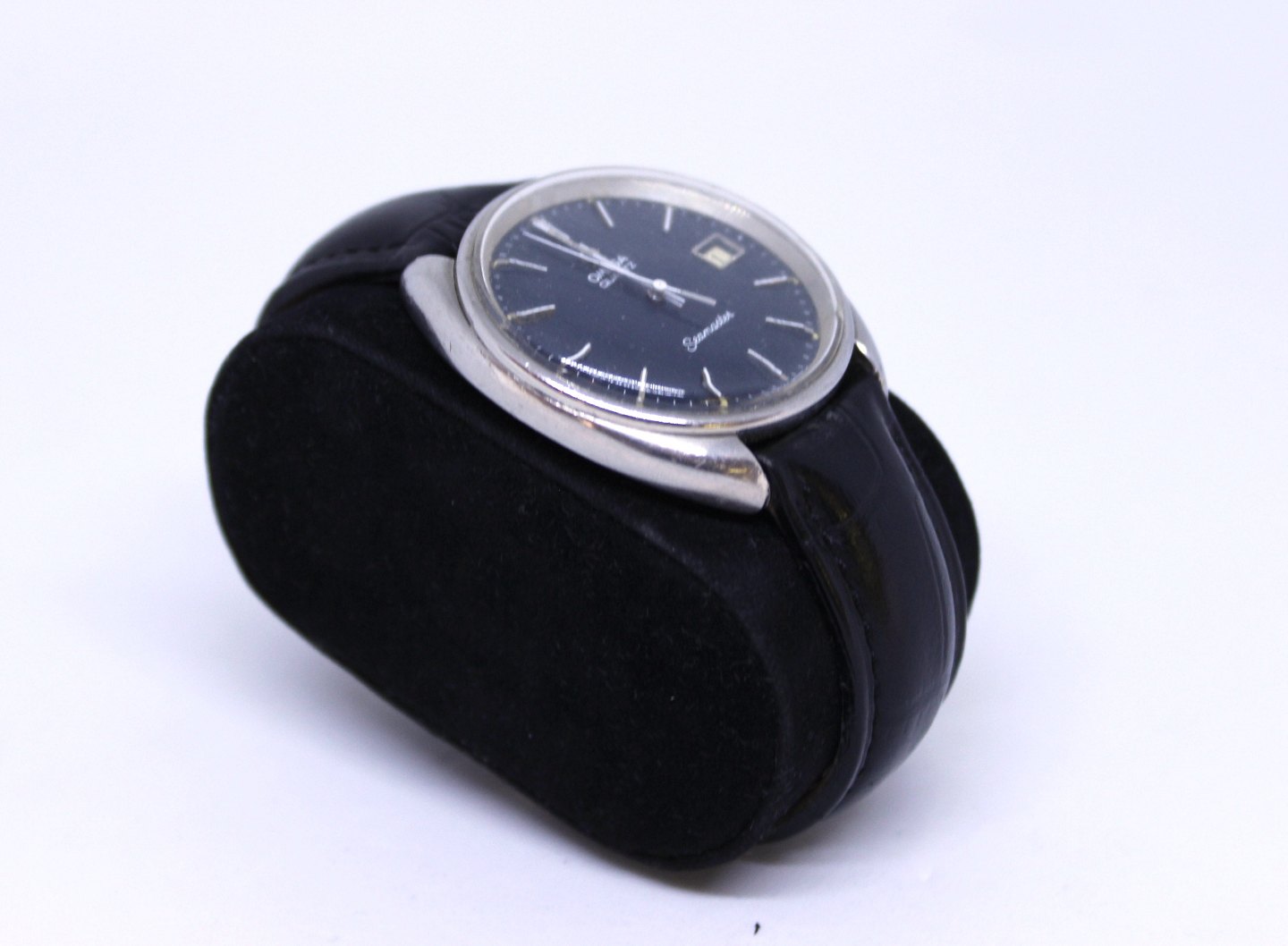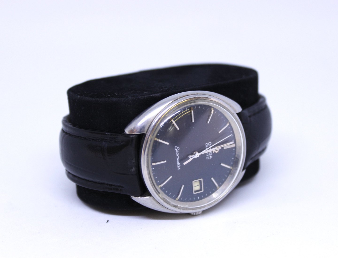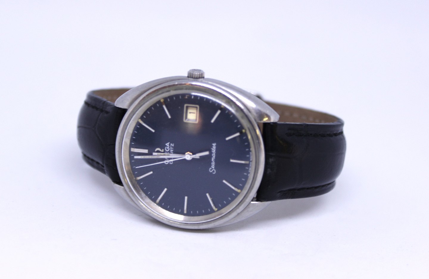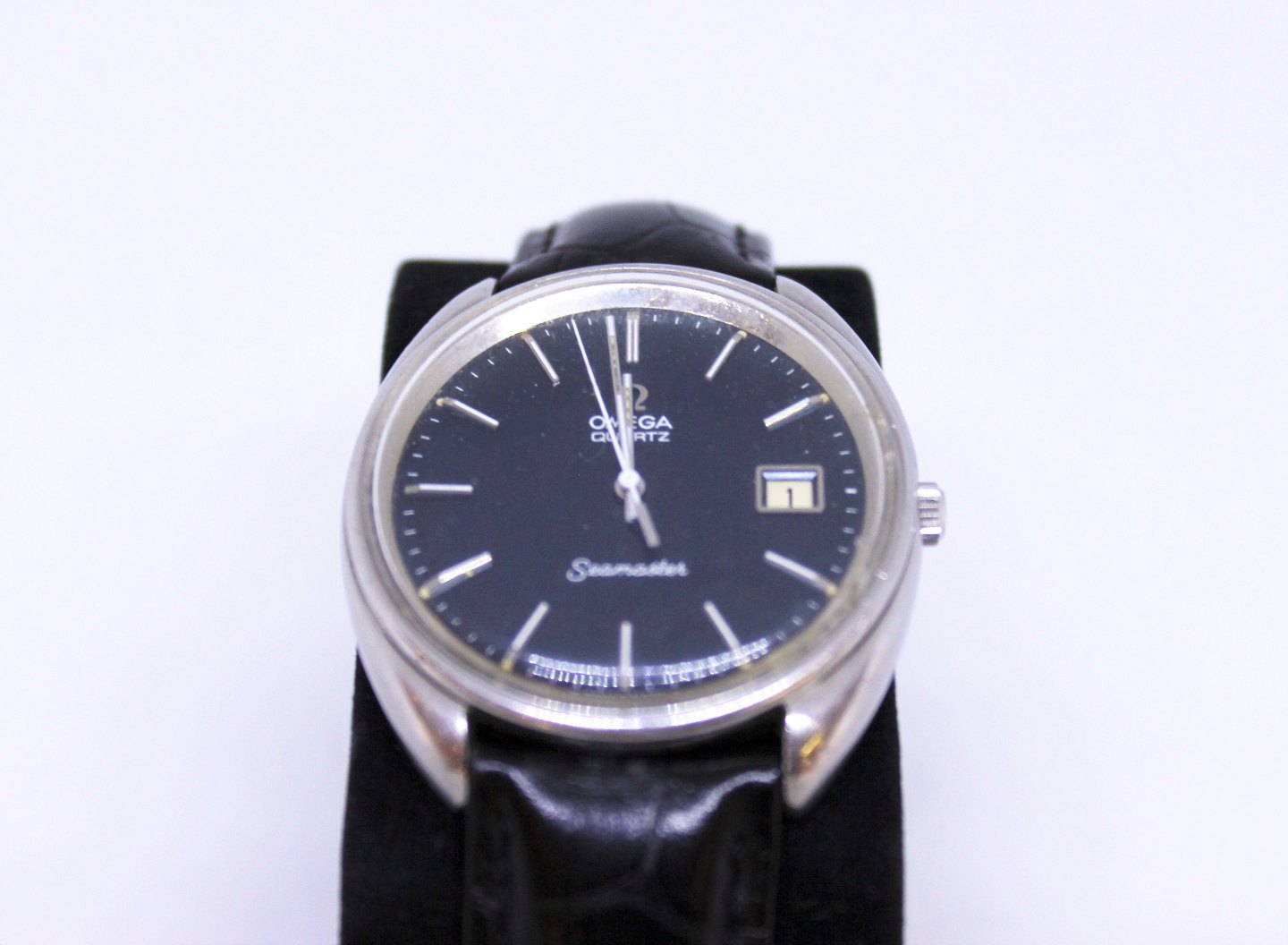 SoldOmega Quartz Seamaster wrist watch, swiss made and with date. The watch is with a black leather strap and in great condition.