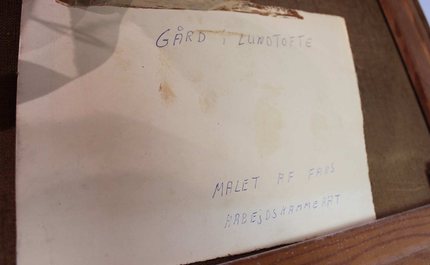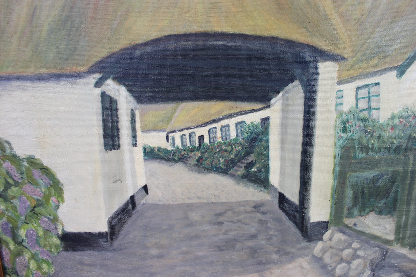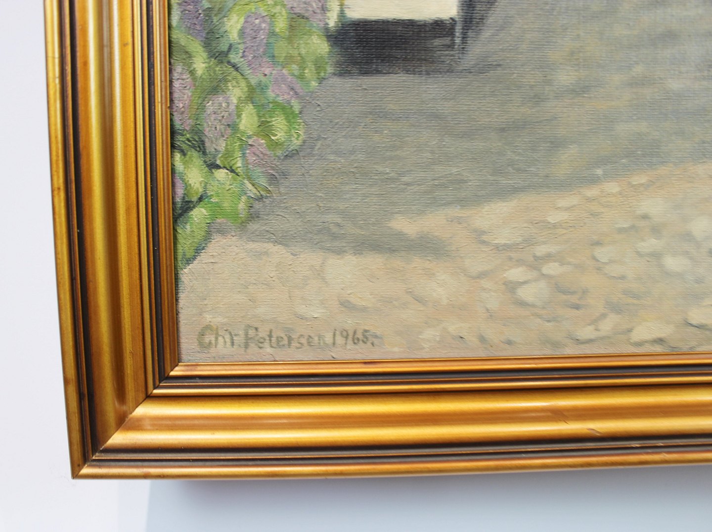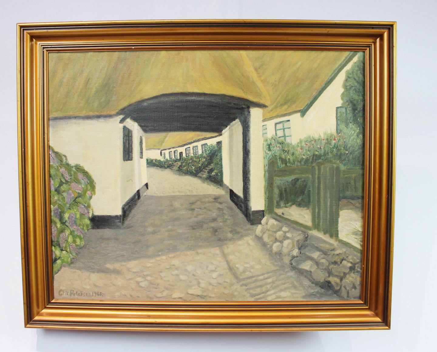 Maleri af gård signeret af Chr. Petersen i 1965, billedet af den rigtige gård hører med.