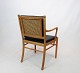 Vi køberDenne armstol, model PJ-301, er designet af den anerkendte danske møbeldesigner Ole Wanscher og fremstillet af PJ Møbler i 1960'erne. Stolen er udført i kirsebærtræ, hvilket giver den en varm og elegant fremtoning. Hynderne er betrukket med sort læder, der tilføjer et moderne og sofistikeret touch.