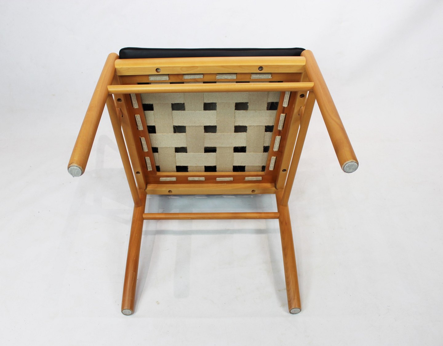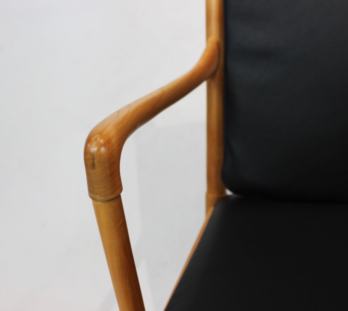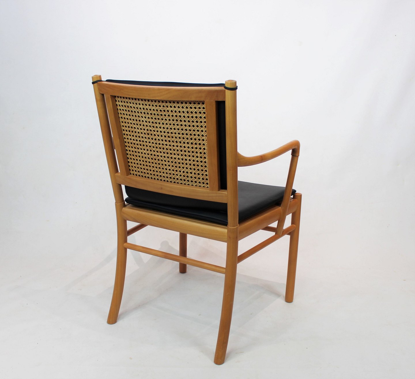 Ole Wanscher er kendt for sin evne til at kombinere klassisk elegance med funktionel enkelhed, og model PJ-301 er ingen undtagelse. Stolen har en tidløs æstetik med rene linjer og en behagelig siddekomfort, der gør den velegnet til både stuer og kontorer. Kirsebærtræets rige farve og fine åremønstre komplementerer det sorte læder perfekt, hvilket resulterer i en harmonisk og stilfuld stol.