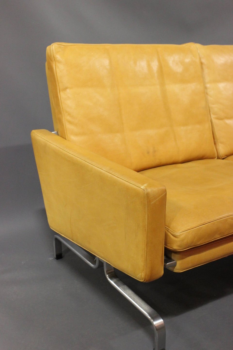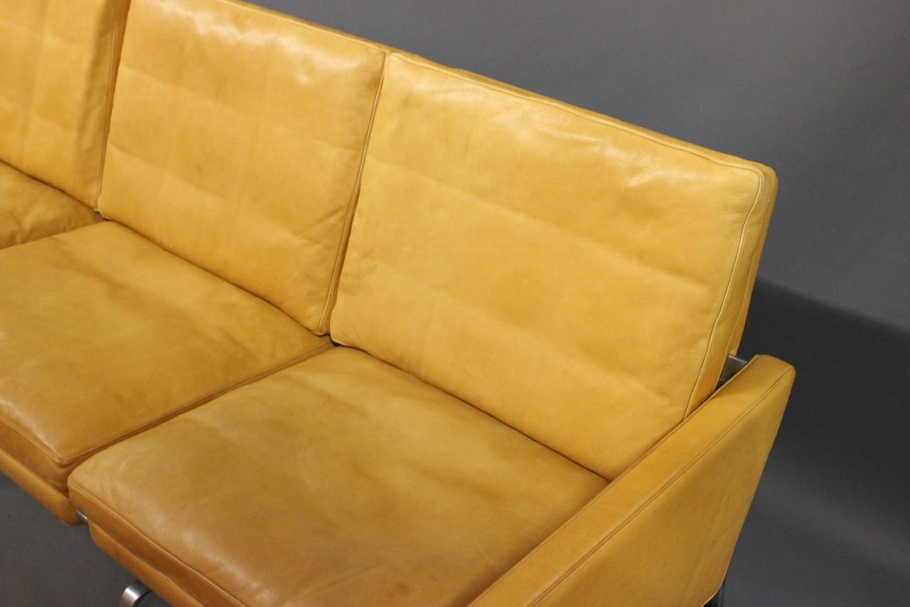 With legs made of aluminum and a seat cushion upholstered in the finest yellow leather of the absolute best quality, the PK31/3 sofa unites innovation and luxury in a sublime way. The combination of materials creates a contrasting and inviting aesthetic that adds a touch of elegance to any room.
