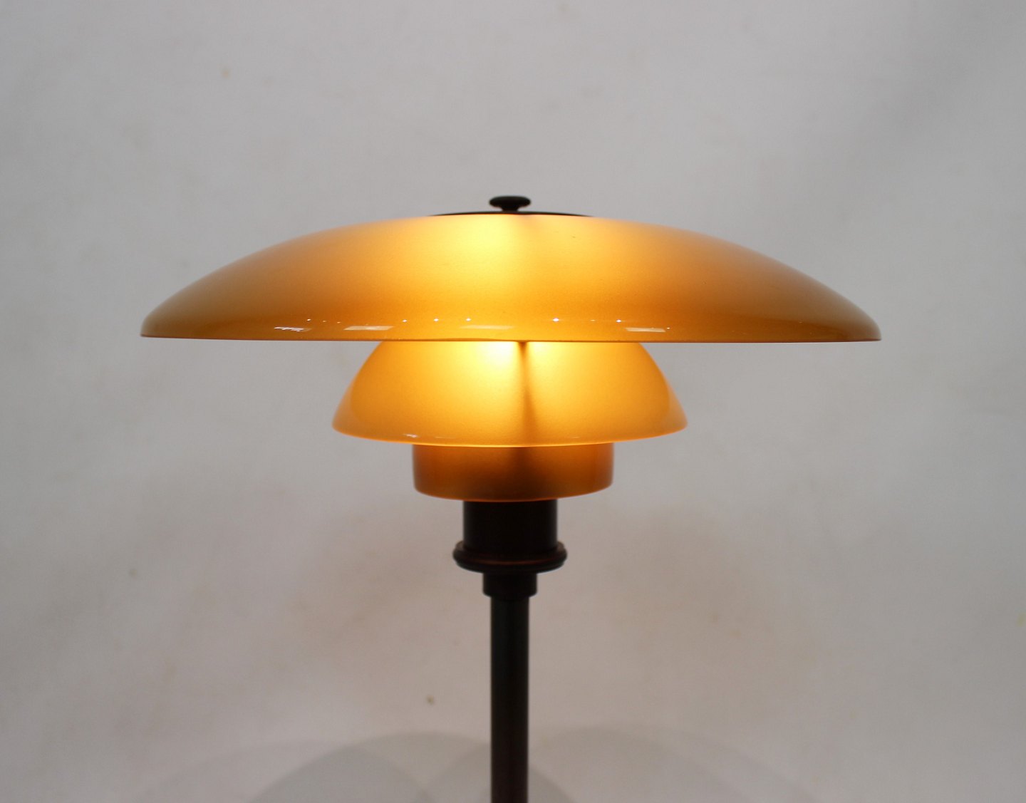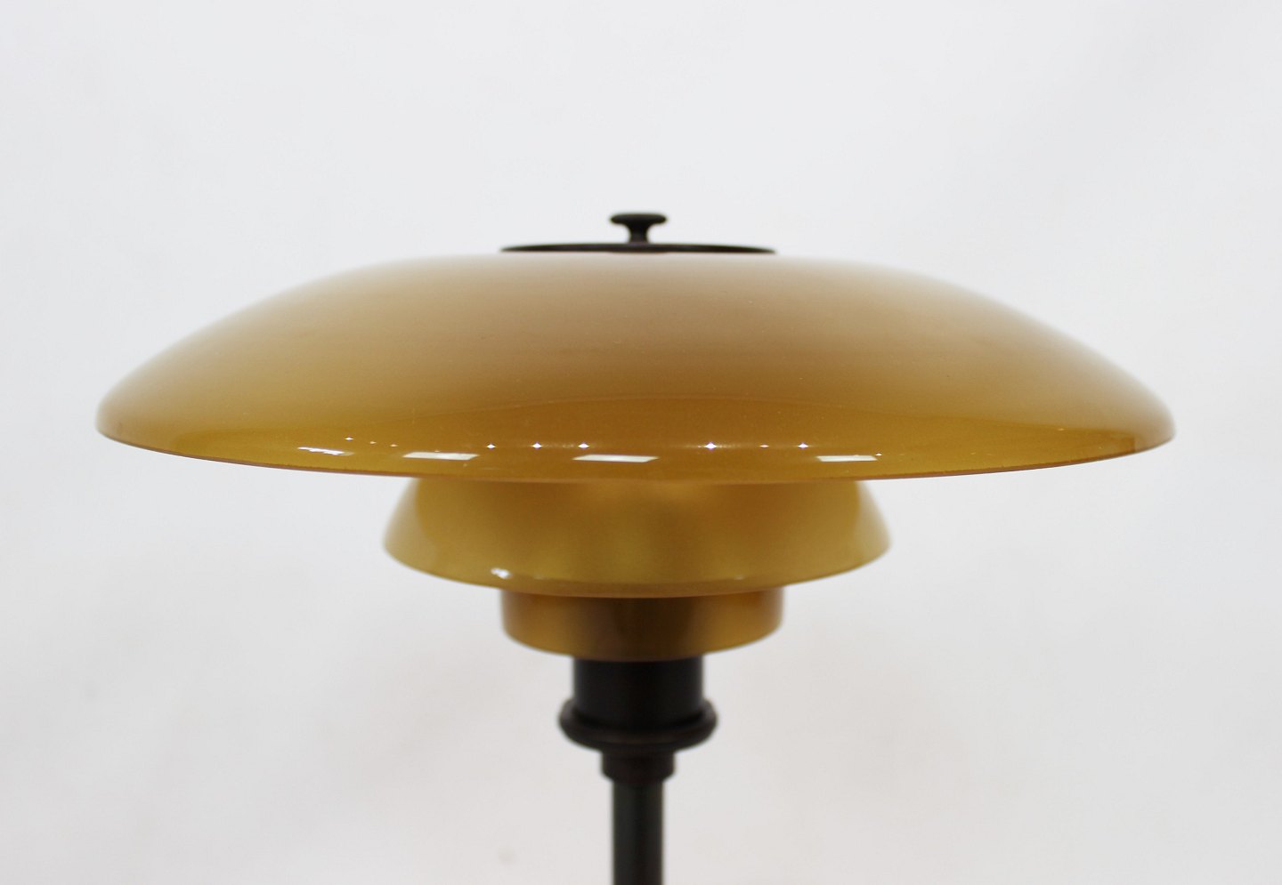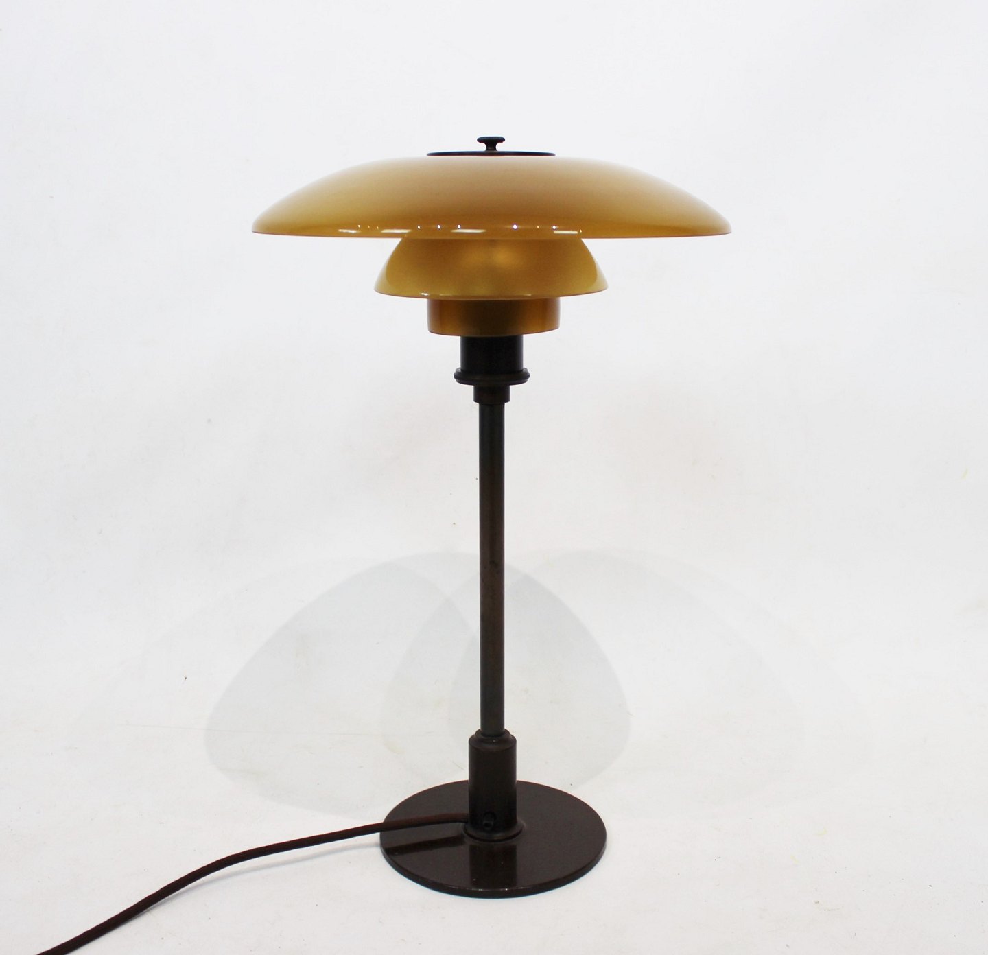 PH 3/2 tablelamp with shades of amber colored glass and frame of burnished brass, designed by Poul Henningsen and manufactured by Louis Poulsen, 1930s.