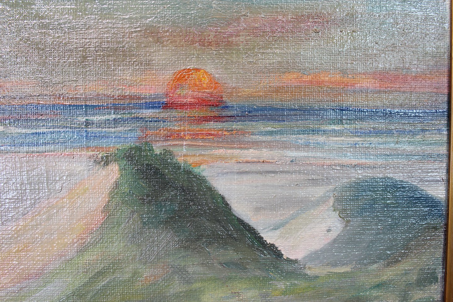 Maleri med motiv af solnedgang og med guld ramme signeret H. Ellemann. Maleriet er i flor brugt stand.