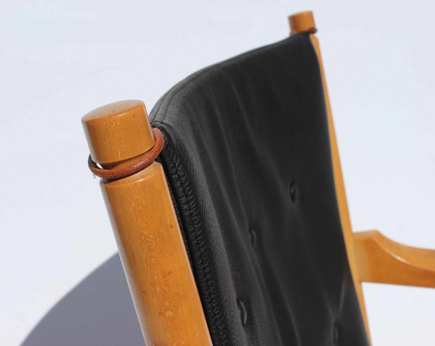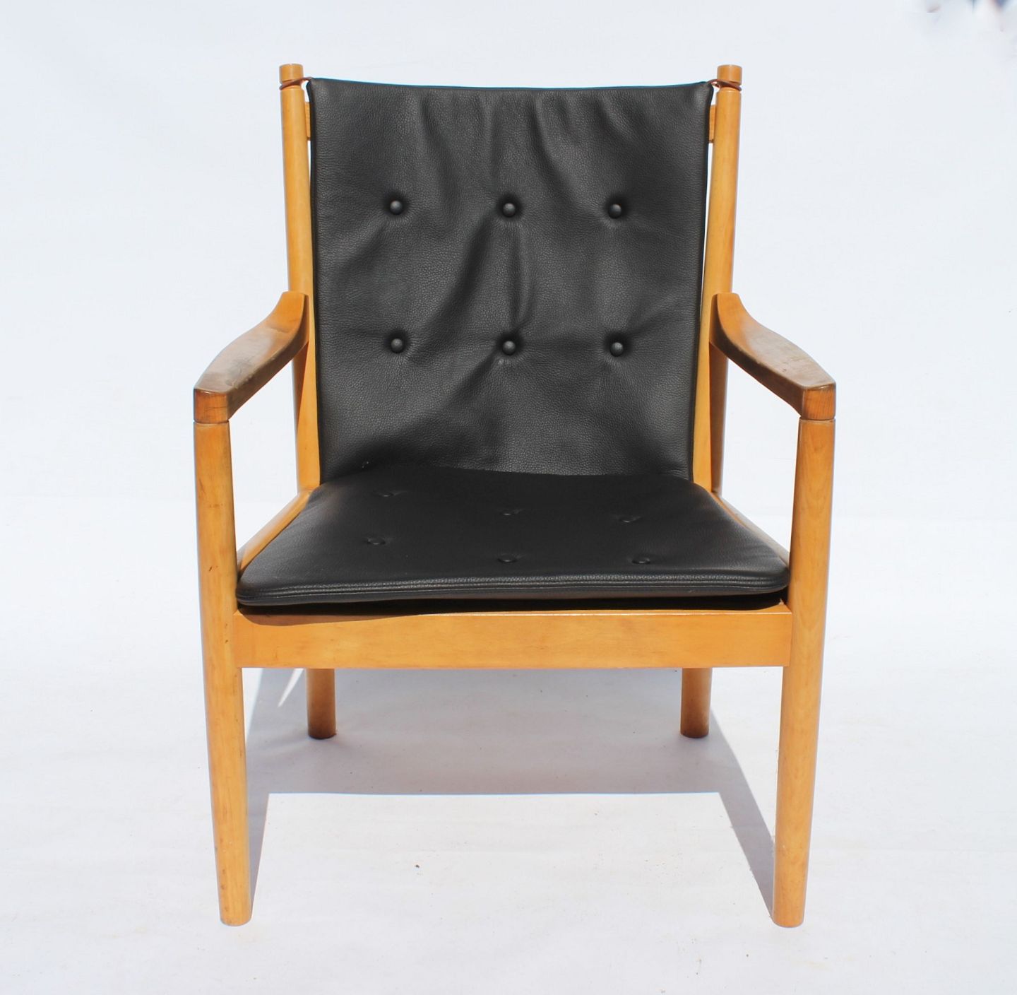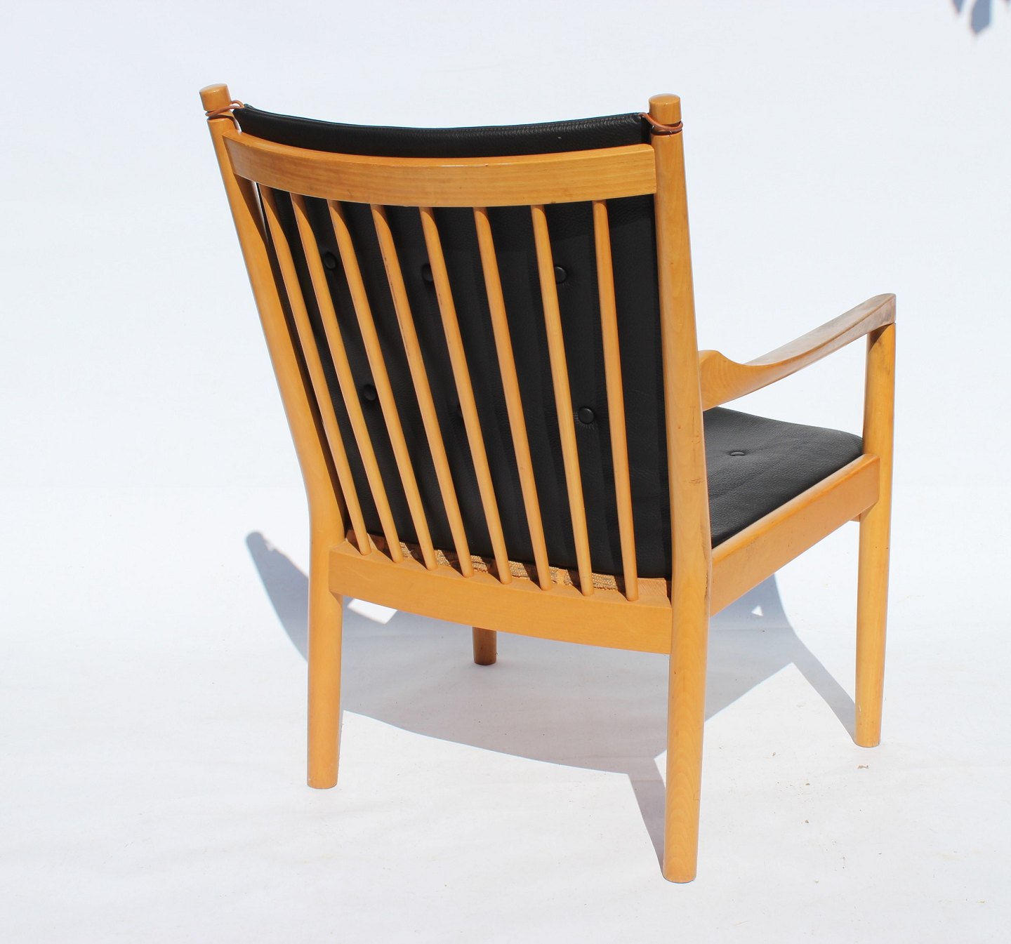 The armchair, known as model 1788, is an elegant piece of furniture with an iconic wooden back in beech wood and cushions upholstered in black leather. Designed by the renowned Danish architect and furniture designer Hans J. Wegner in 1978 and produced by Fritz Hansen, this chair combines aesthetics and functionality in a unique way.