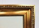 Oliemaleri i varme farver med motiv af marker og stråtækt hus med forgyldt ramme.