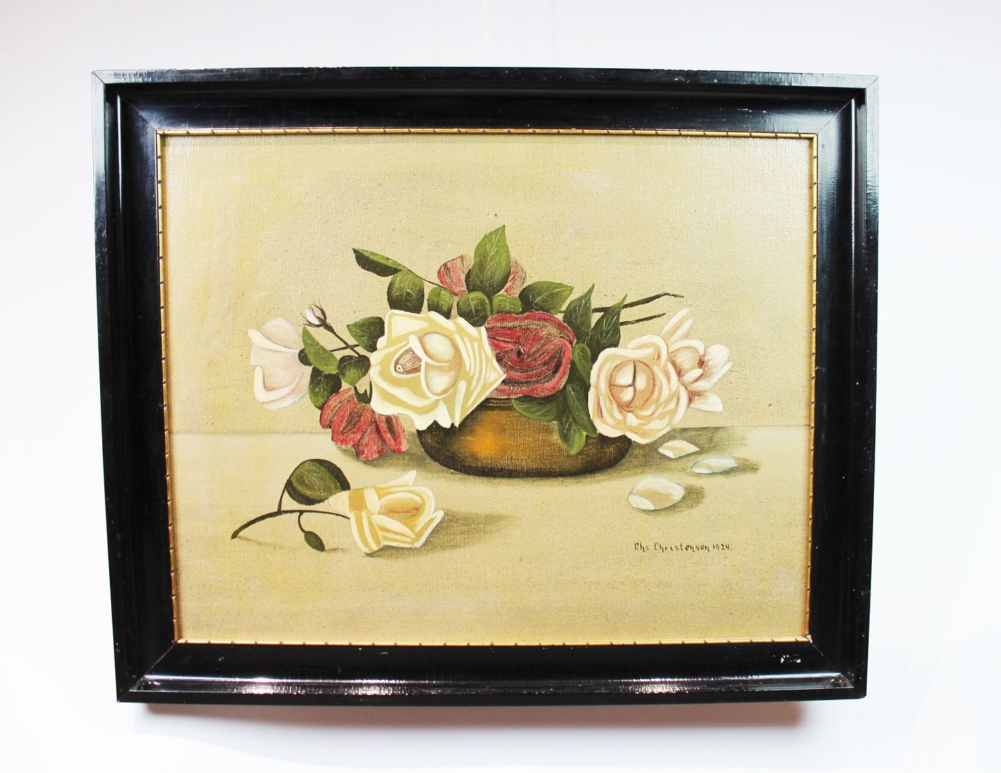 Oliemaleri med motiv af en buket roser signeret Chs. Christensen i 1924.