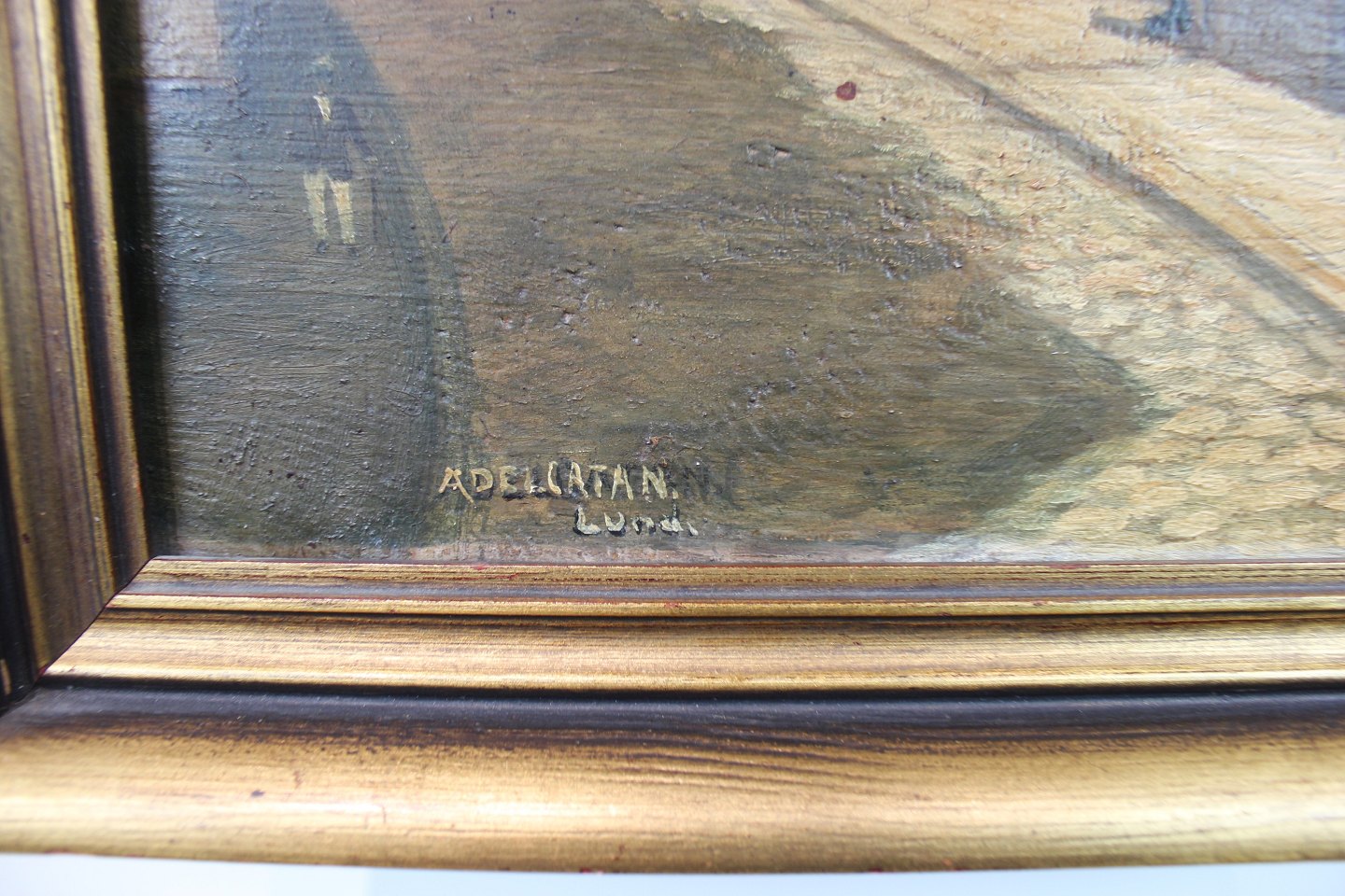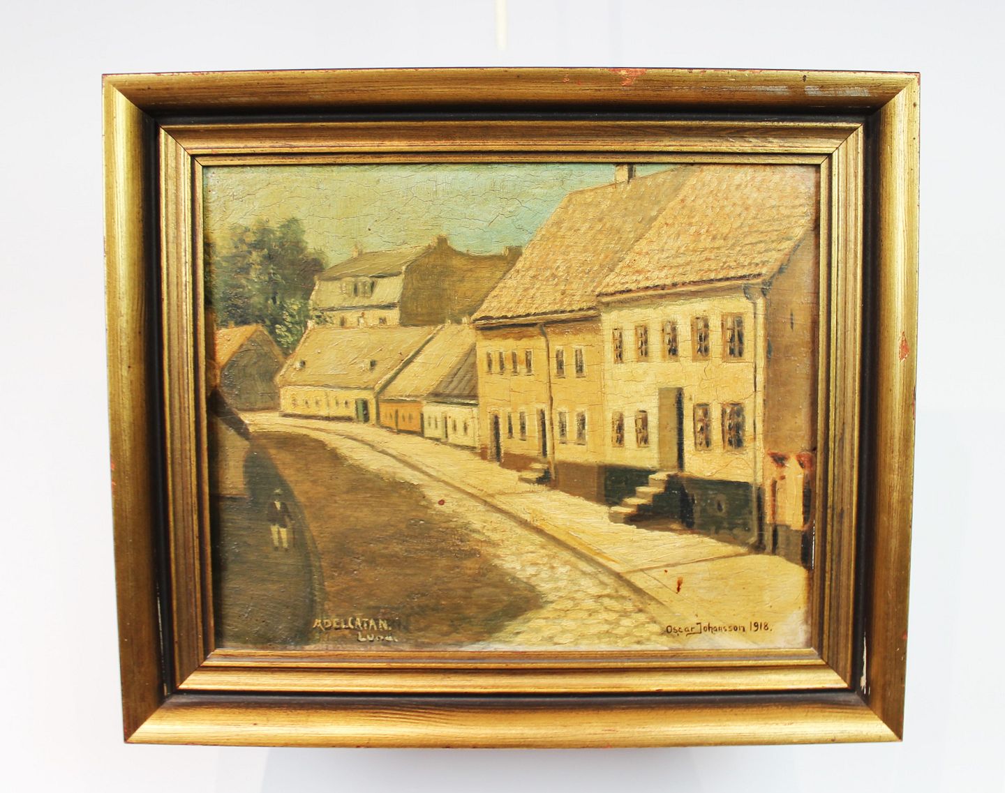 SoldOil painting with motif of a village signed by Oscar Johansson in 1918.