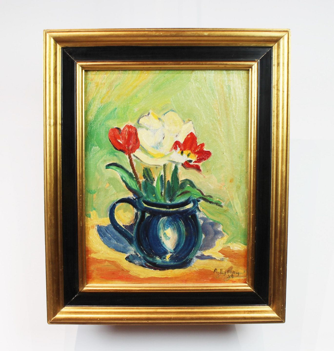 SoldOil painting with motif of a bouquet of flowers signed A. Ejsing in 1939.