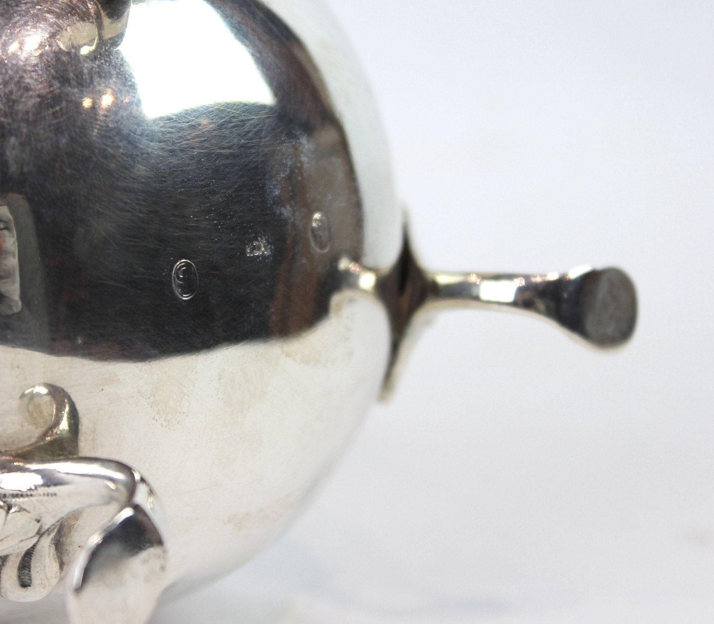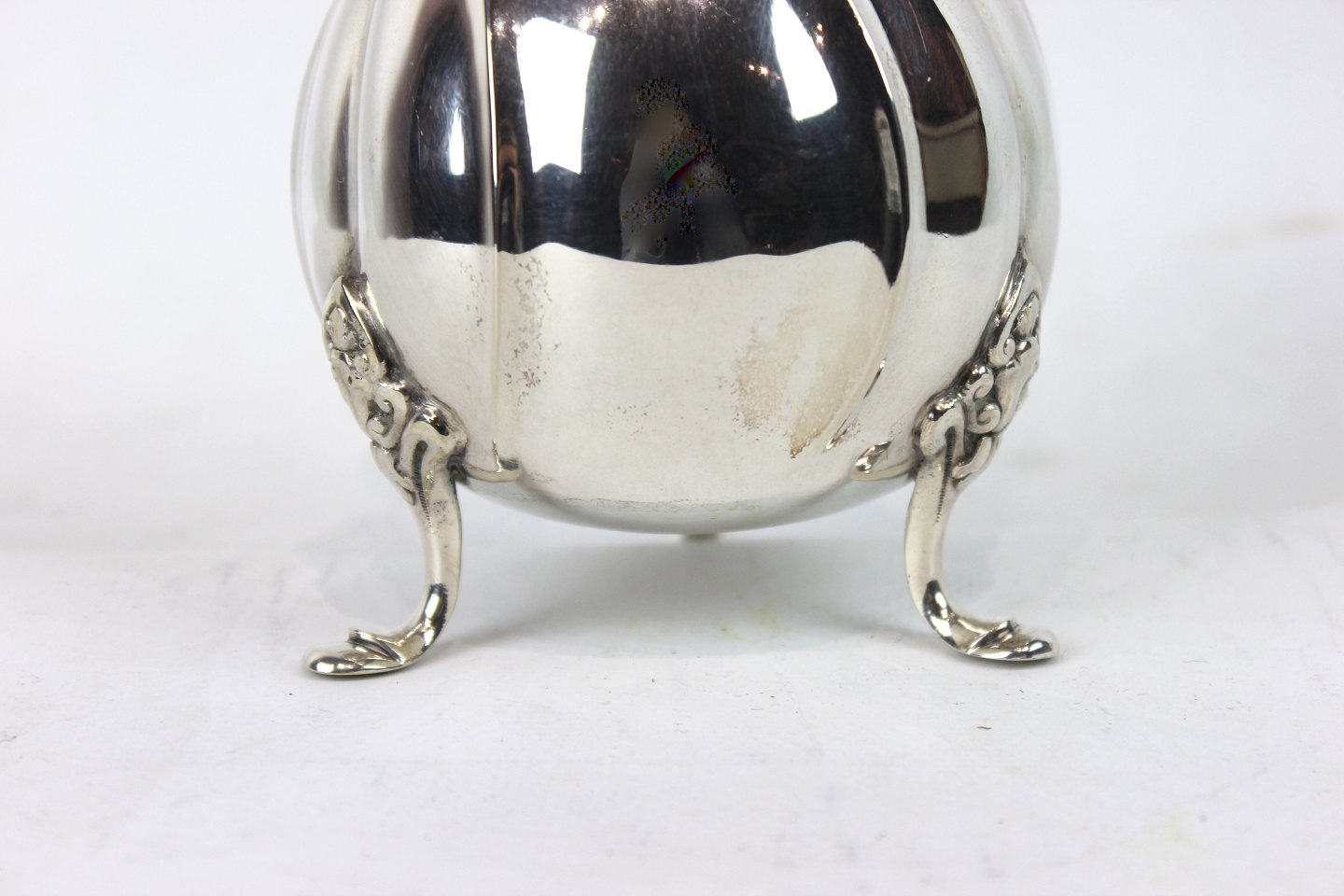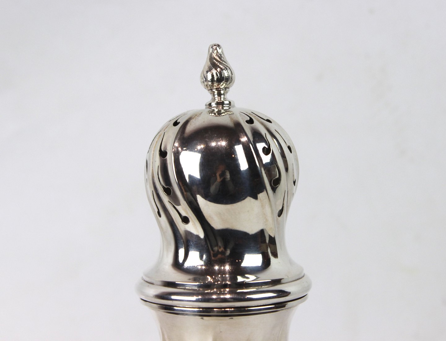 Sukkerstrødåse på tre fødder af tretårnet sølv.