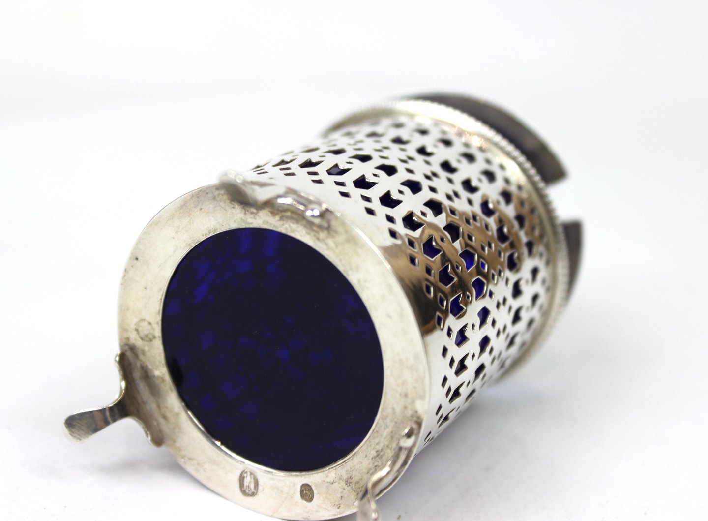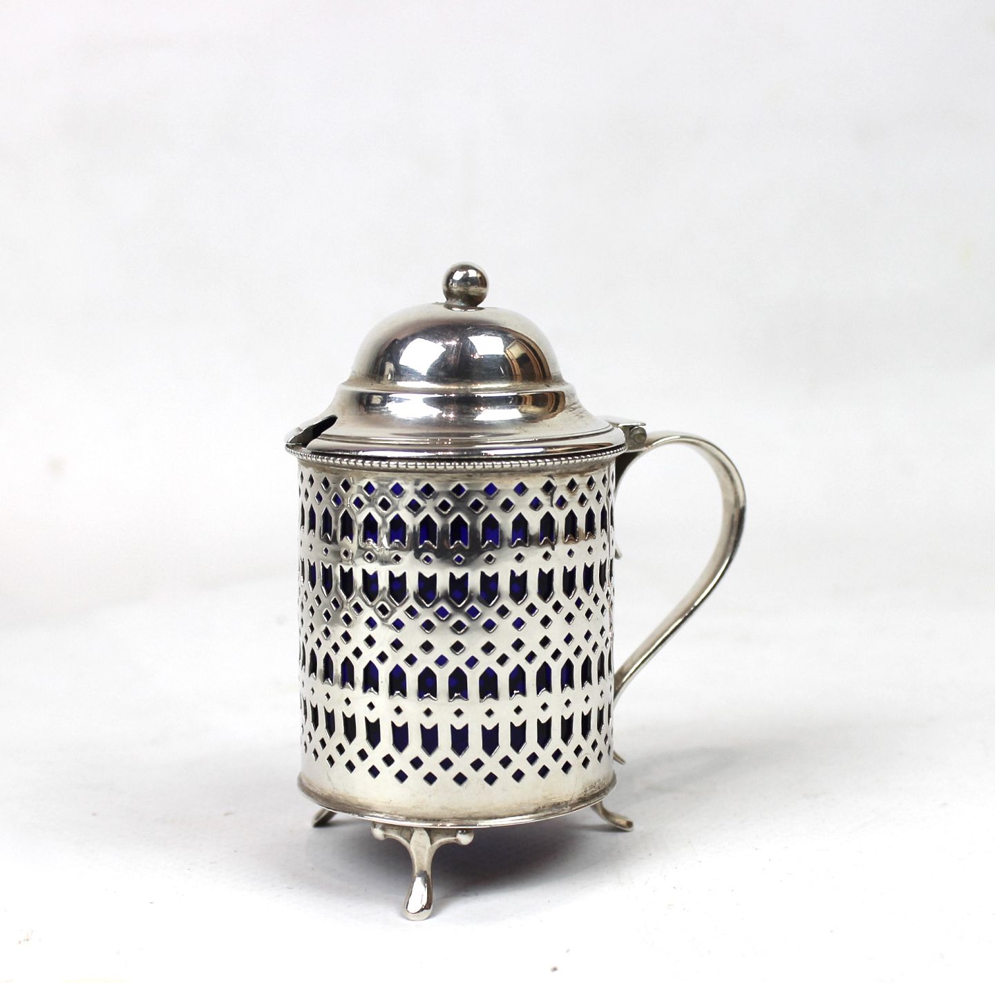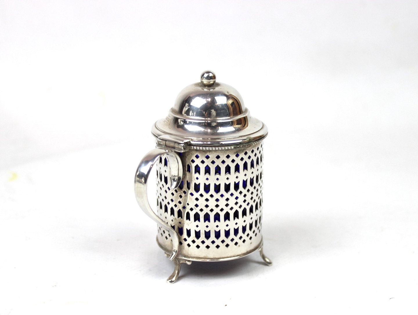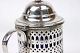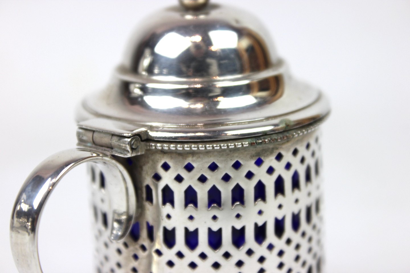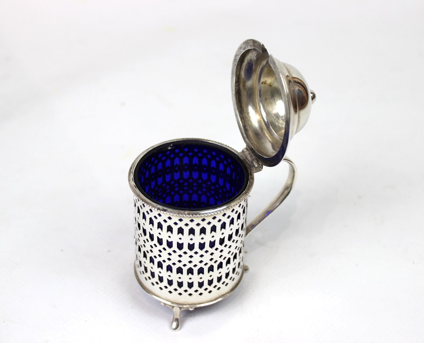 Sennepskrukke af tretårnet sølv med mørkeblåt opal glas indsats.