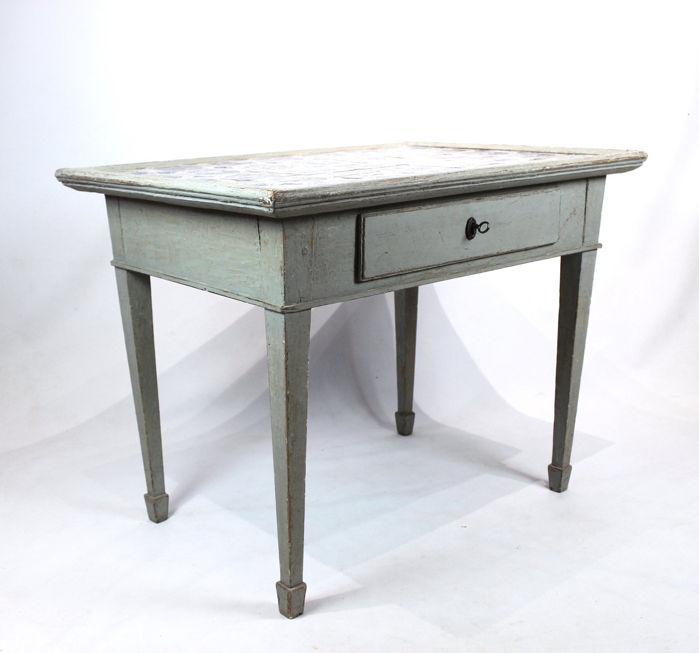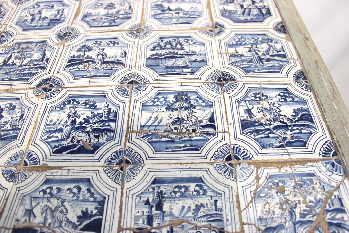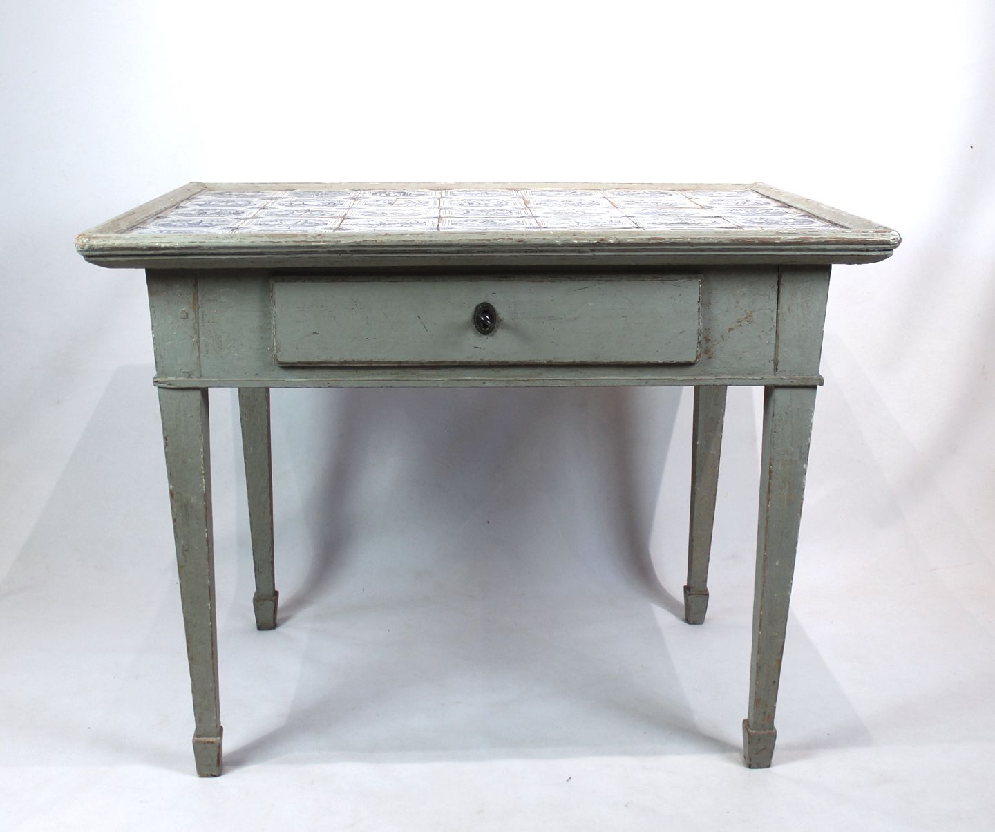 SoldGrey painted danish tile table from the 1780s with dutch tiles. The table is in great vintage condition.