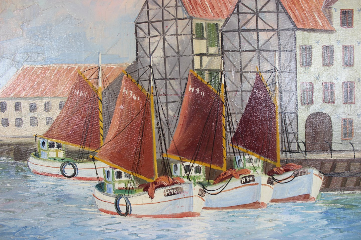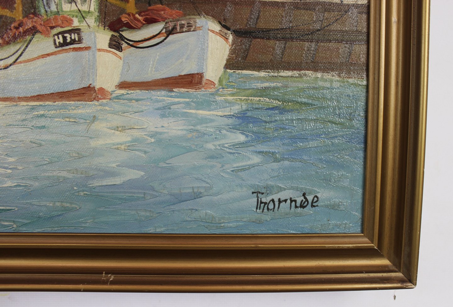 Oliemaleri med motiv af skibe og forgyldt ramme, signeret Thornøe.